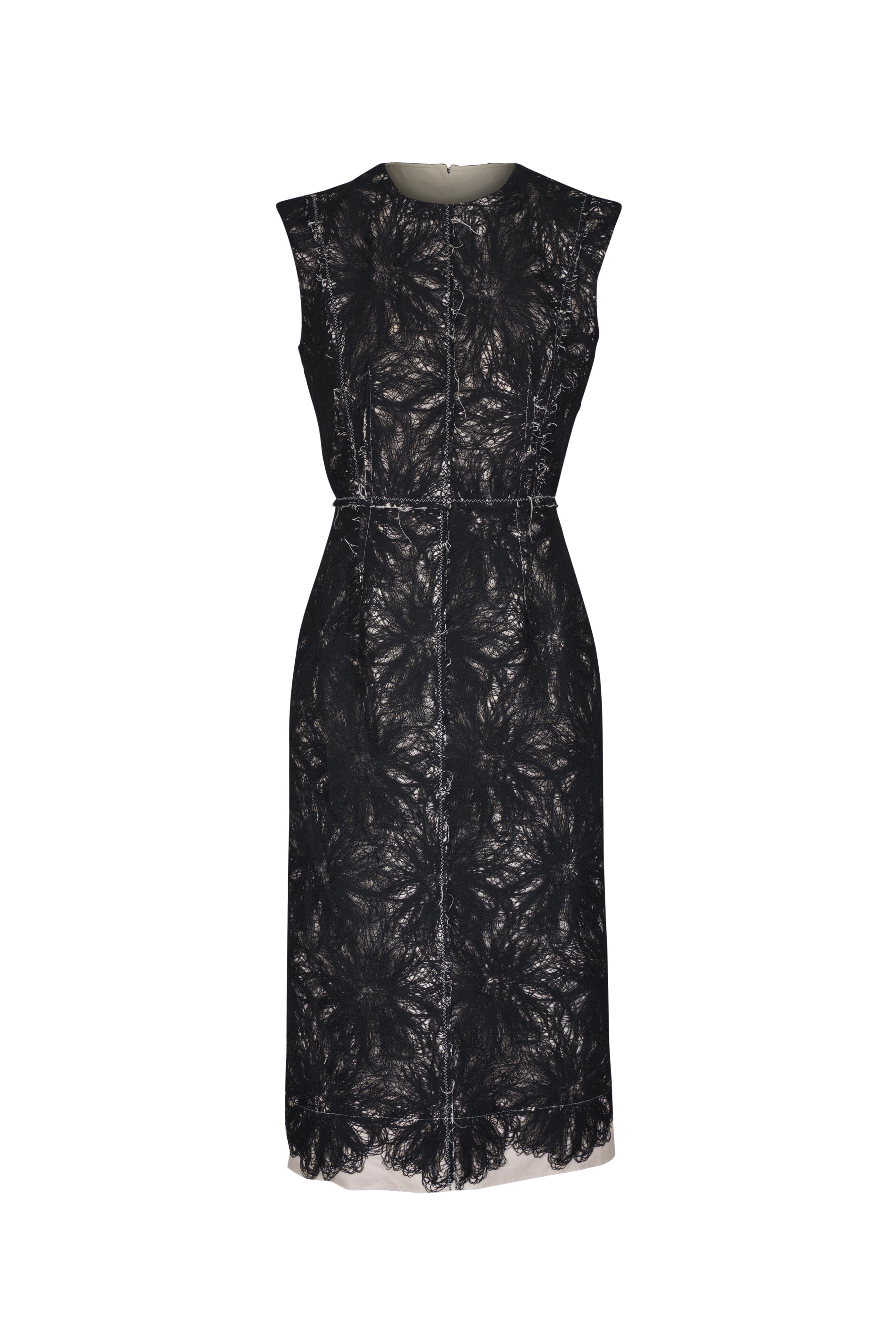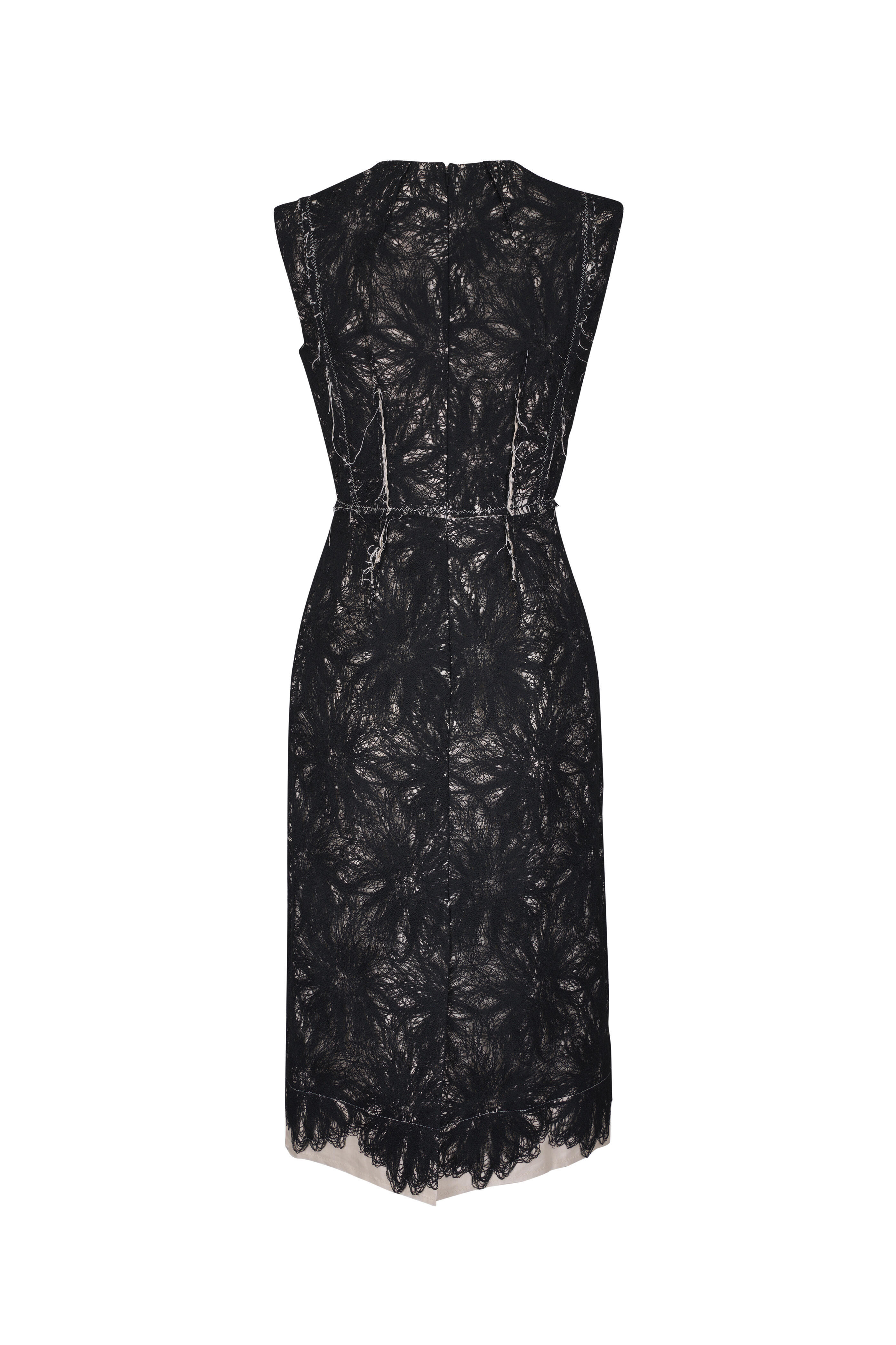 Round neckline. Concealed back zip; hook & eye closure. Scalloped hem. Imported. 90% nylon, 10% metallic yarn; Second fabric: 100% linen; Lining: 100% silk. Dry clean.
