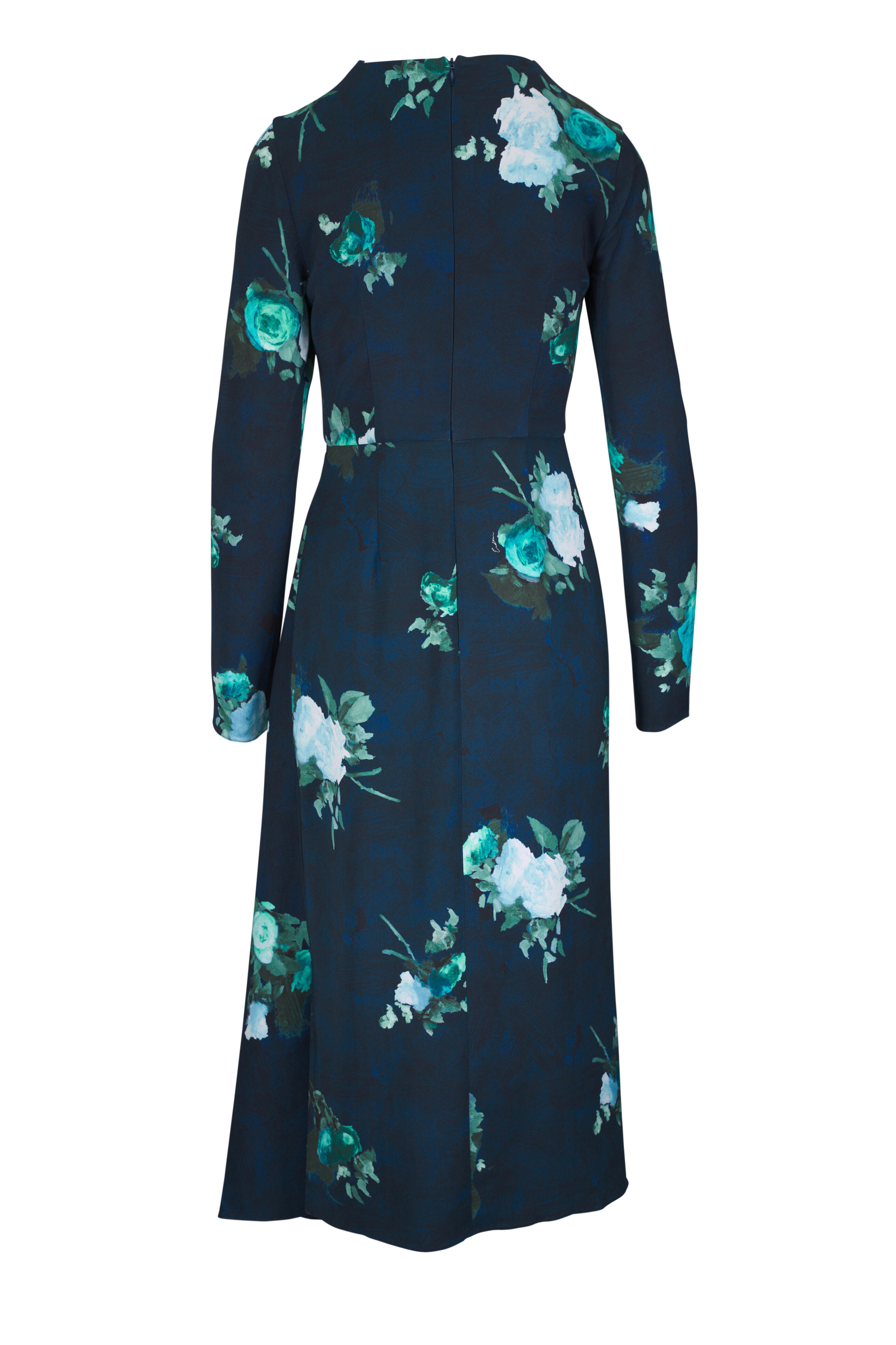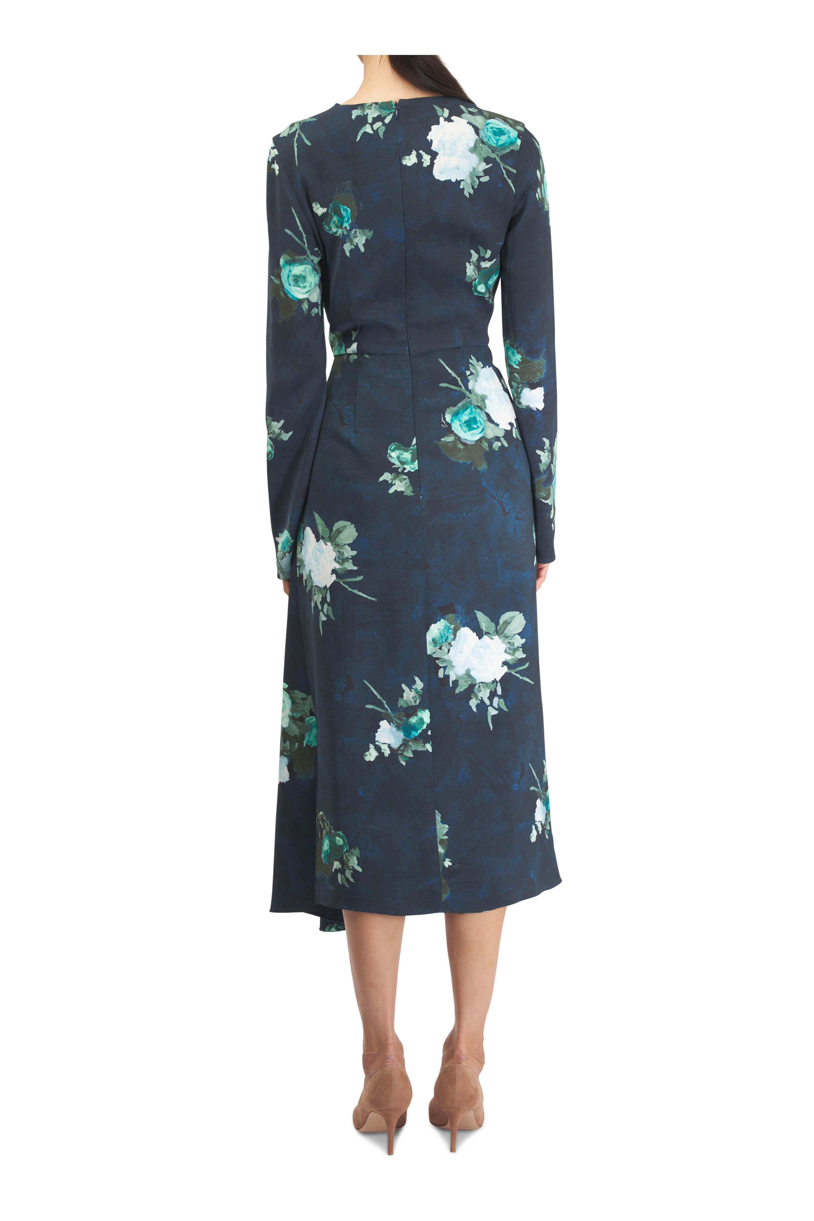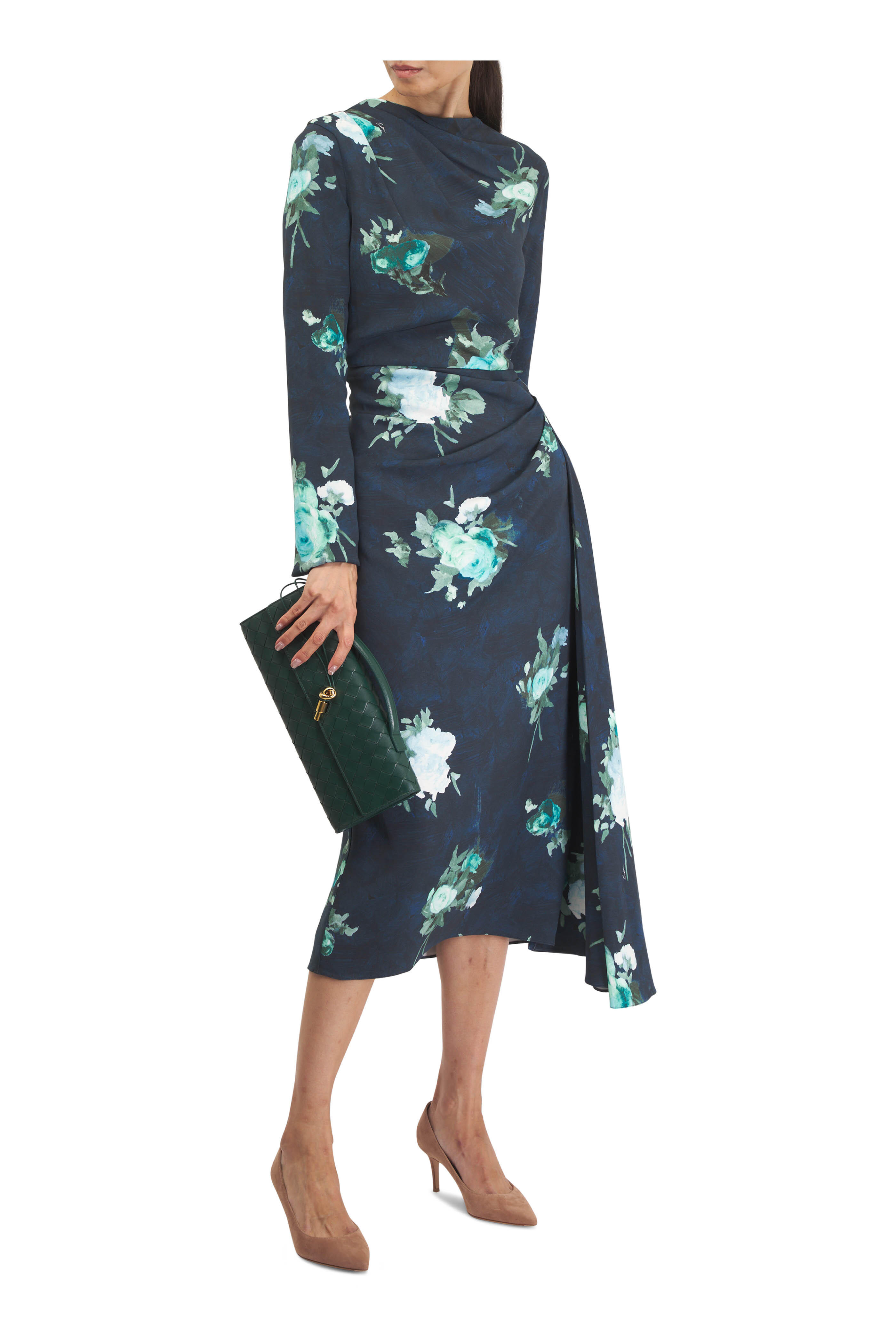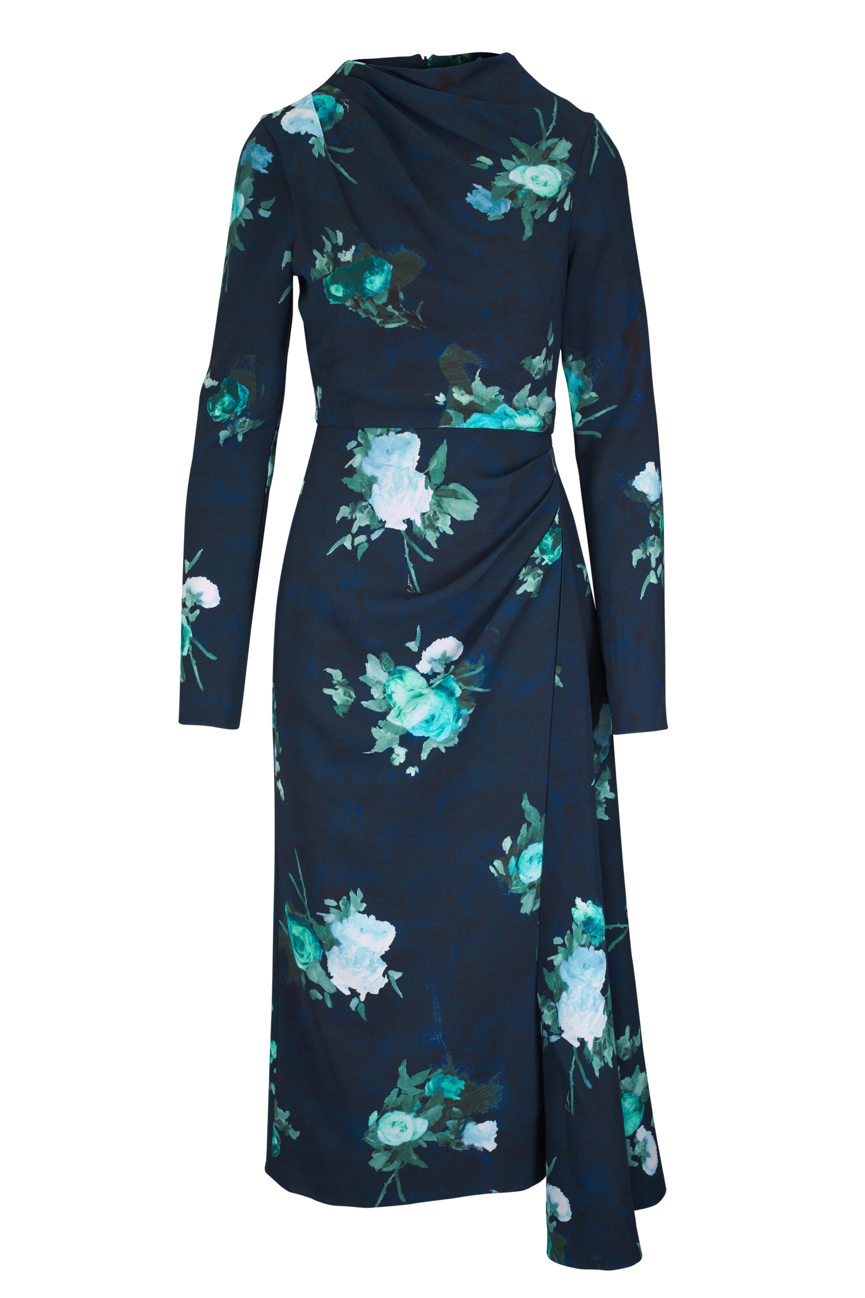 Draped crew neckline. Concealed back zip. Draped detail. Imported. 59" shoulder to hem. 97% viscose, 3% elastane; lined: 100% silk. Dry clean.