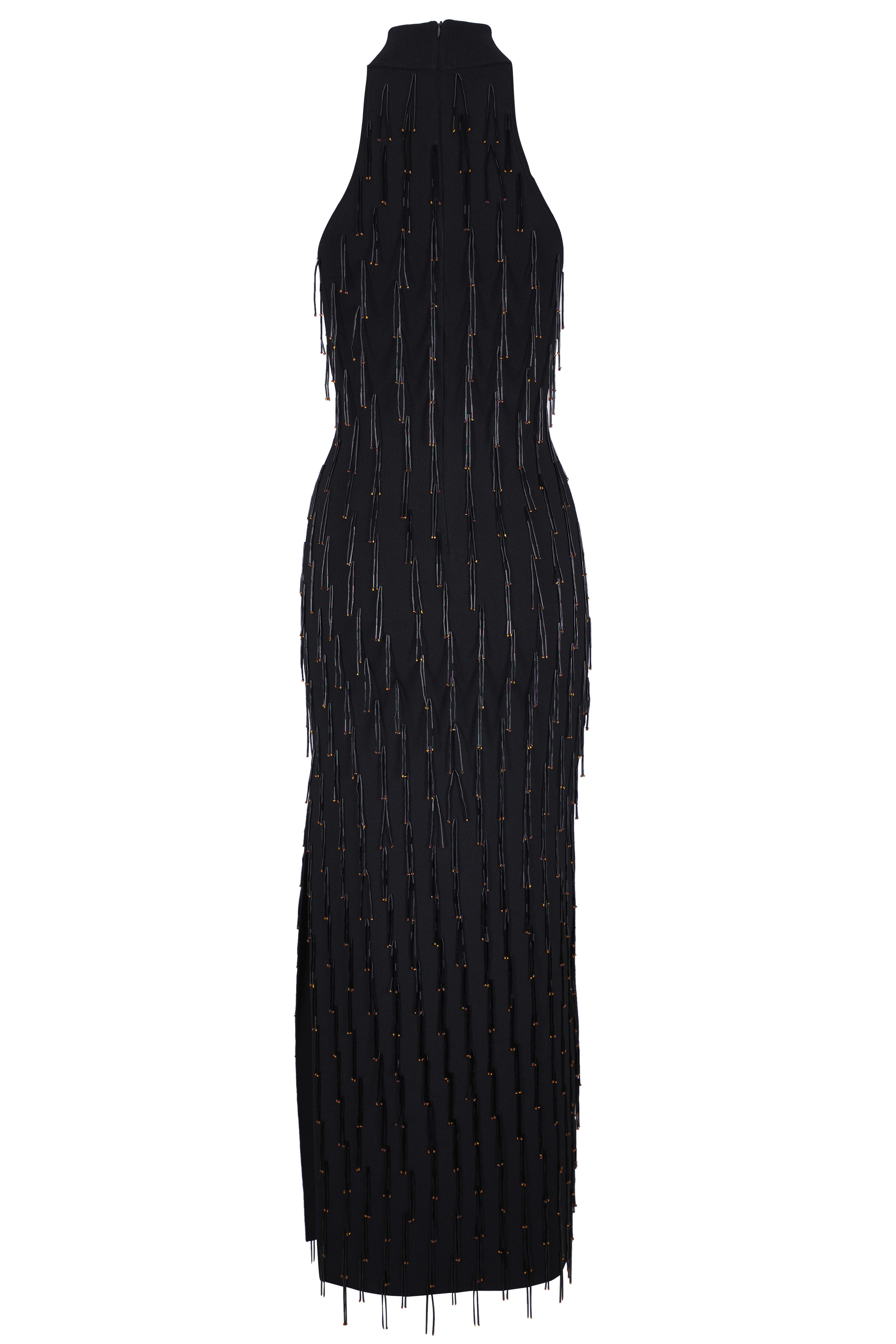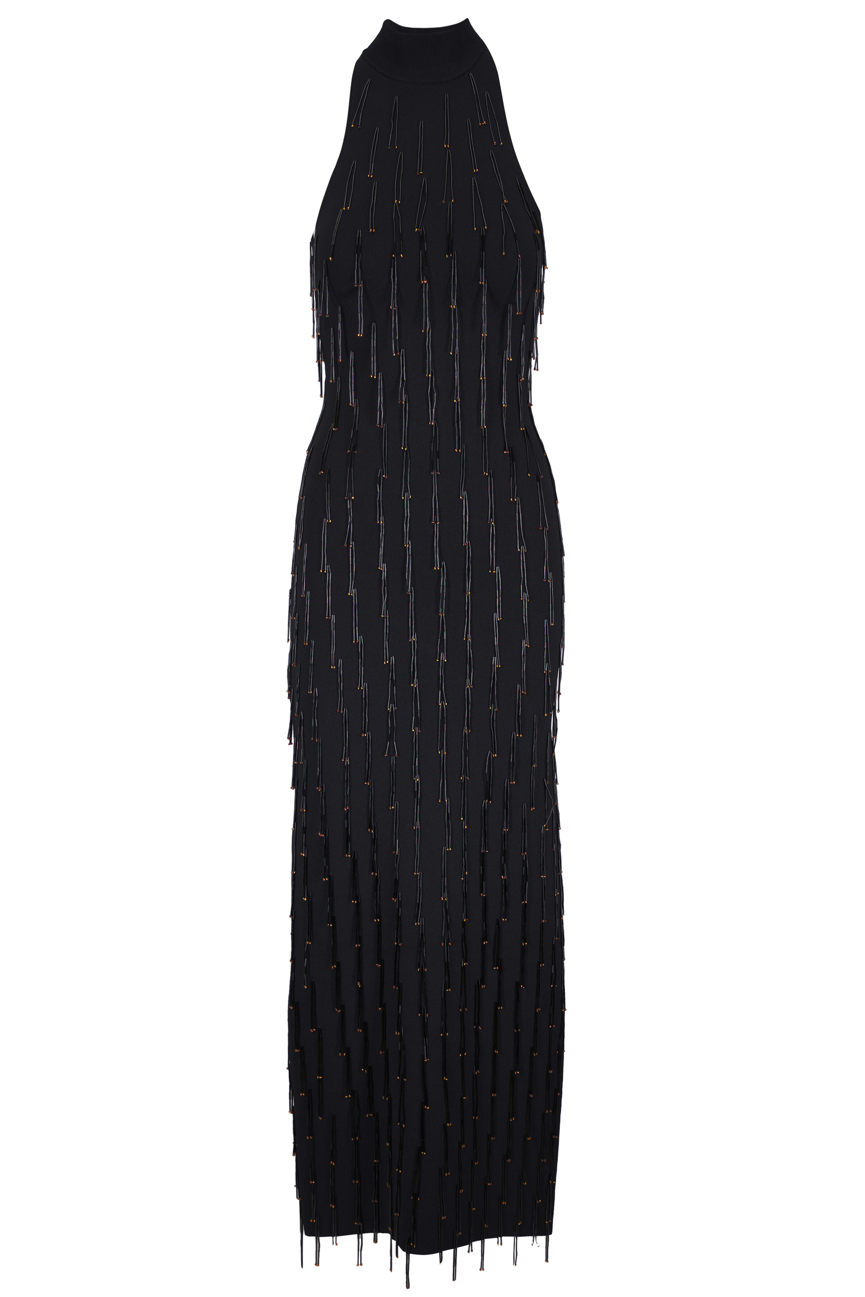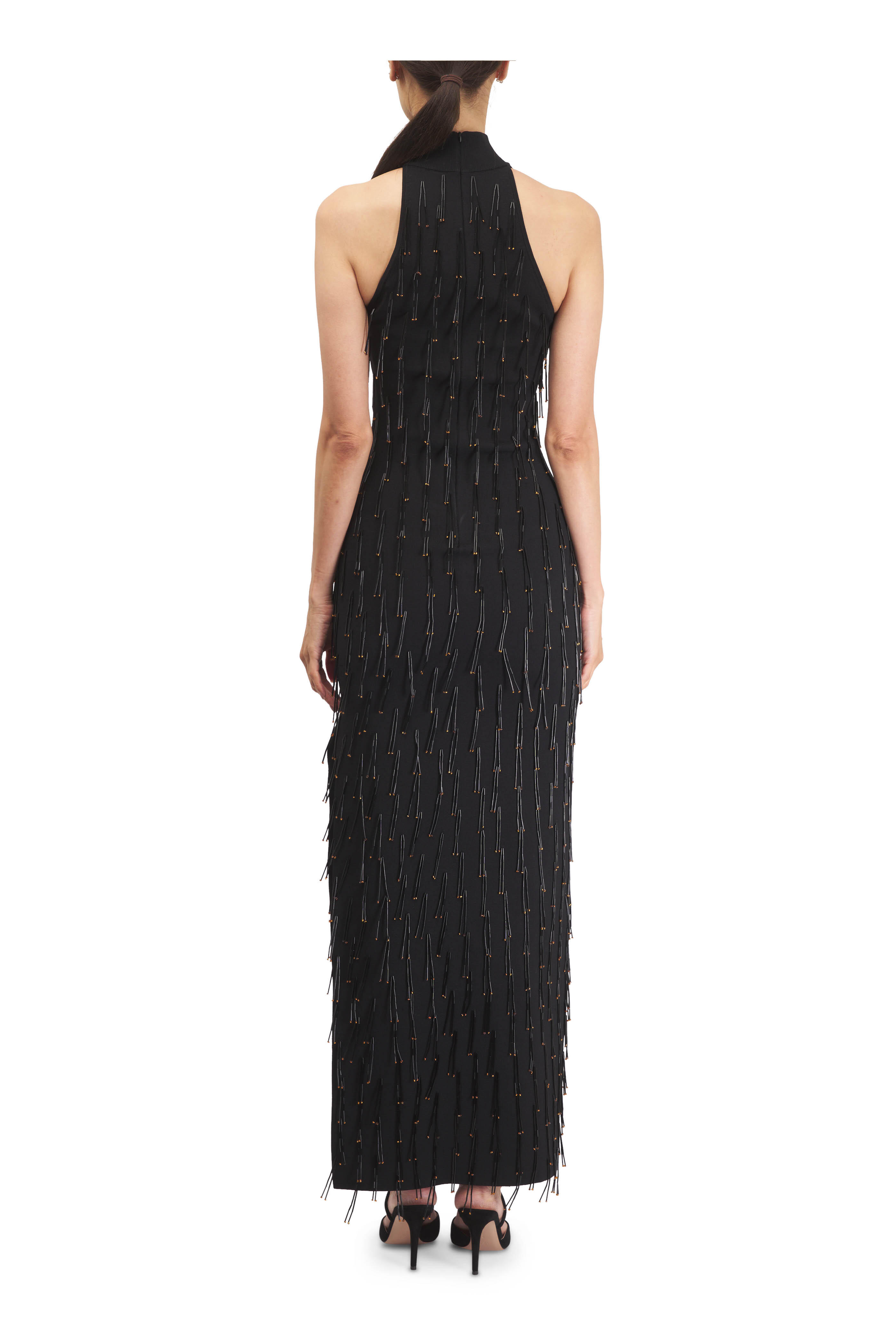 Stand collar. Concealed back zip. Side vent. Imported. 58" shoulder to hem. 61% viscose, 19% polyamide 20% elastane. Dry clean.