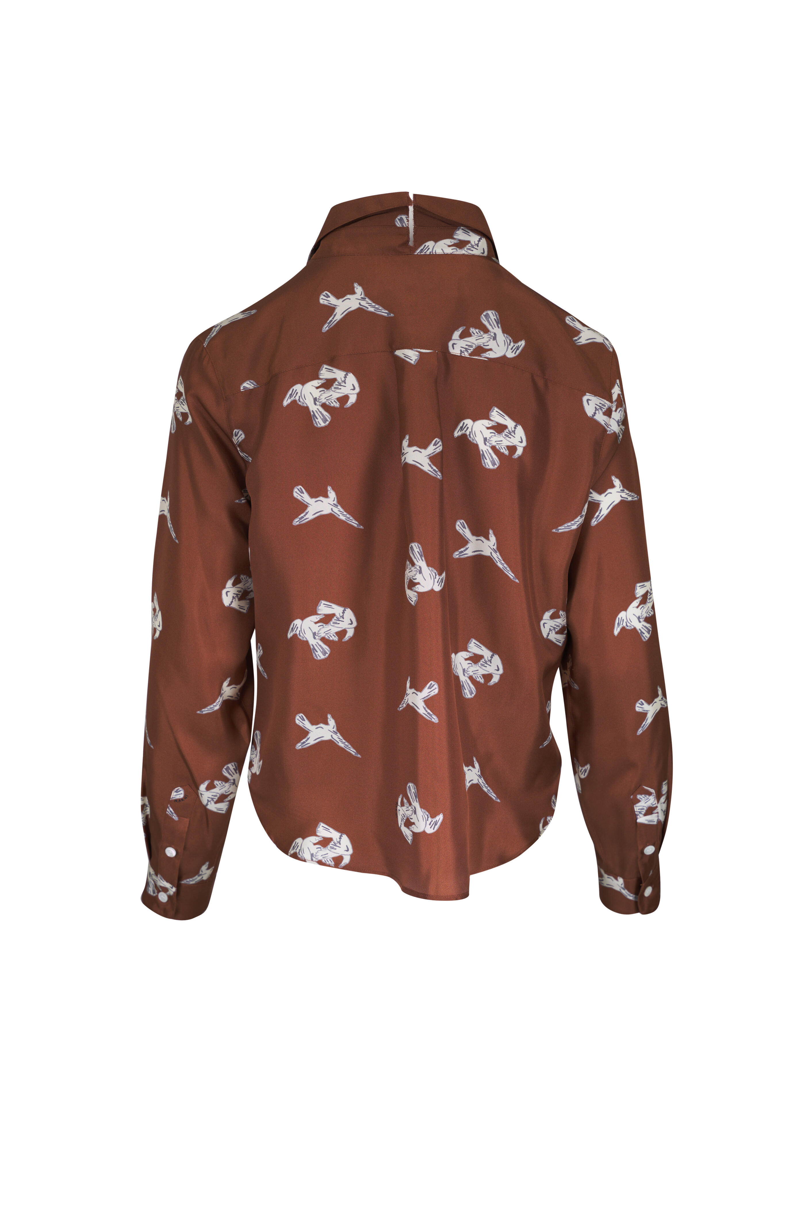 Spread collar. Front button placket. Chest patch pocket. Single button barrel cuffs. Made in Italy. 100% silk. Dry clean.