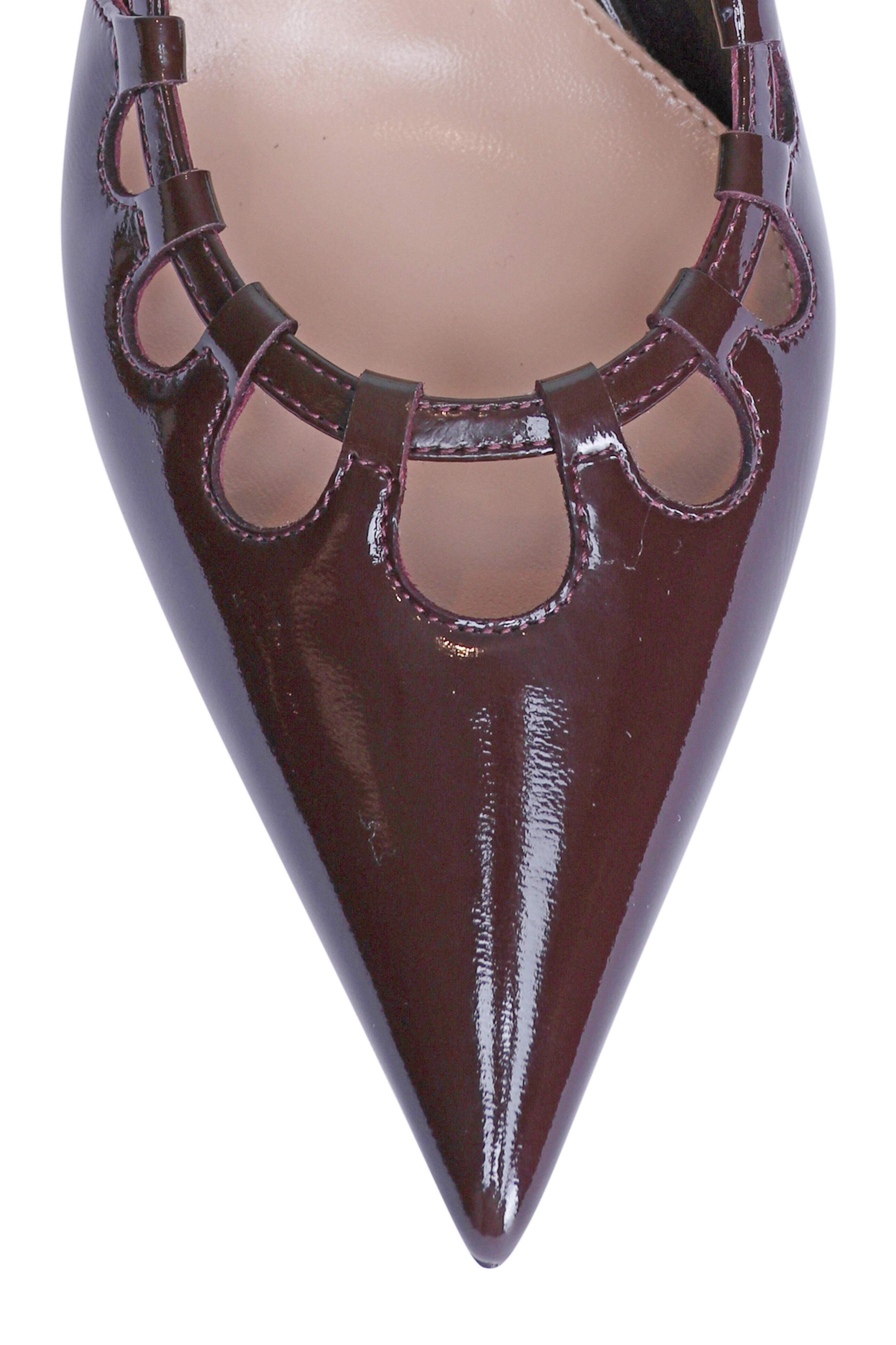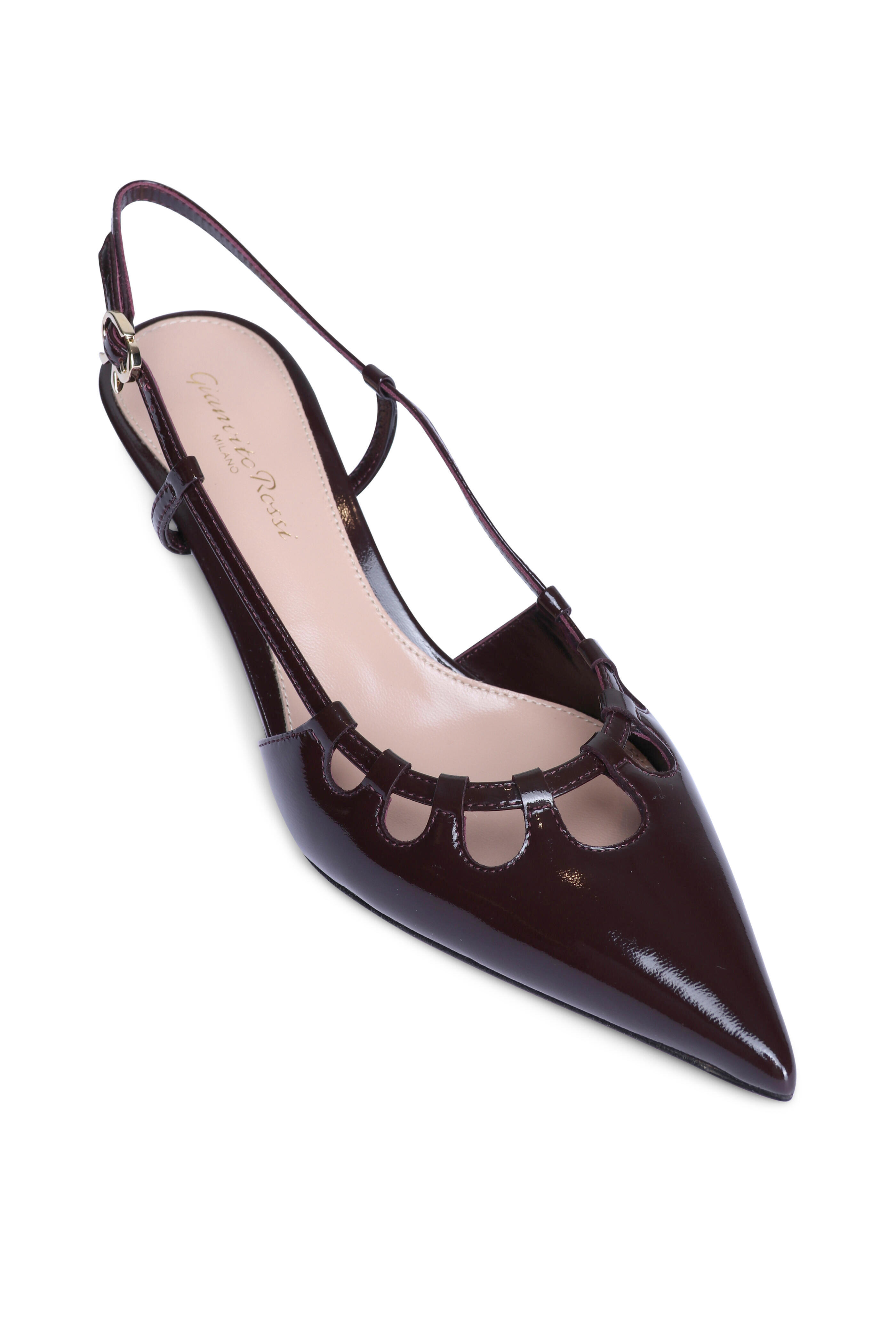 Patent leather upper. Leather lining and sole. Pointed toe. Adjustable buckle slingback strap. Cut-out design. Slip-on style. Stiletto heel. Made in Italy. Heel measurement: 55mm.