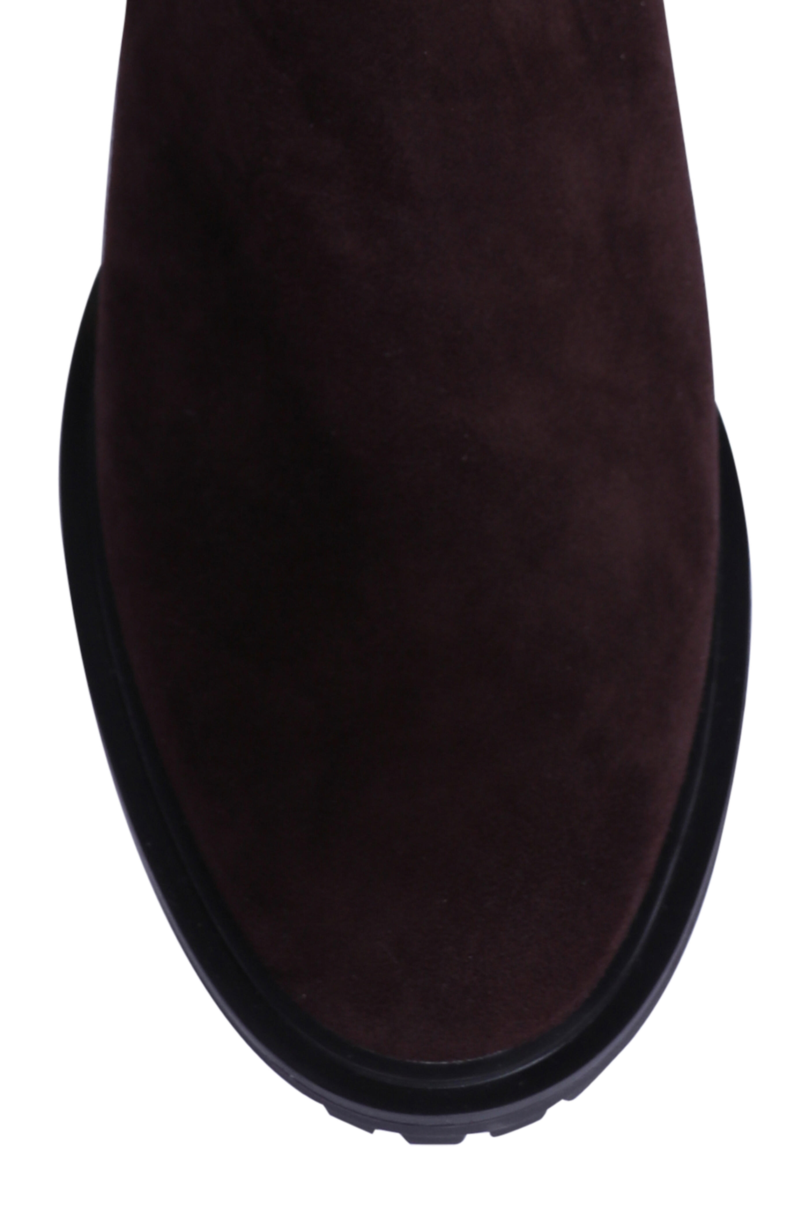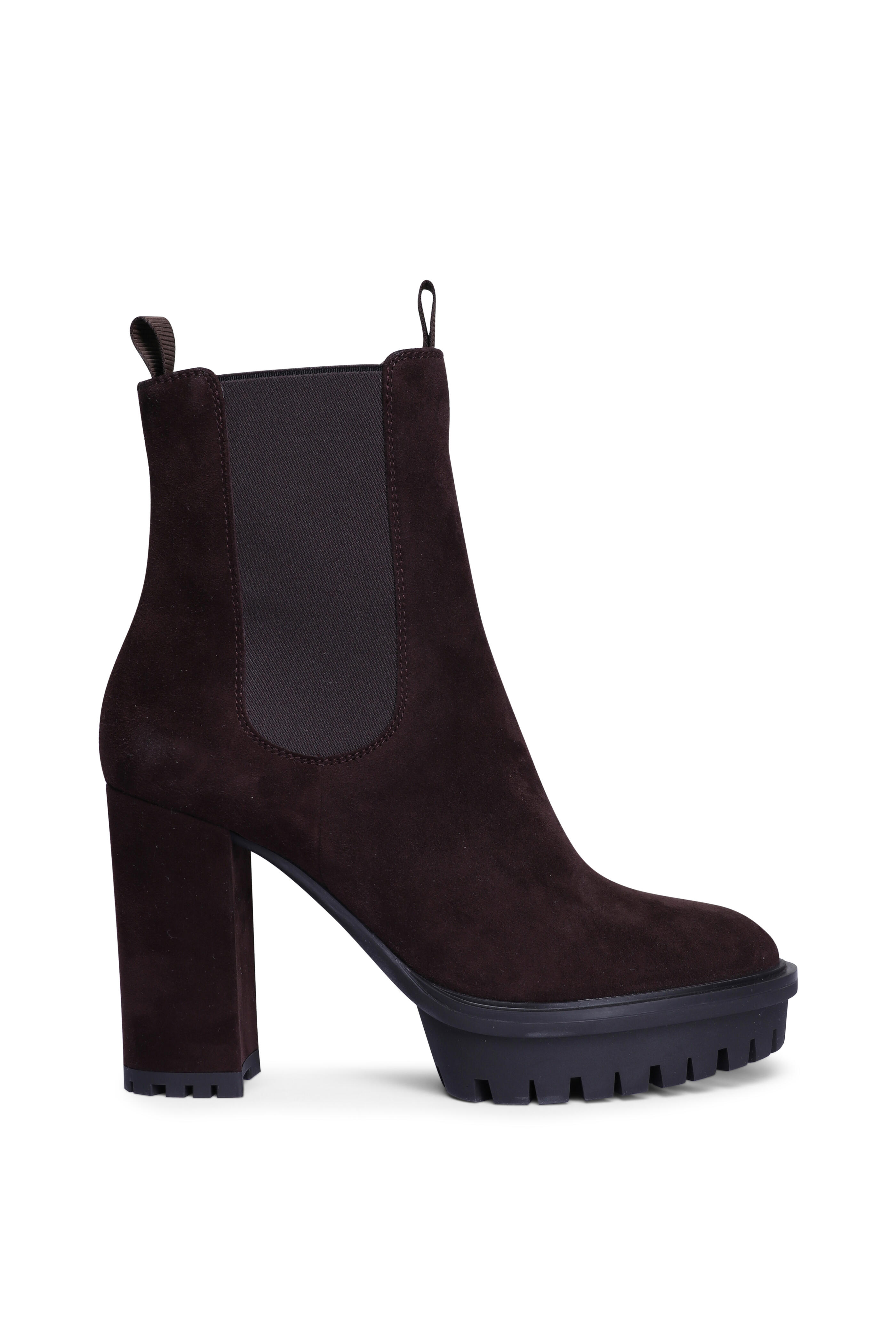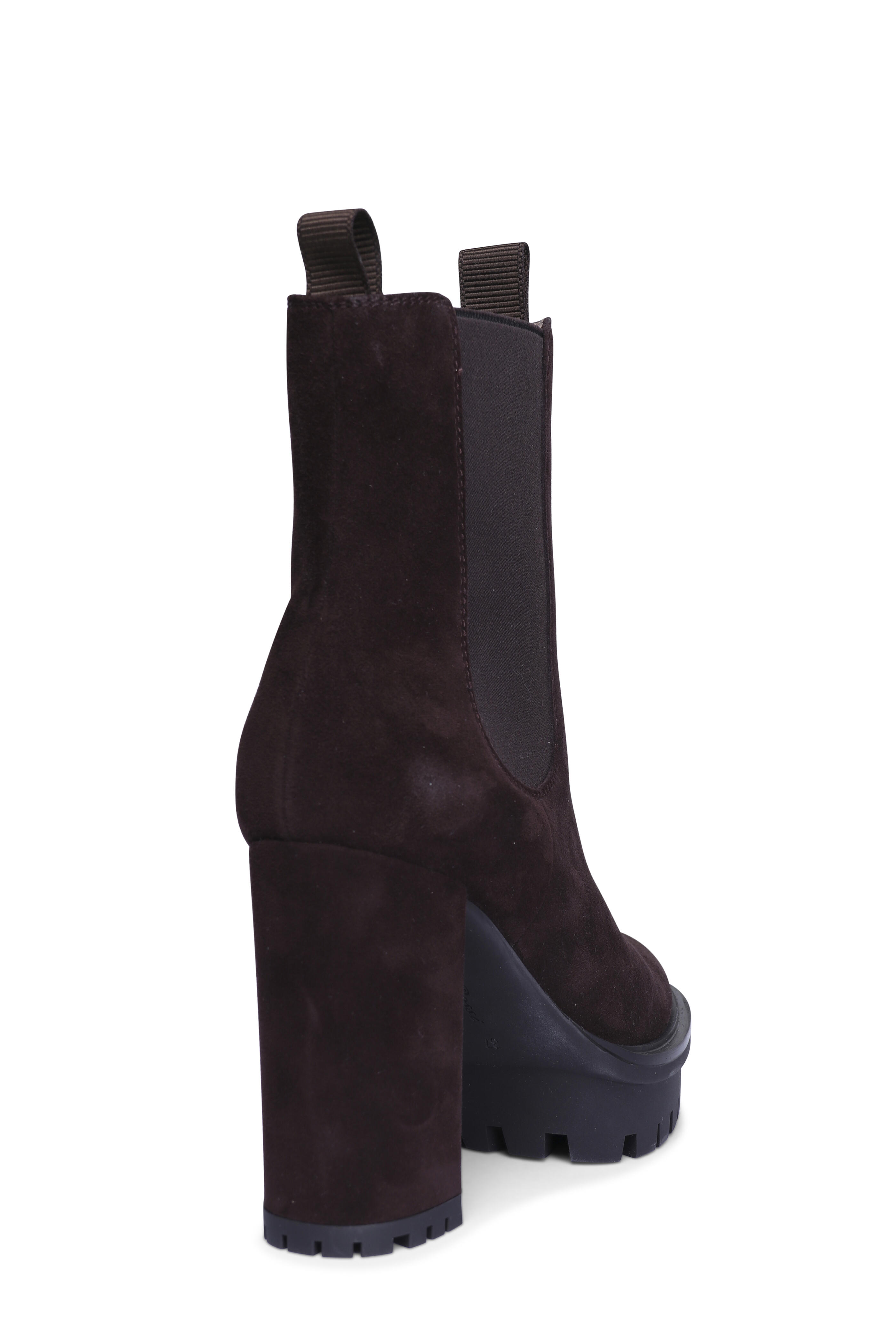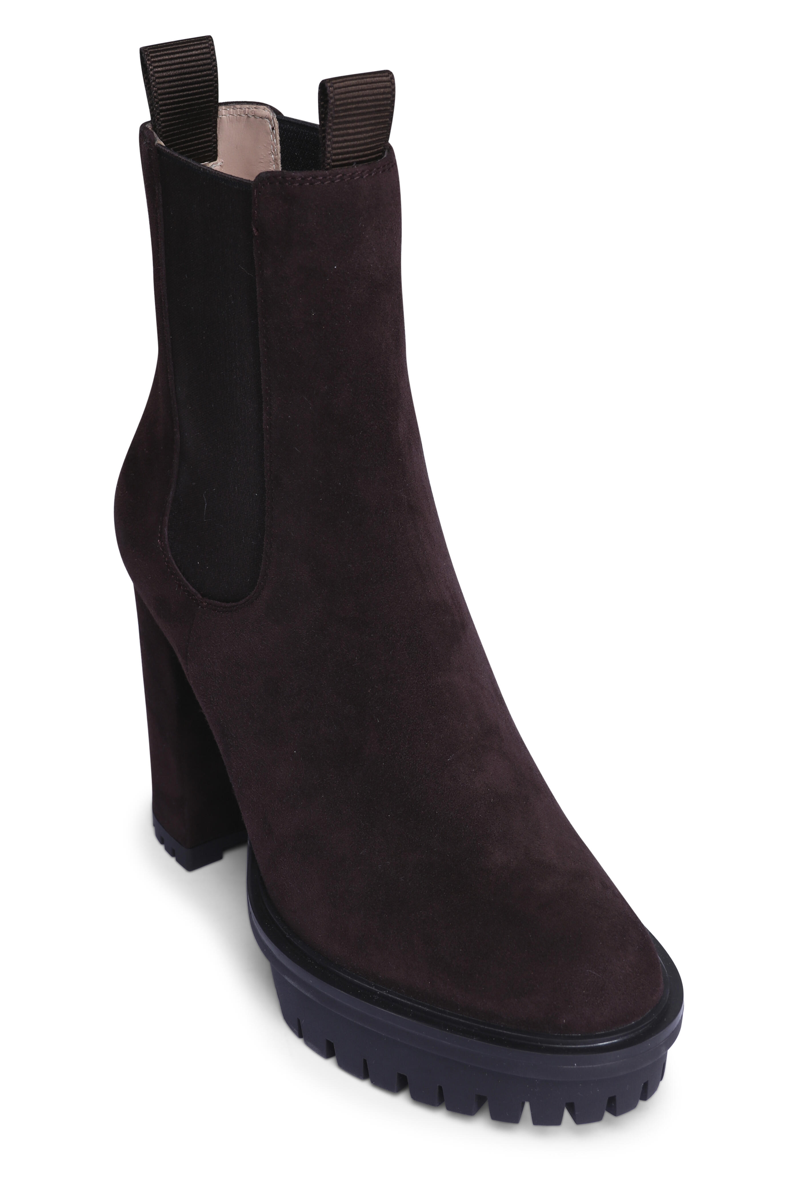 Suede upper. Leather lining. Rubber lug sole. Almond toe. Elastic gored sides. Front and back pull tabs. Pul-on style. Block heel. Made in Italy. Heel measurement: 70mm.