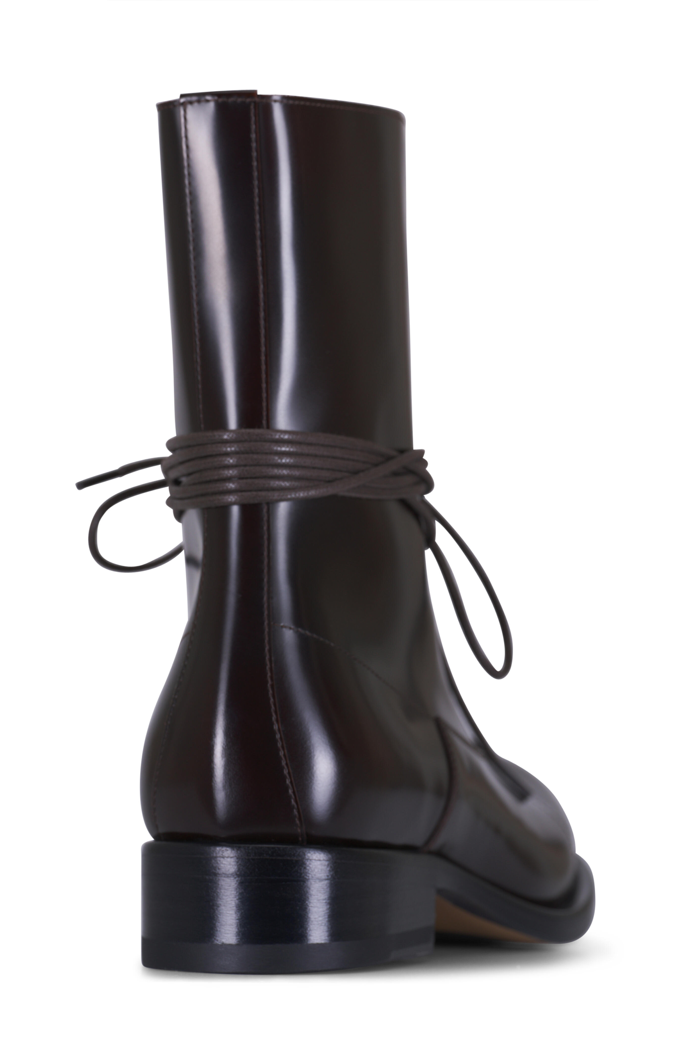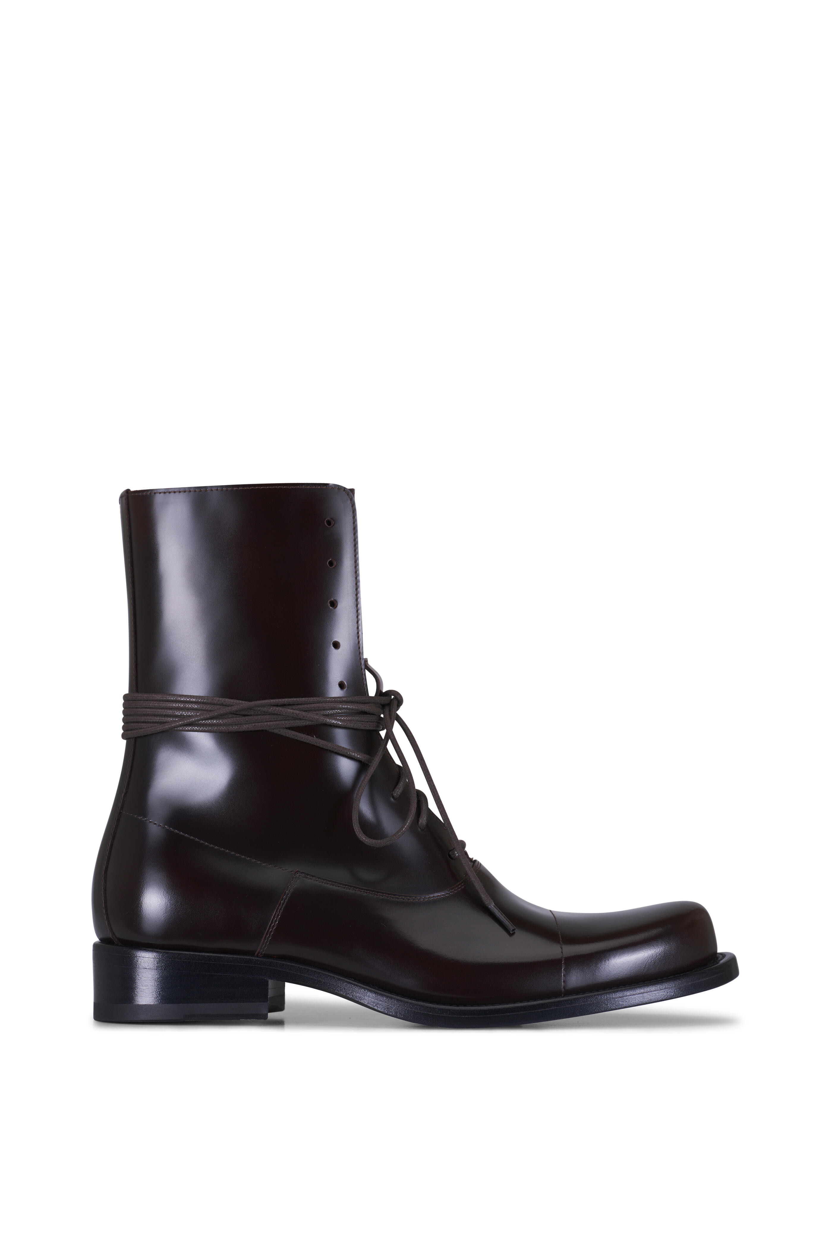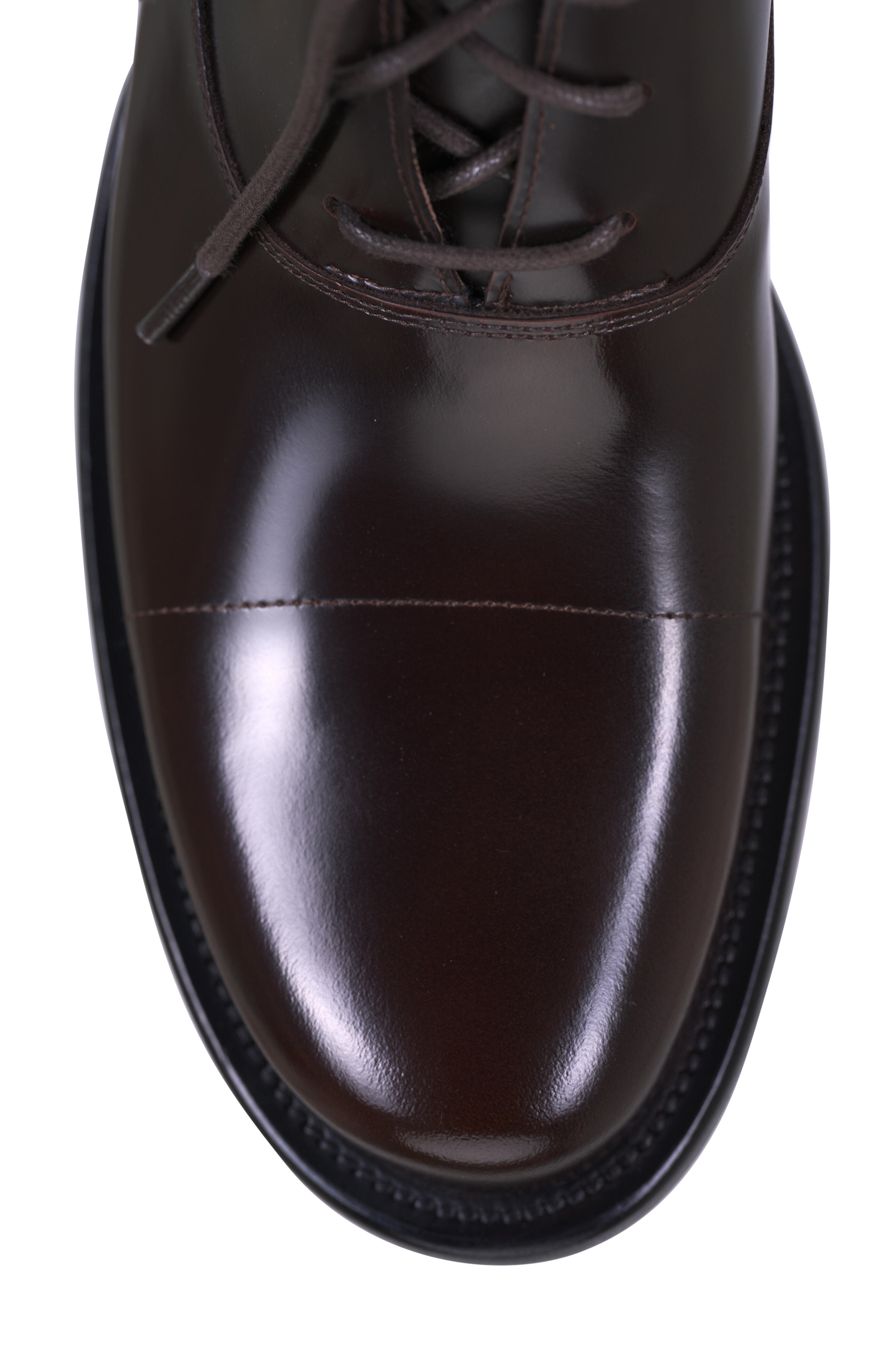 Glossy calfskin leather upper. Lace-up closure. Round toe. Stacked leather heel. Leather lining and insole. Extended leather sole. Made in Italy.