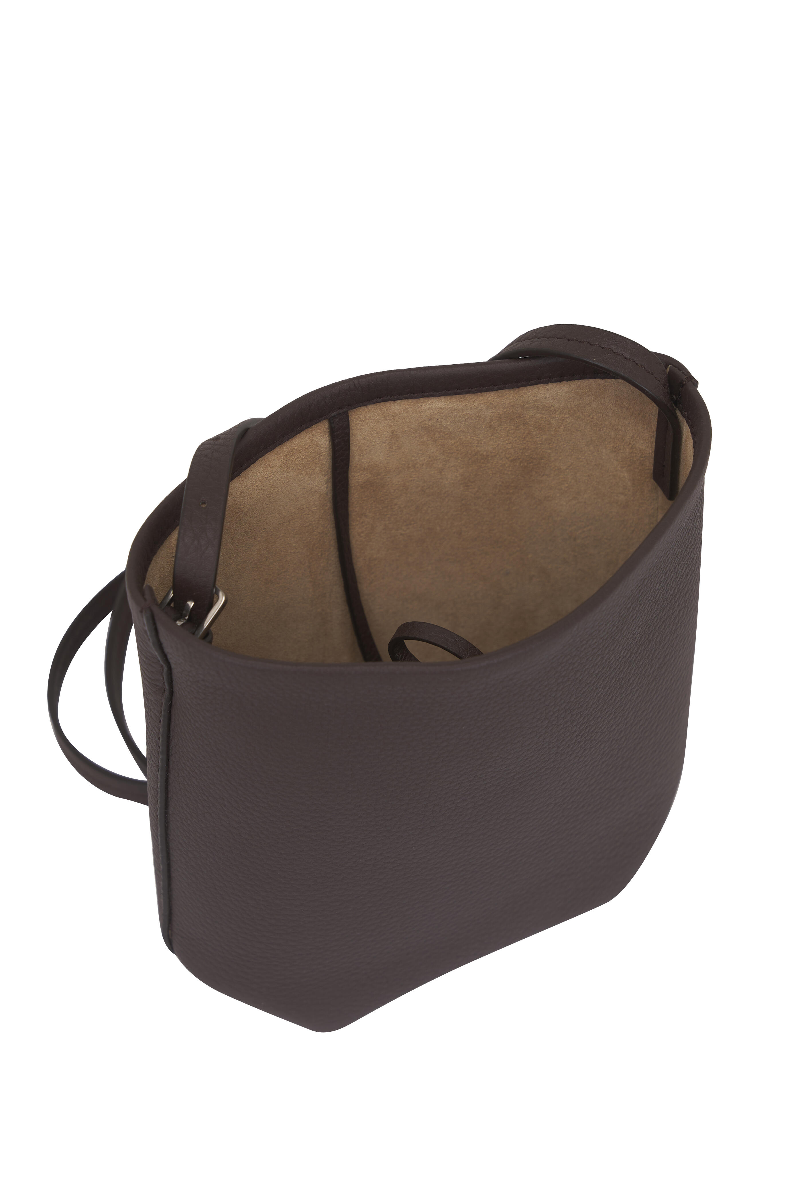 Textured calfskin leather. Single, adjustable leather crossbody strap. One open compartment. Calfskin suede lining. Made in Italy. 4.1 x 7.5 x 7.75 in.