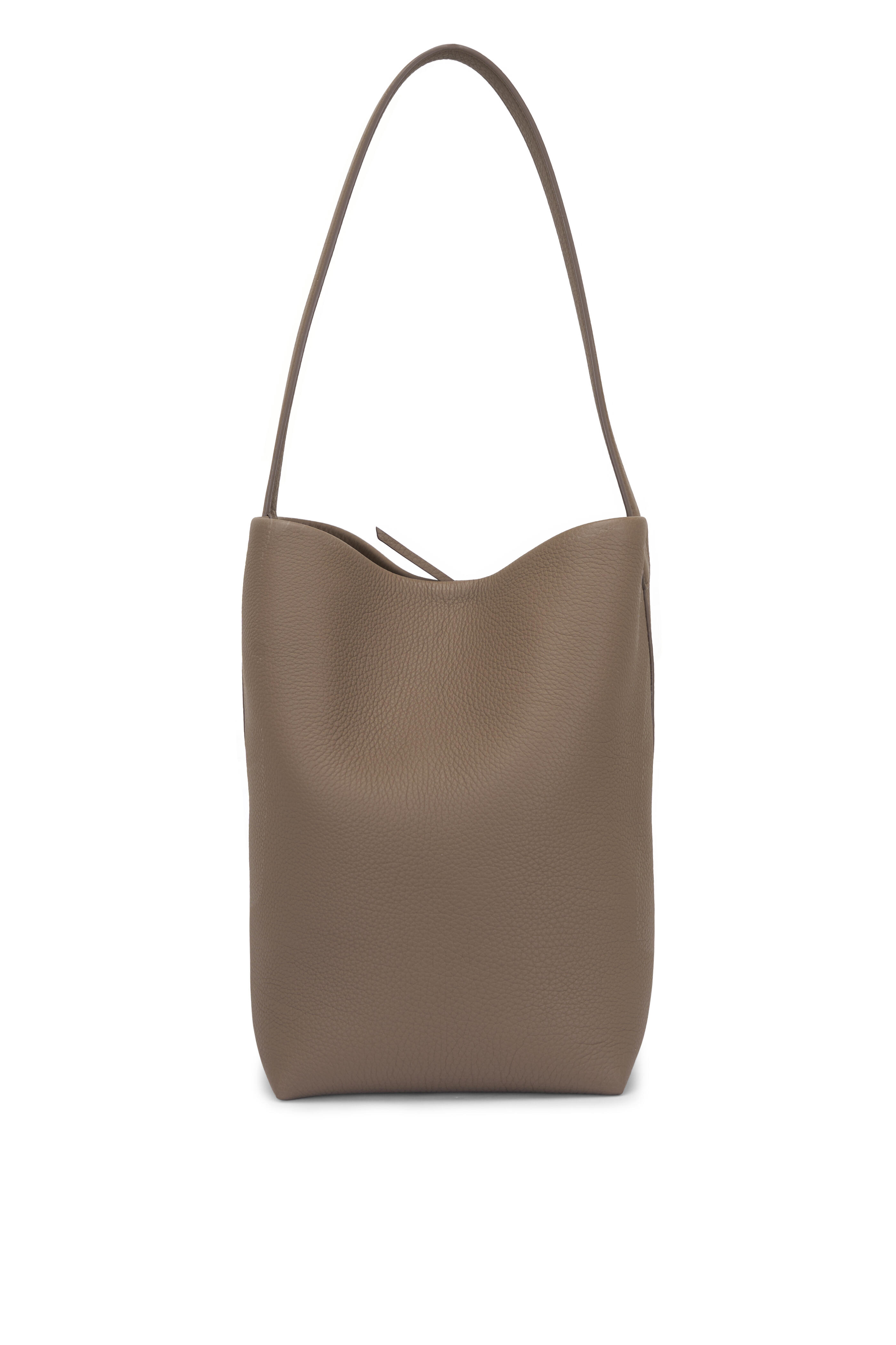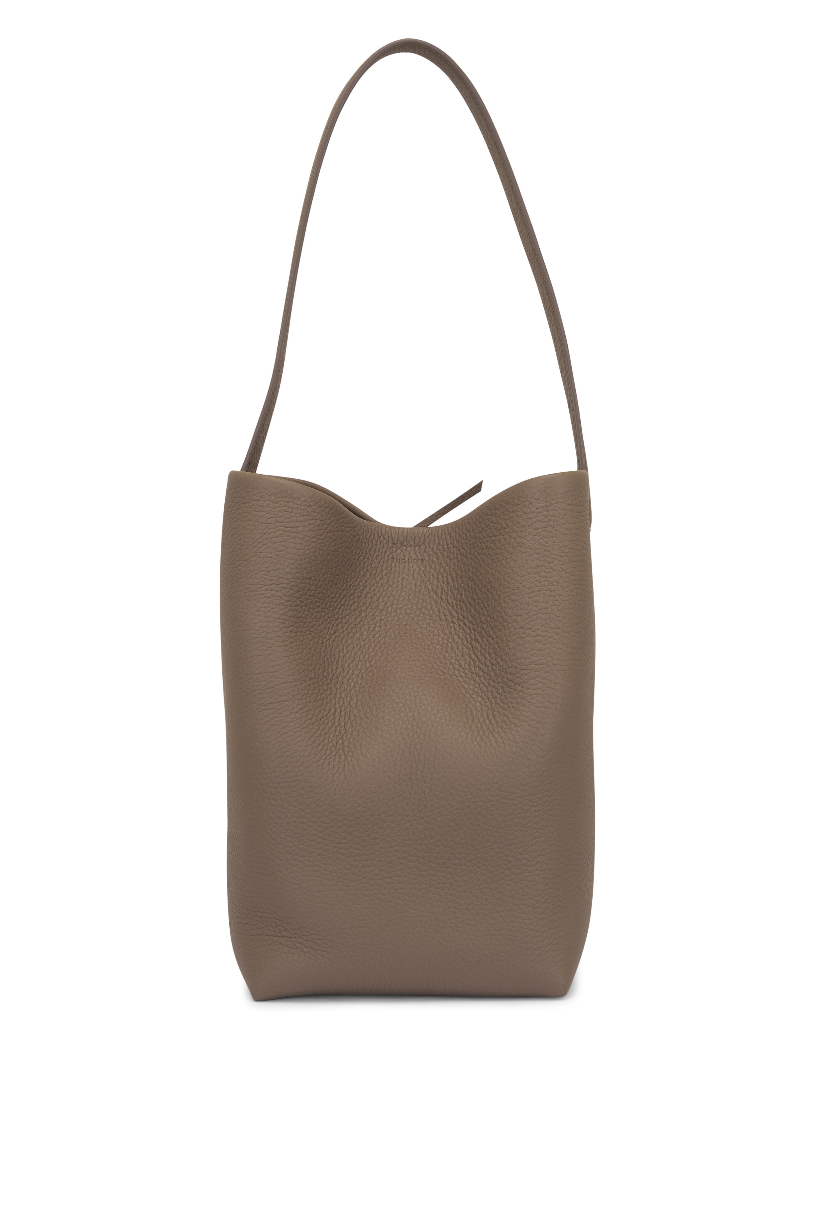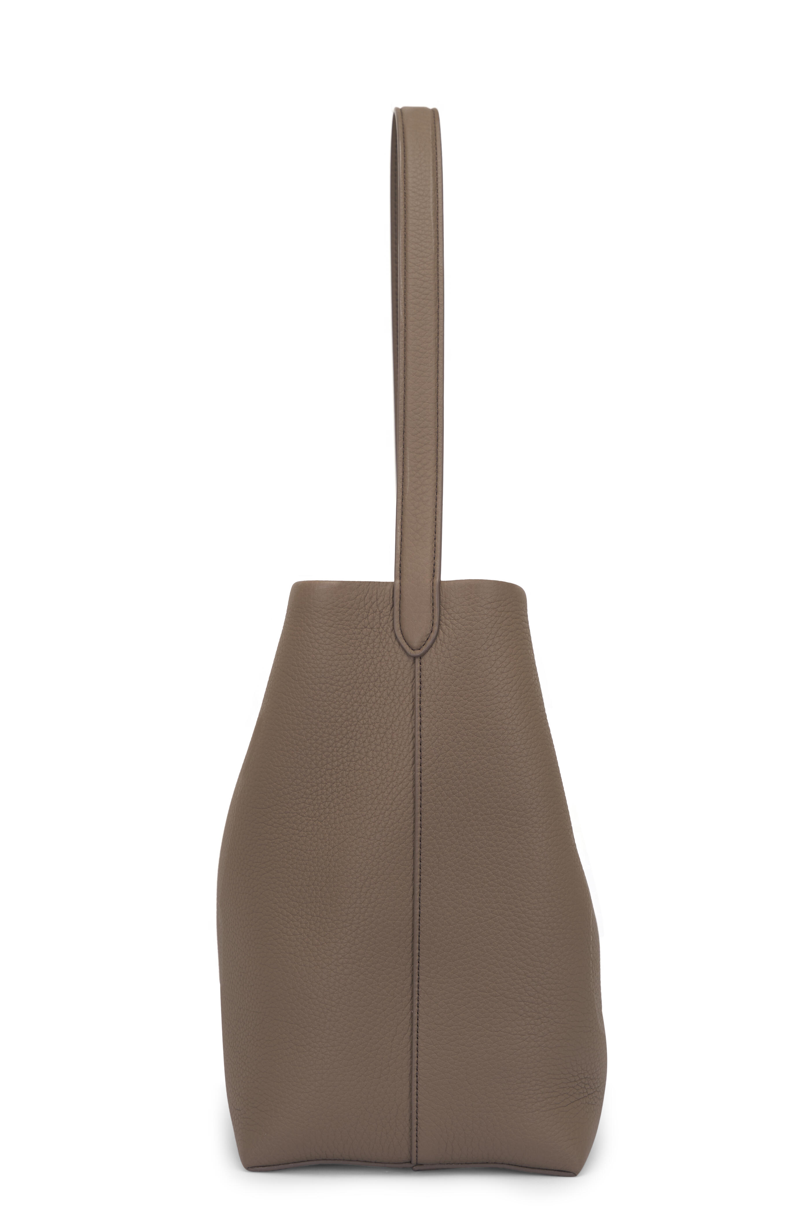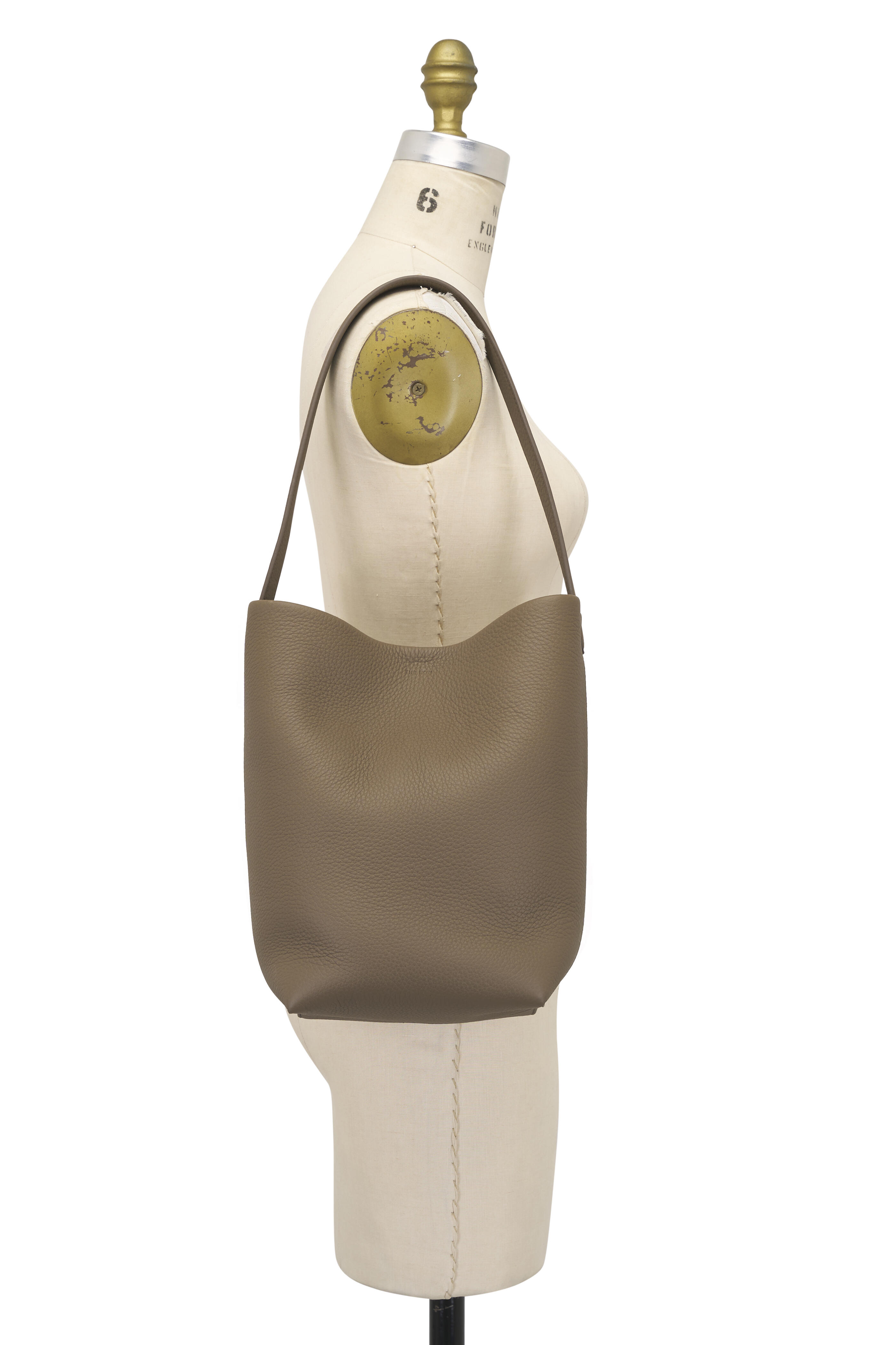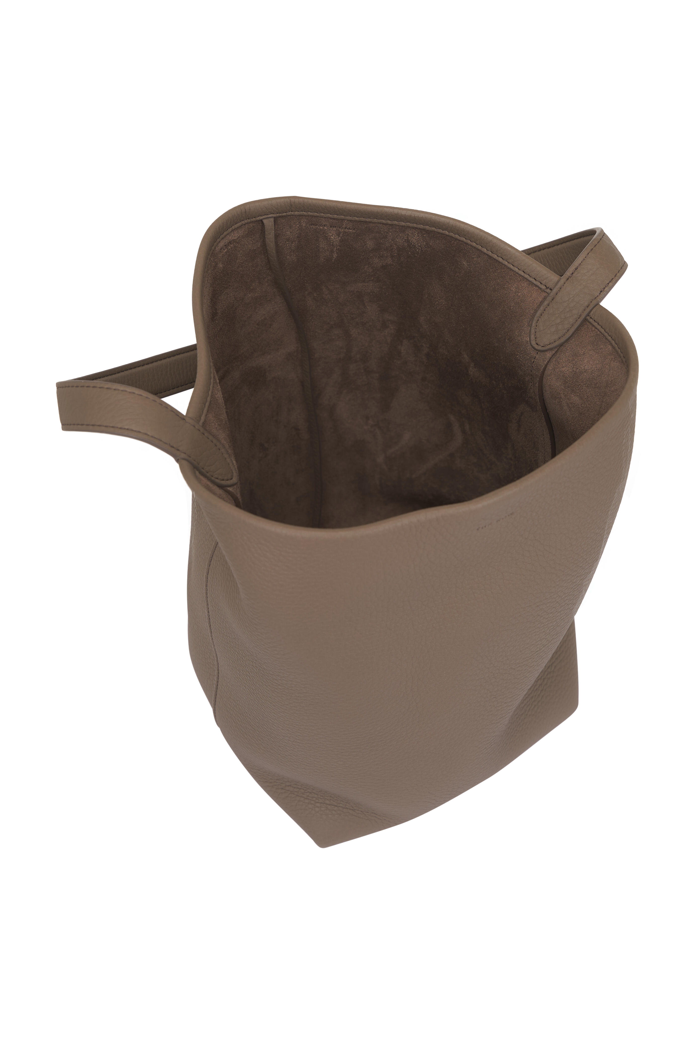 Calfskin leather. Single top handle. Interior tie closure. Square base. Suede lining. Made in Italy. Color: Smoked Taupe. 6.75" x 6" x 11.25". Handle drop: 10".