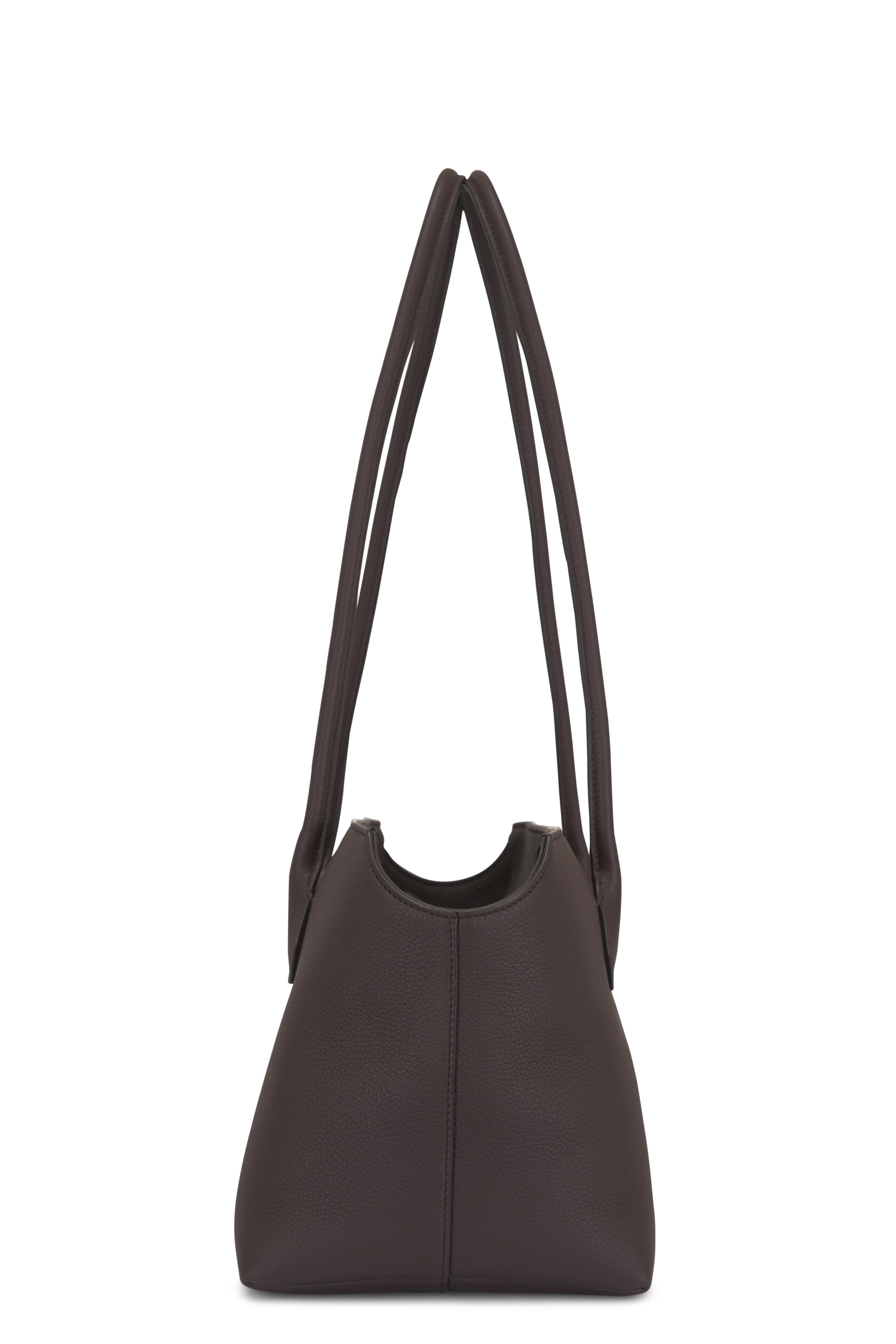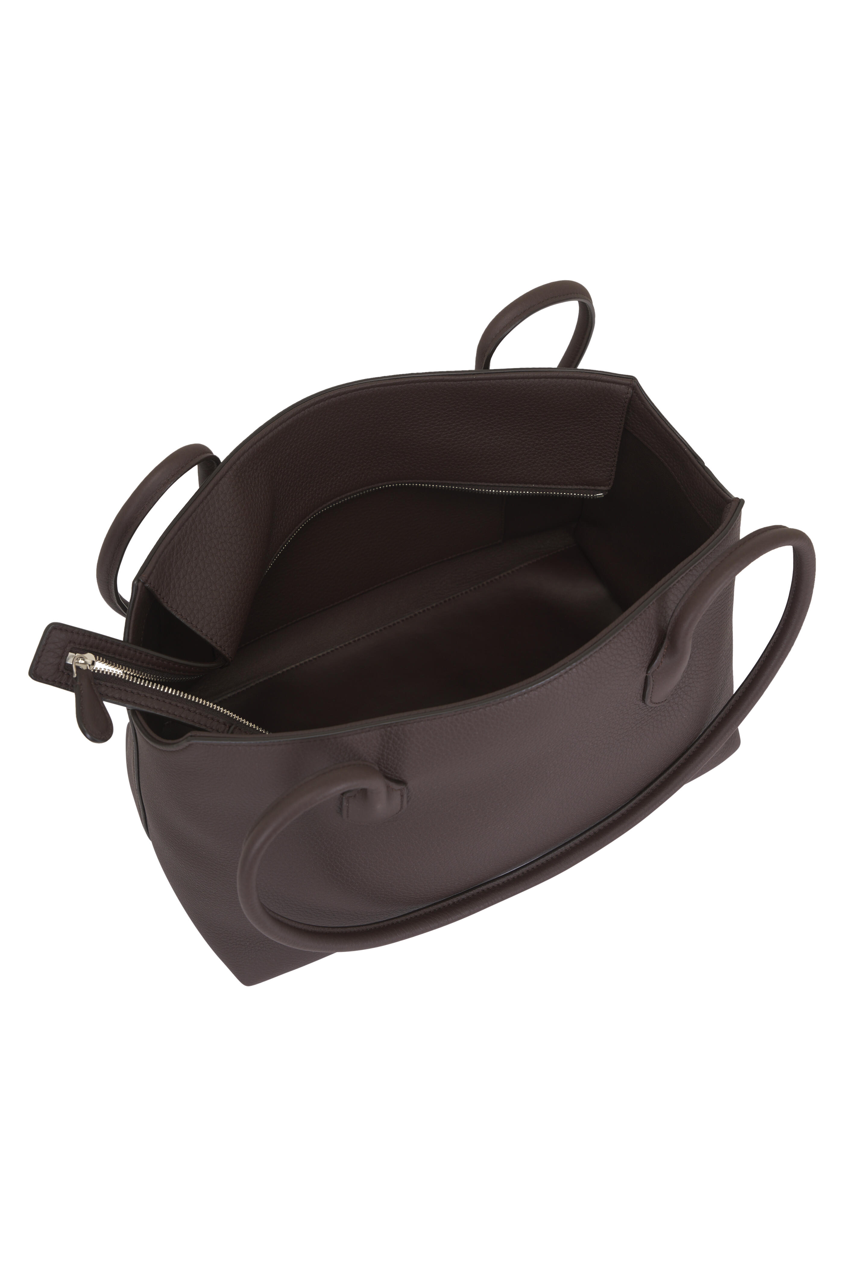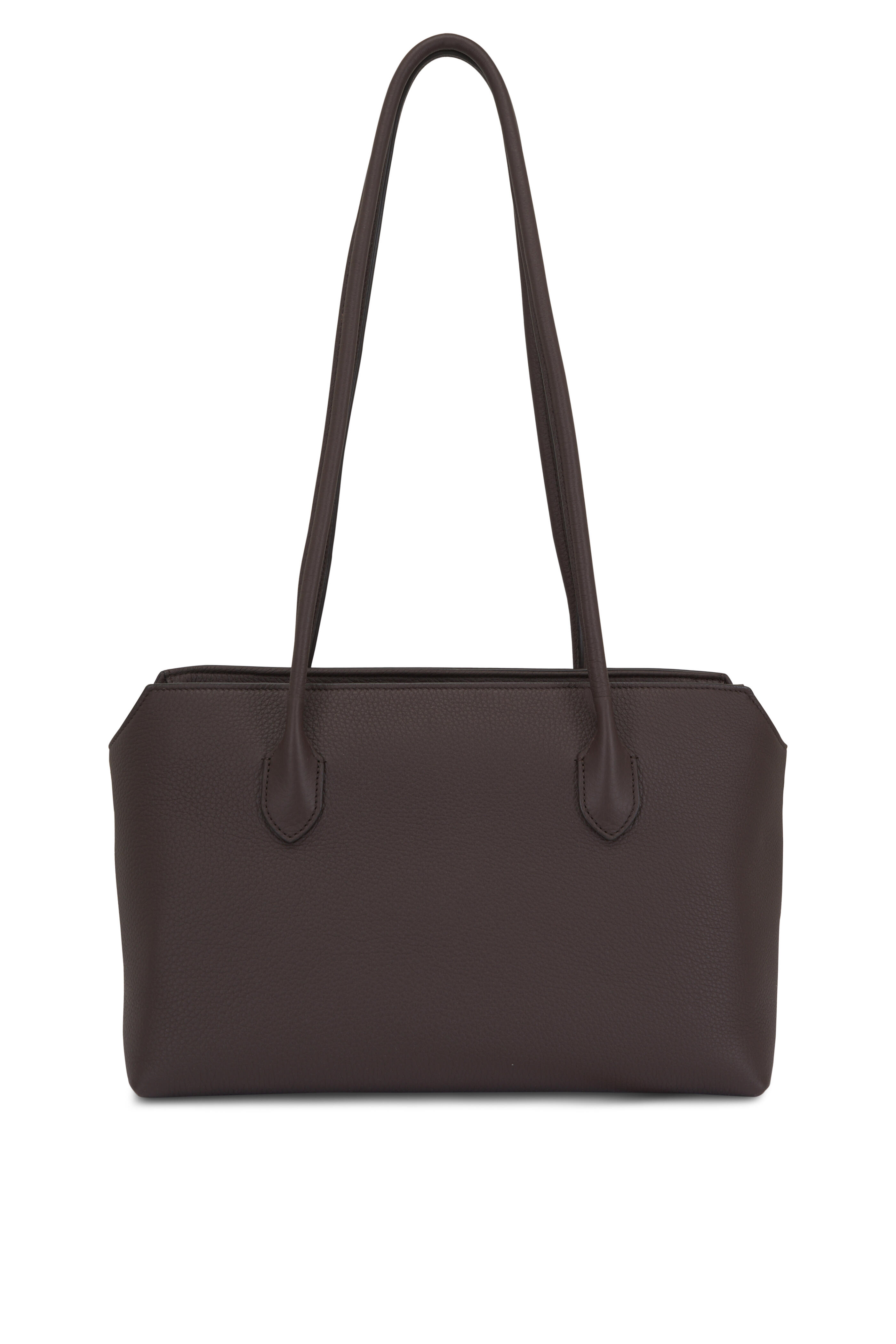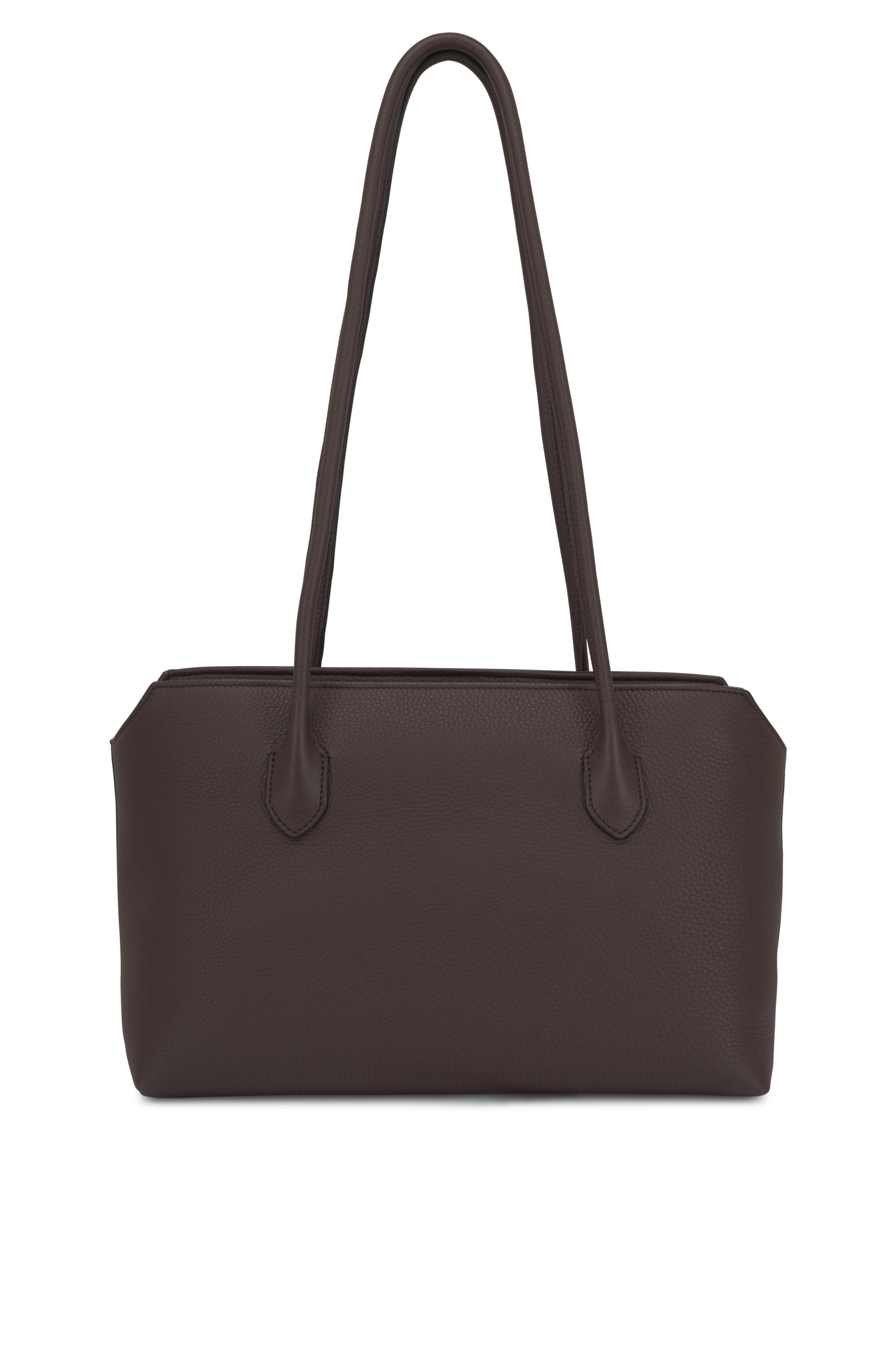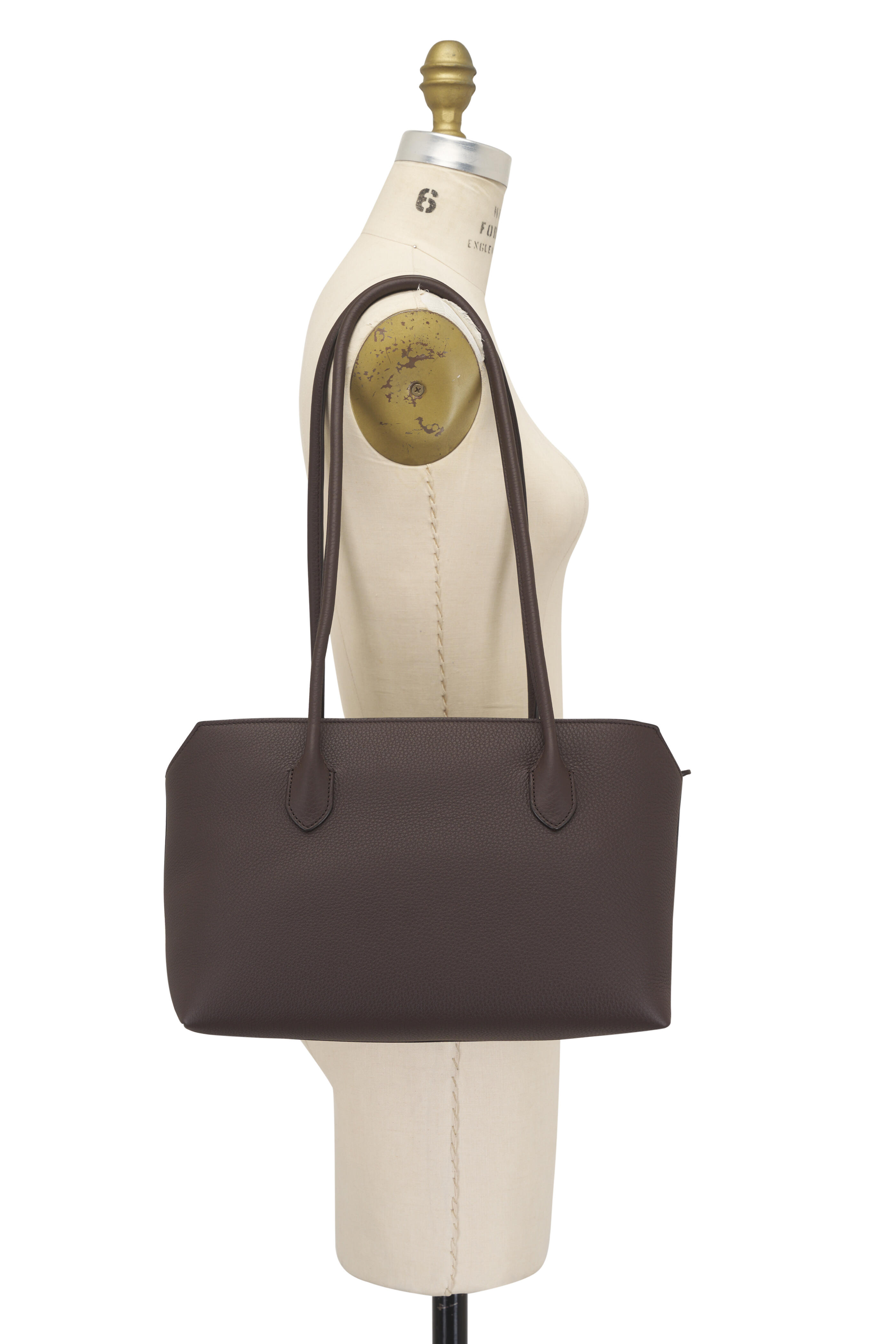 Calfskin leather. Dual tubular leather top handles. Top zip closure. One interior slip pocket. Antique silver hardware finishing. Angled top edges. Calfskin leather lining. Made in Italy. 13 x 8 x 7 in.. Handle: 13 in. drop.