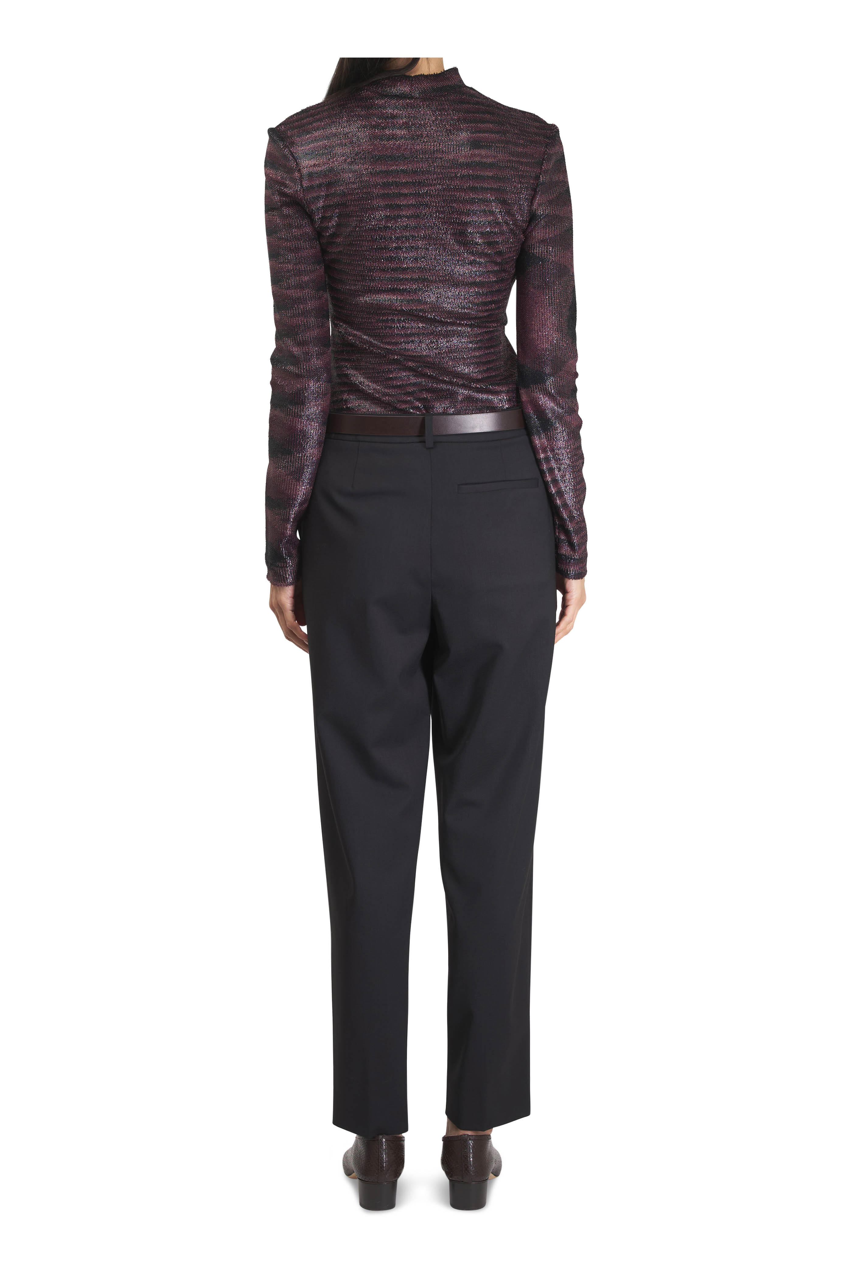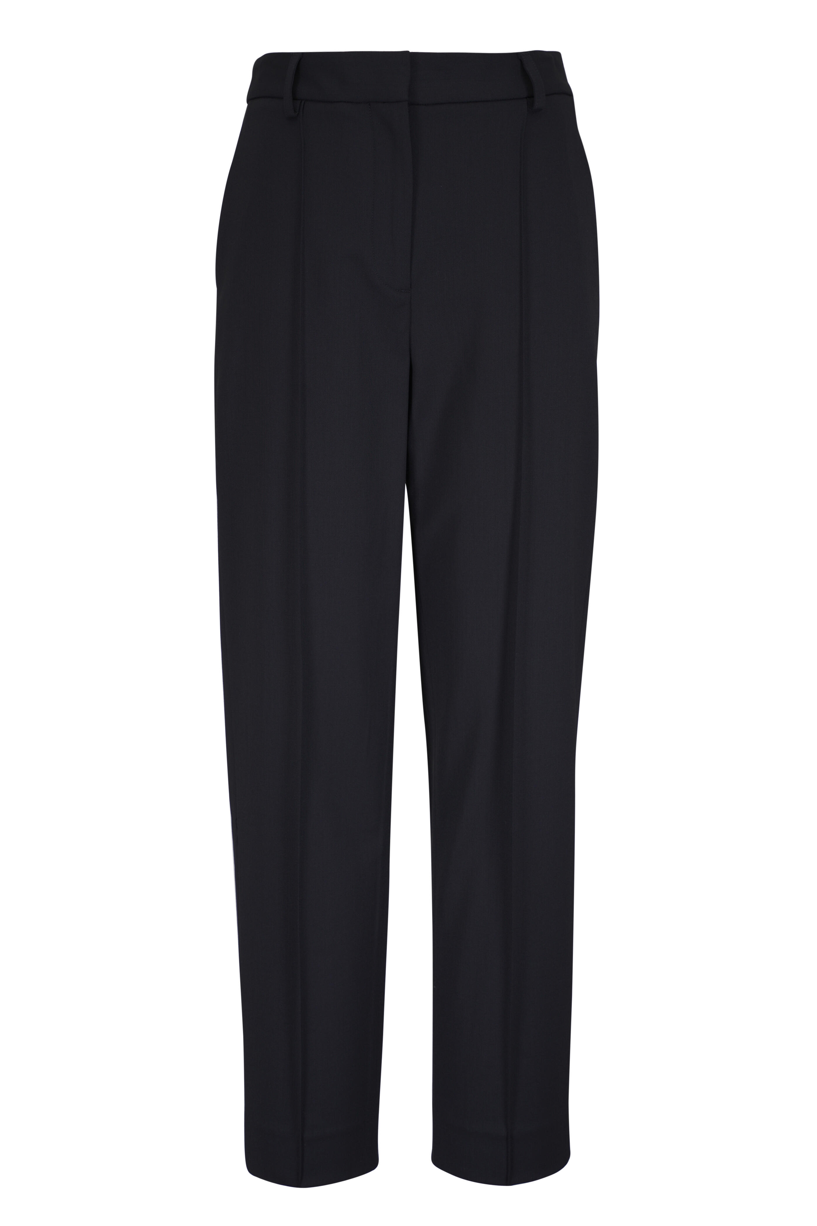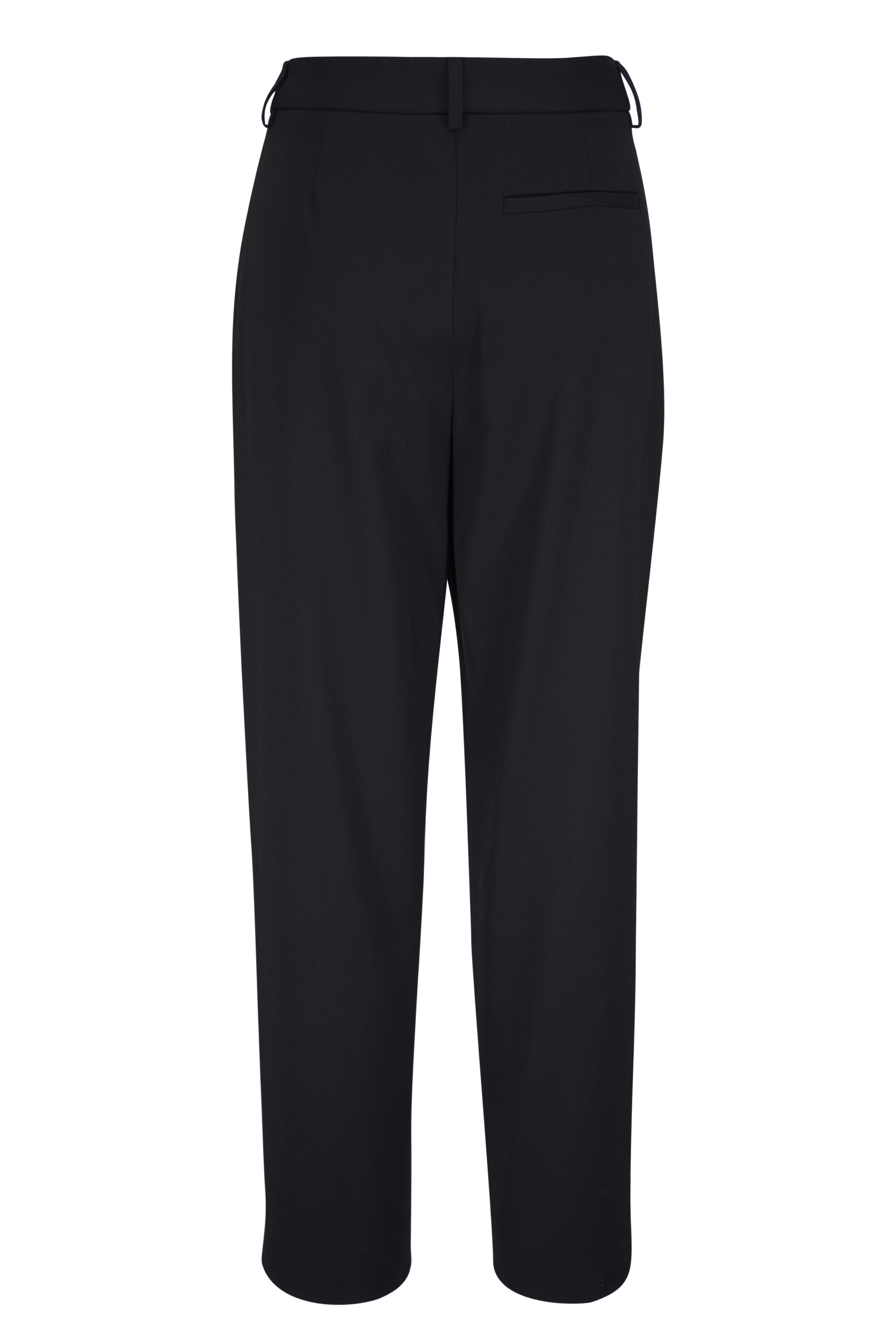 Hook and eye closure; zip fly. Banded waist; belt loops. Side slip pockets; back welt. Front pleat. Straight hem. Made in USA. 28" Inseam (size 10). 98% wool, 2% elastane. Dry clean.