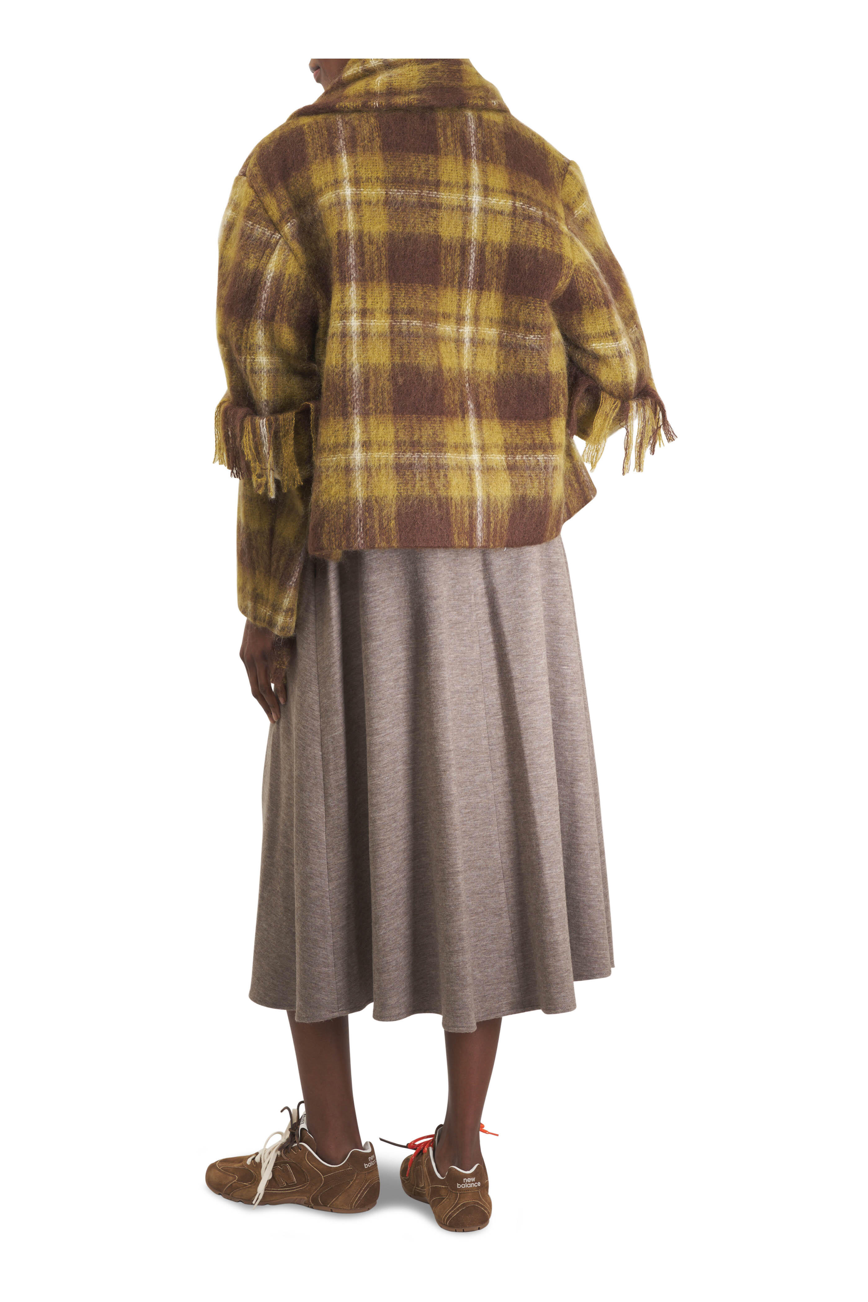 Oversized peak lapel. Double front button closure. Side slip pockets; interior welt pocket. Detachable scarf at back of neck. Double layer sleeves with fringed turn-up. Made in Italy. Approximately 24" shoulder to hem (measurements taken from size 6). 62% mohair, 38% wool; lined. Dry clean.