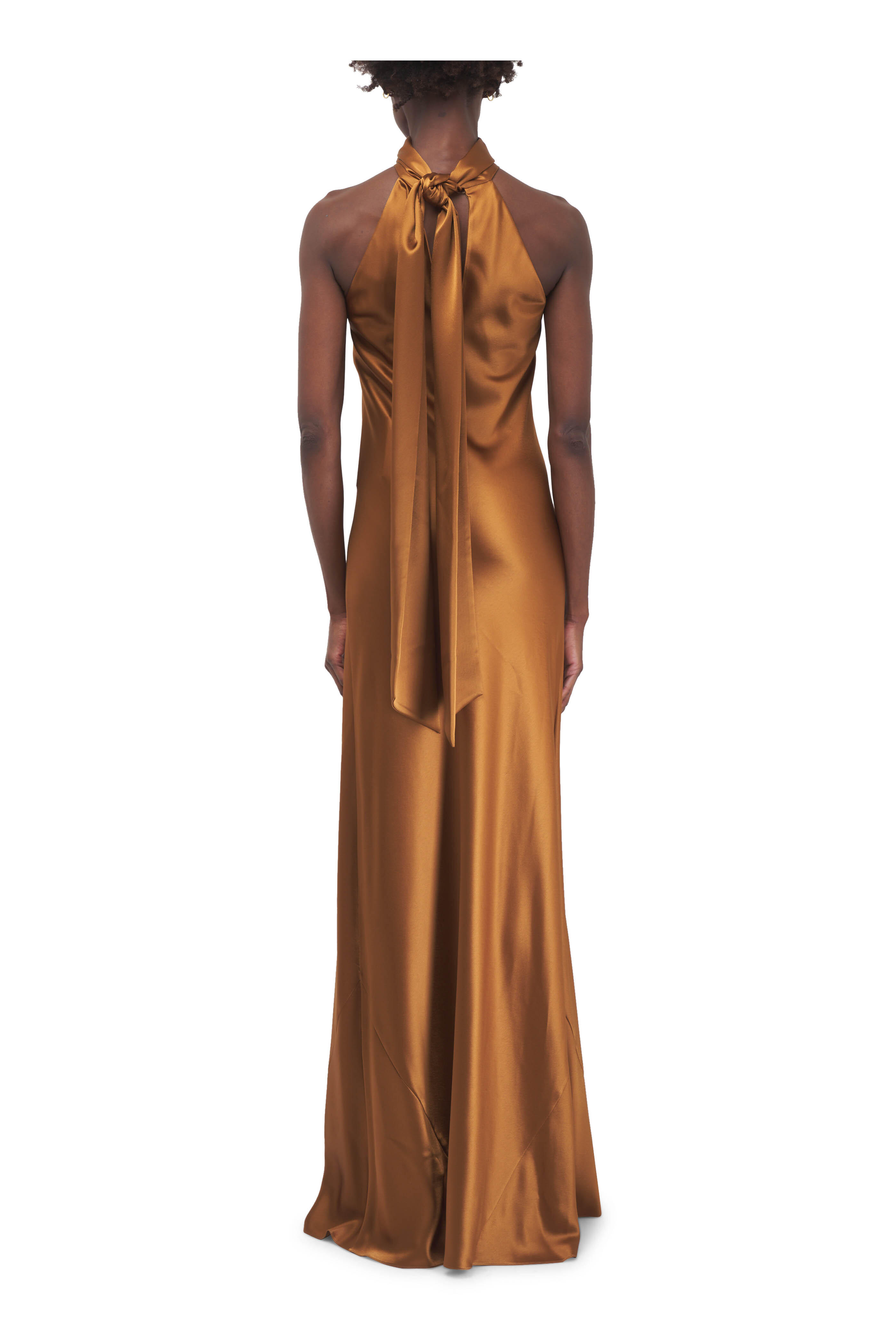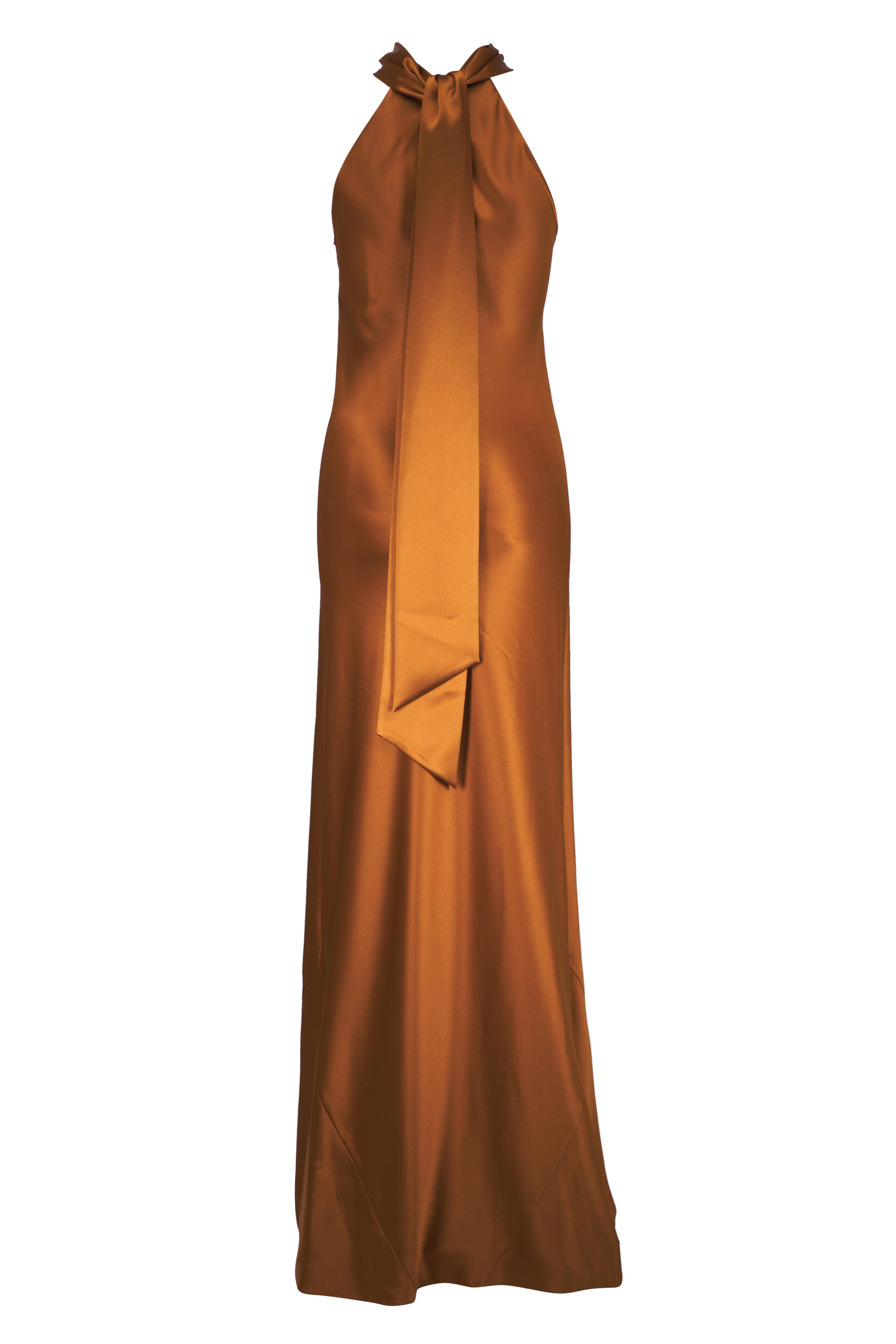 Sash-tie neckline. Keyhole back. Pull over style. Imported. 63" shoulder to hem. 80% triacetate, 20% polyester. Dry clean.