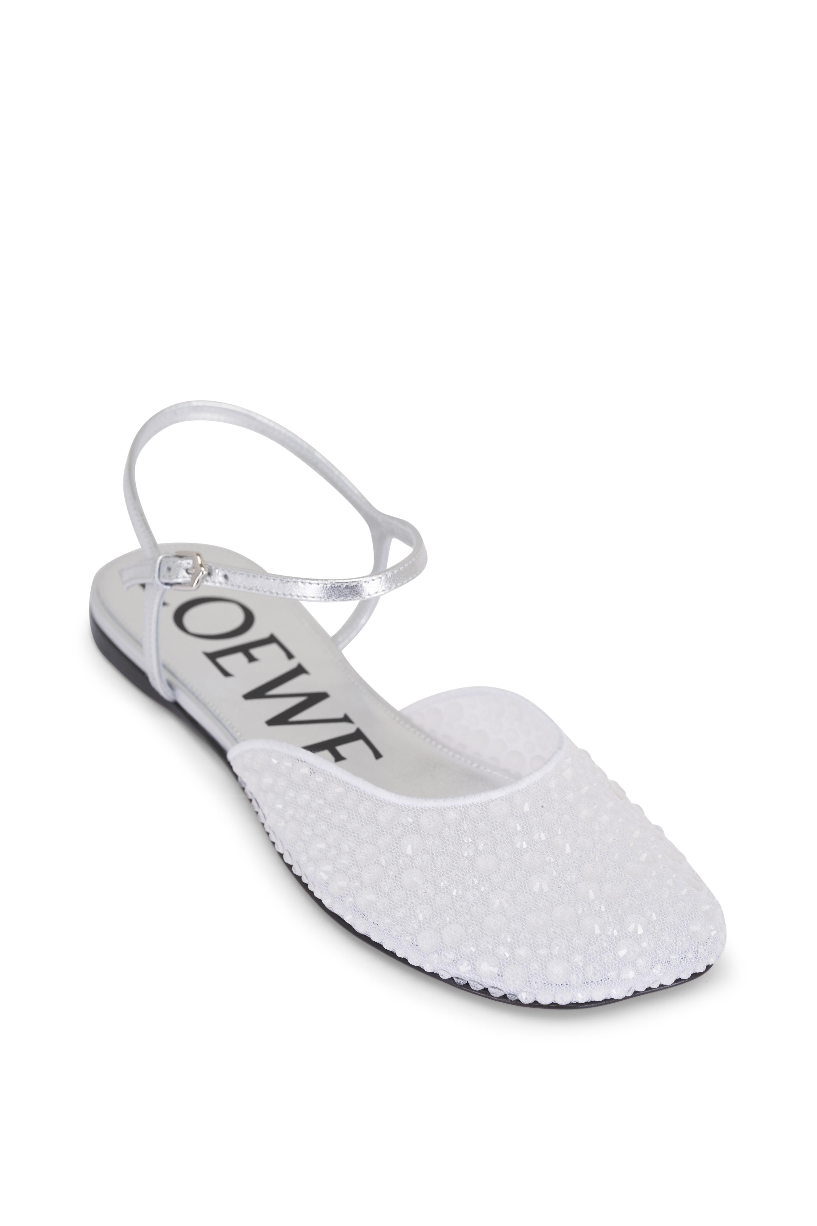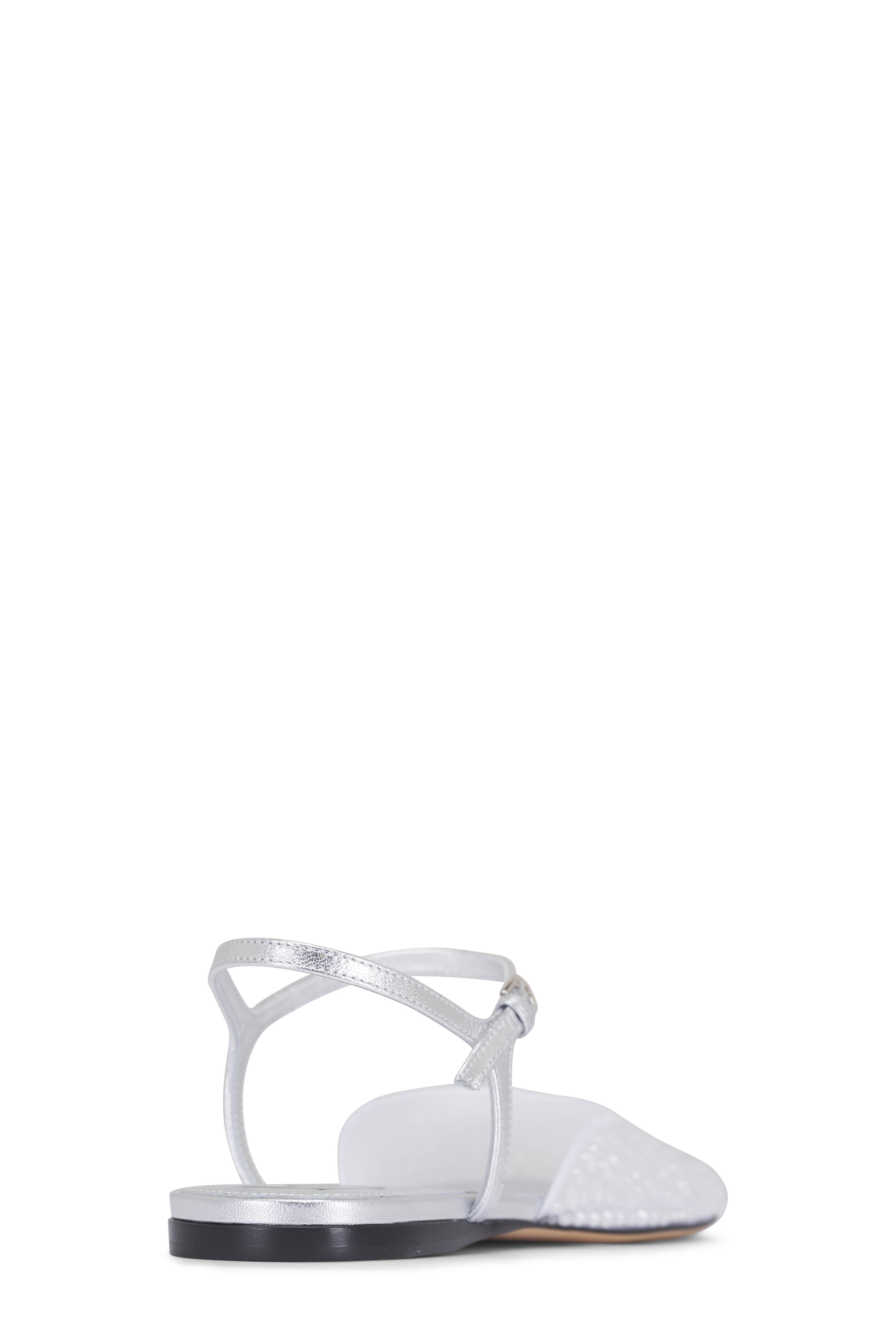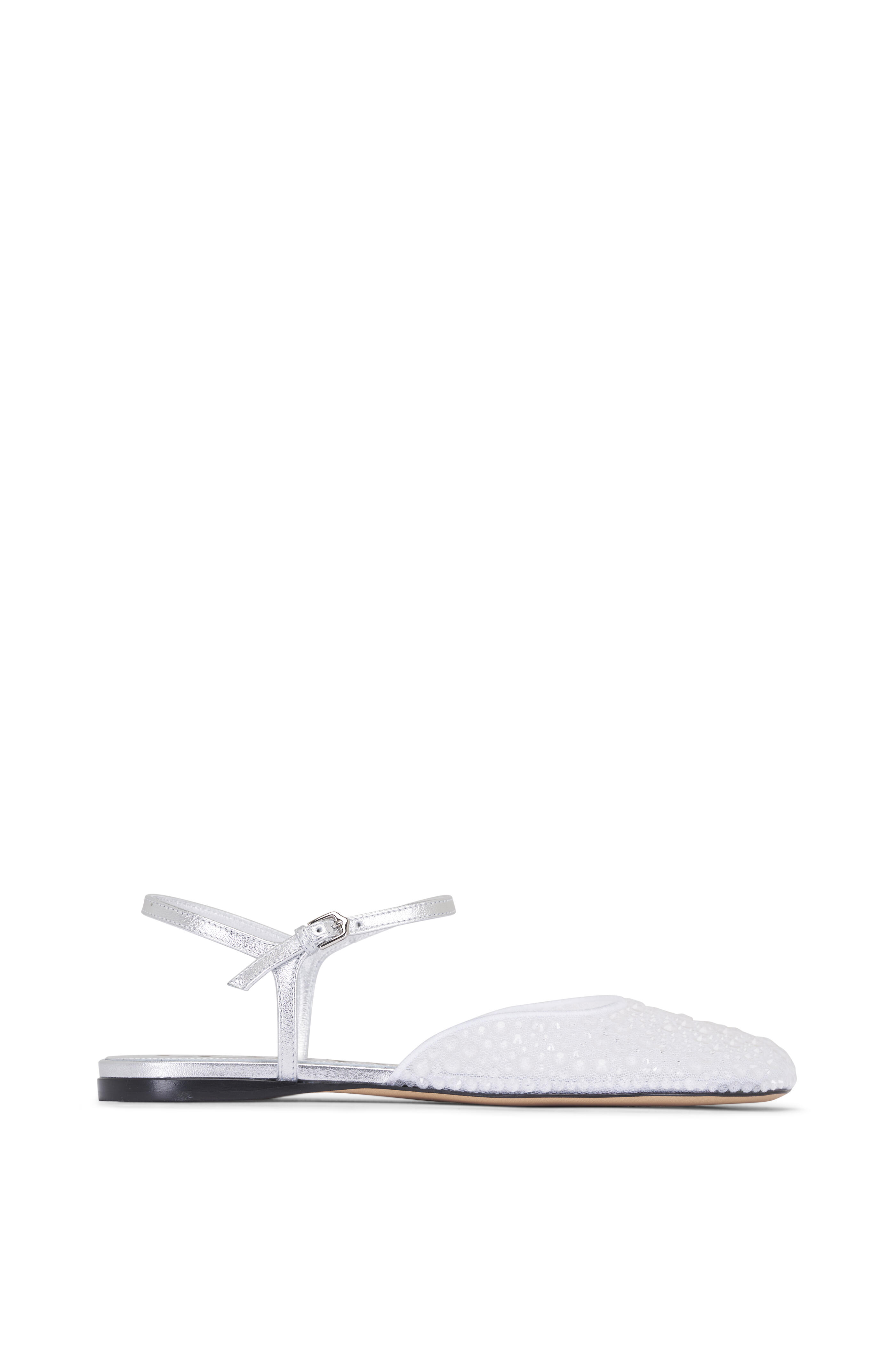 Embellished strassed mesh upper. Petal toe. Adjustable buckle ankle strap. Leather insole. Leather sole. Made in Italy.