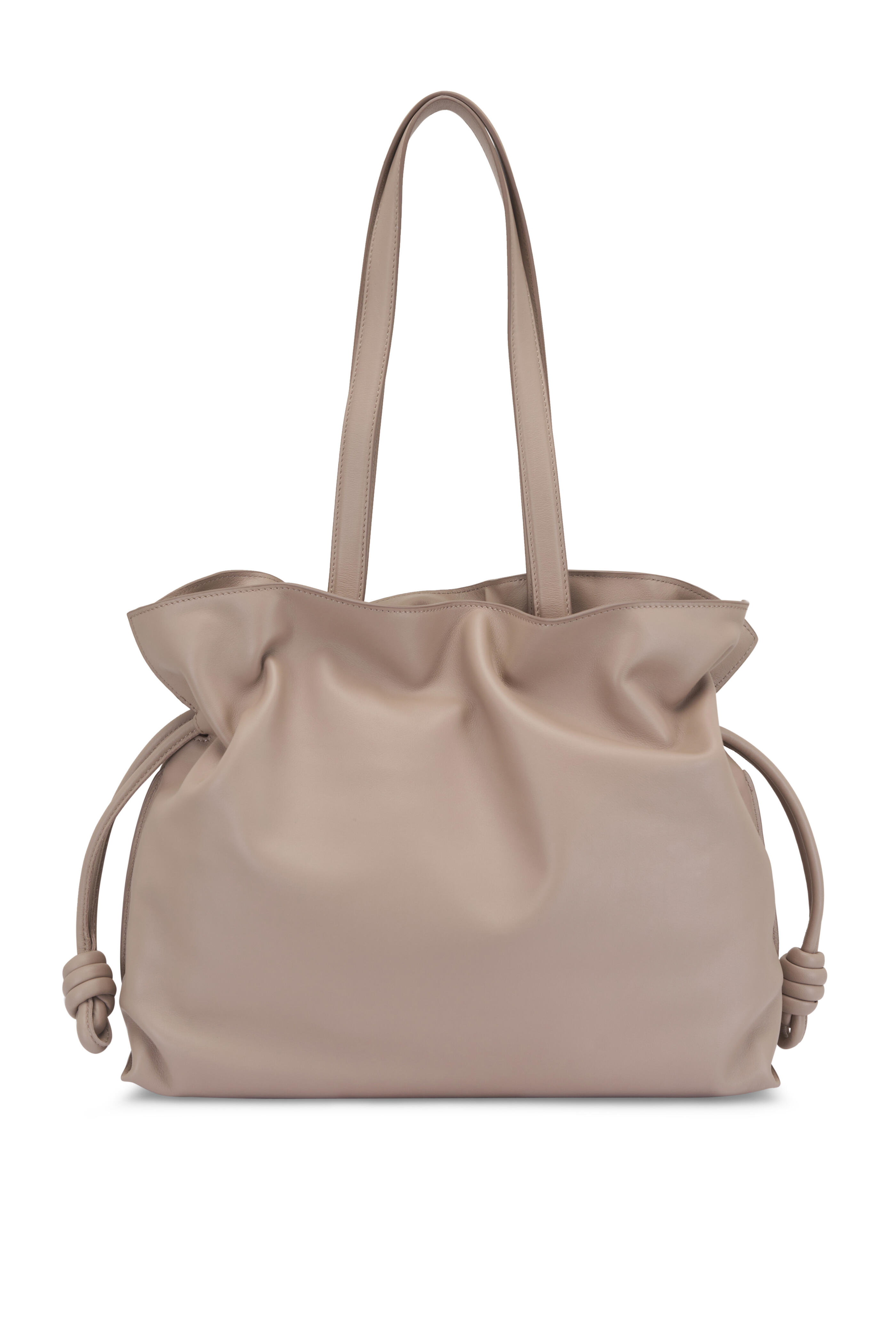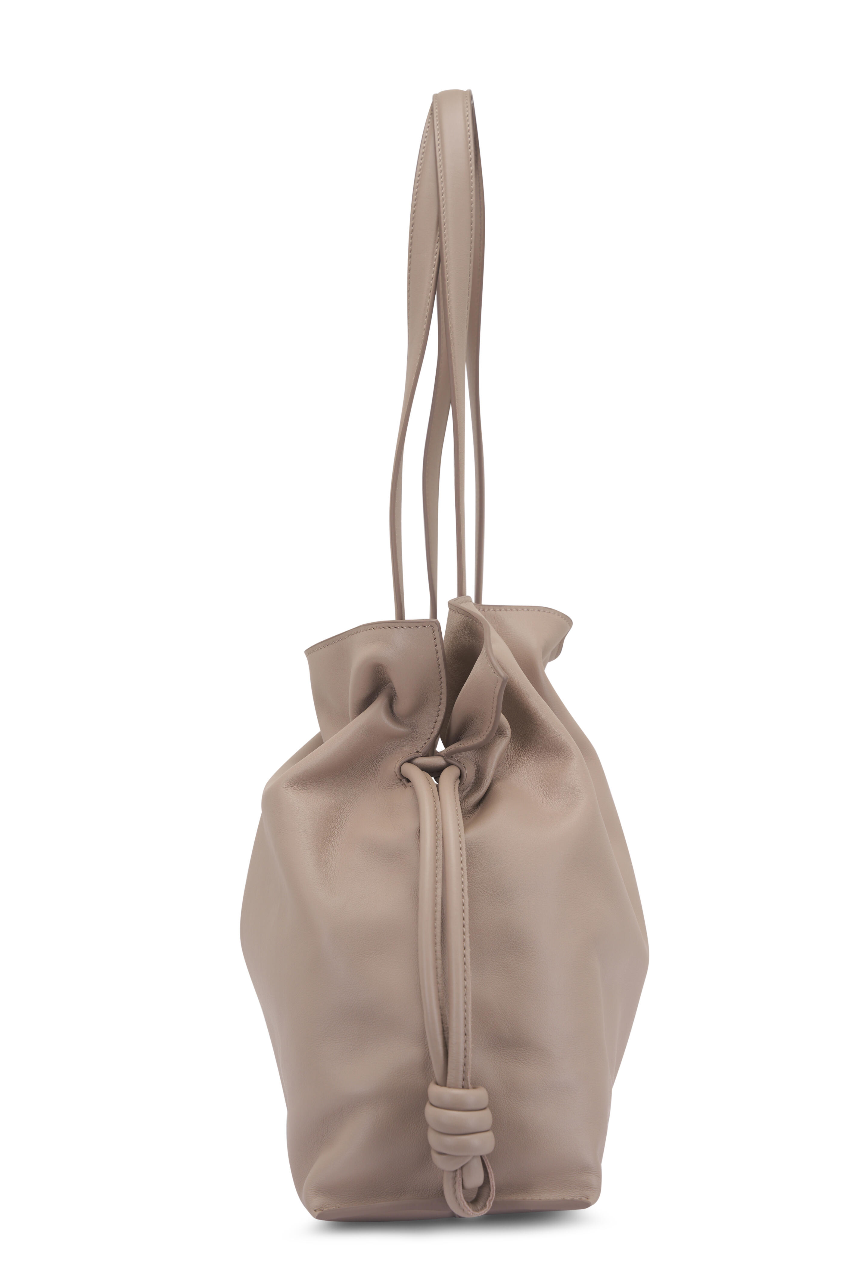 Nappa leather. Dual top shoulder straps. Drawstring top with magnetic closure. One main compartment; Interior zip pocket. Embossed logo detail. Herringbone cotton canvas lining. Made in Spain. Width: 15". Height: 11.4". Depth: 5.5". Strap drop: 12".