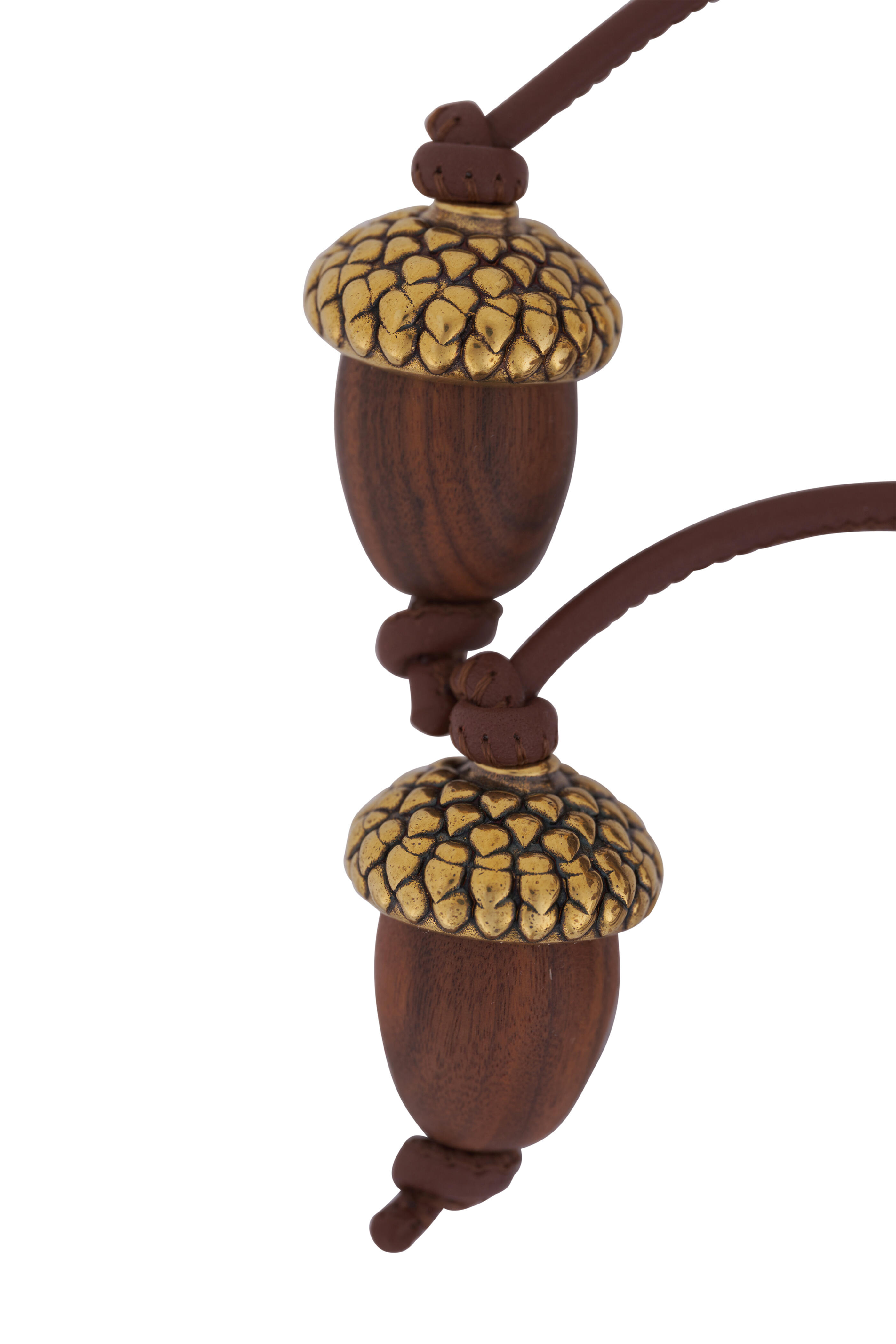 Wood. Leather cord and detailing. Lead free brass. Made in Spain. 7" height. 4.5" cord drop.