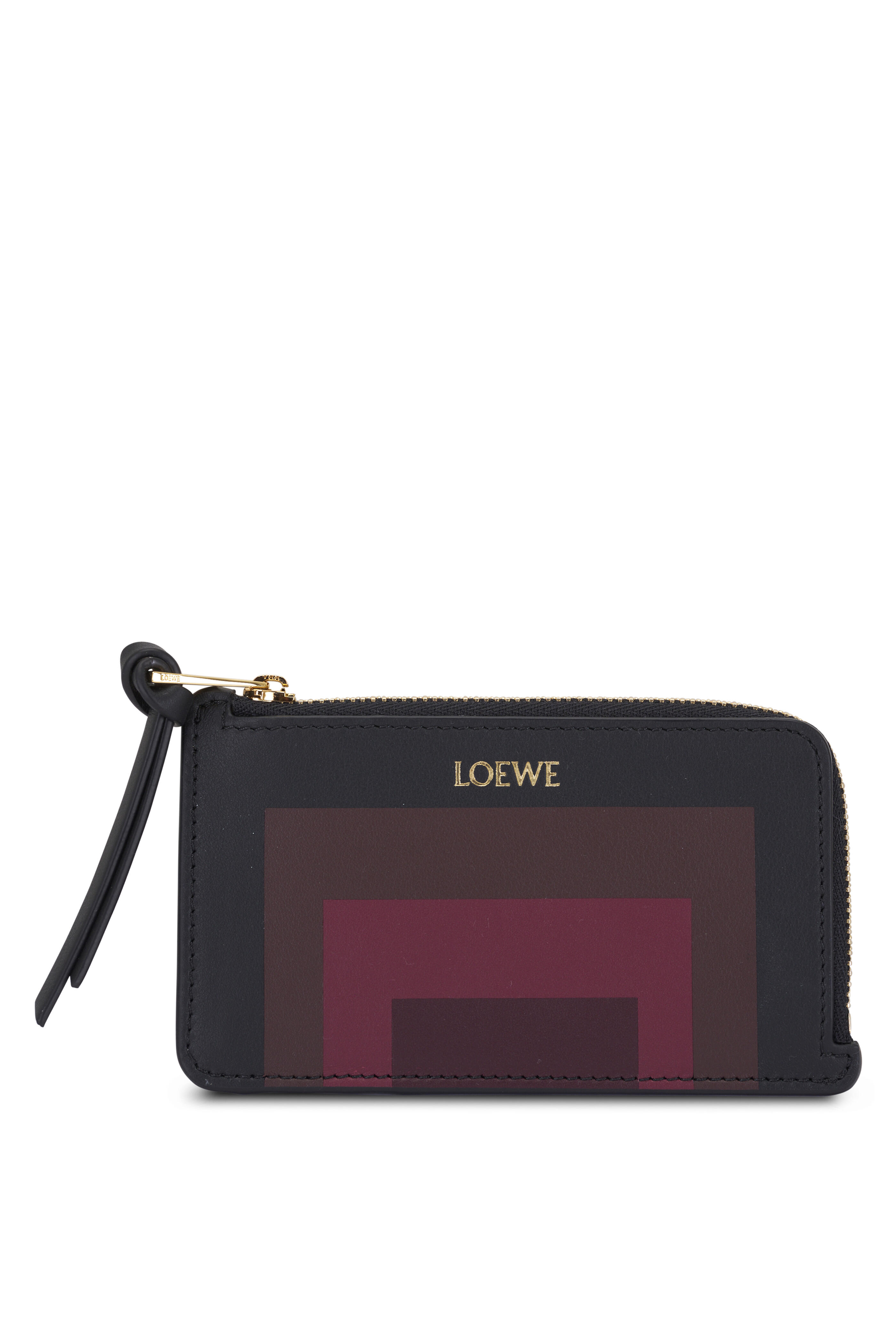 Calfskin leather. Top zip closure. Four card slots. Made in Spain. Height 3 in. Width 5.1 in. Depth 0.4 in.