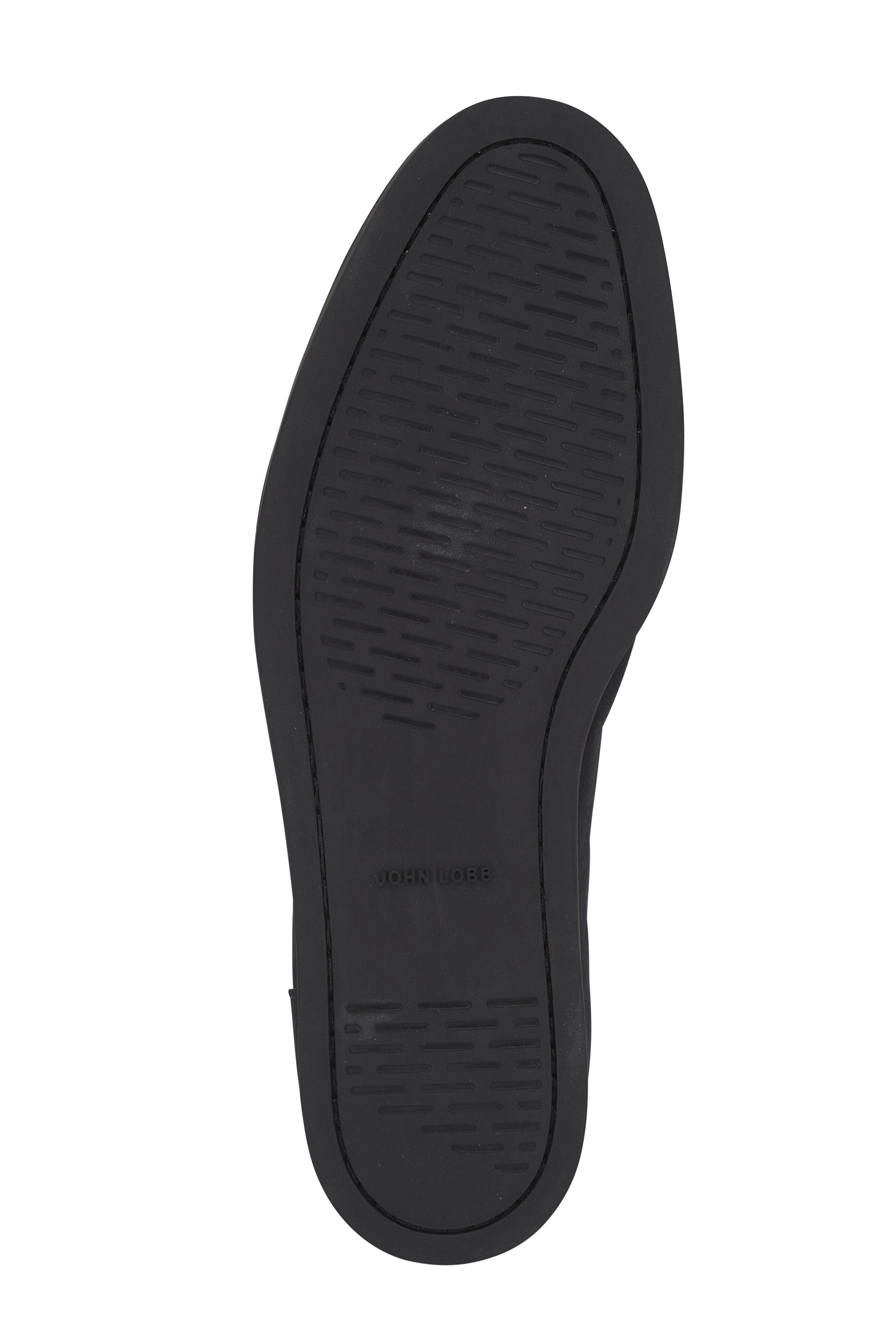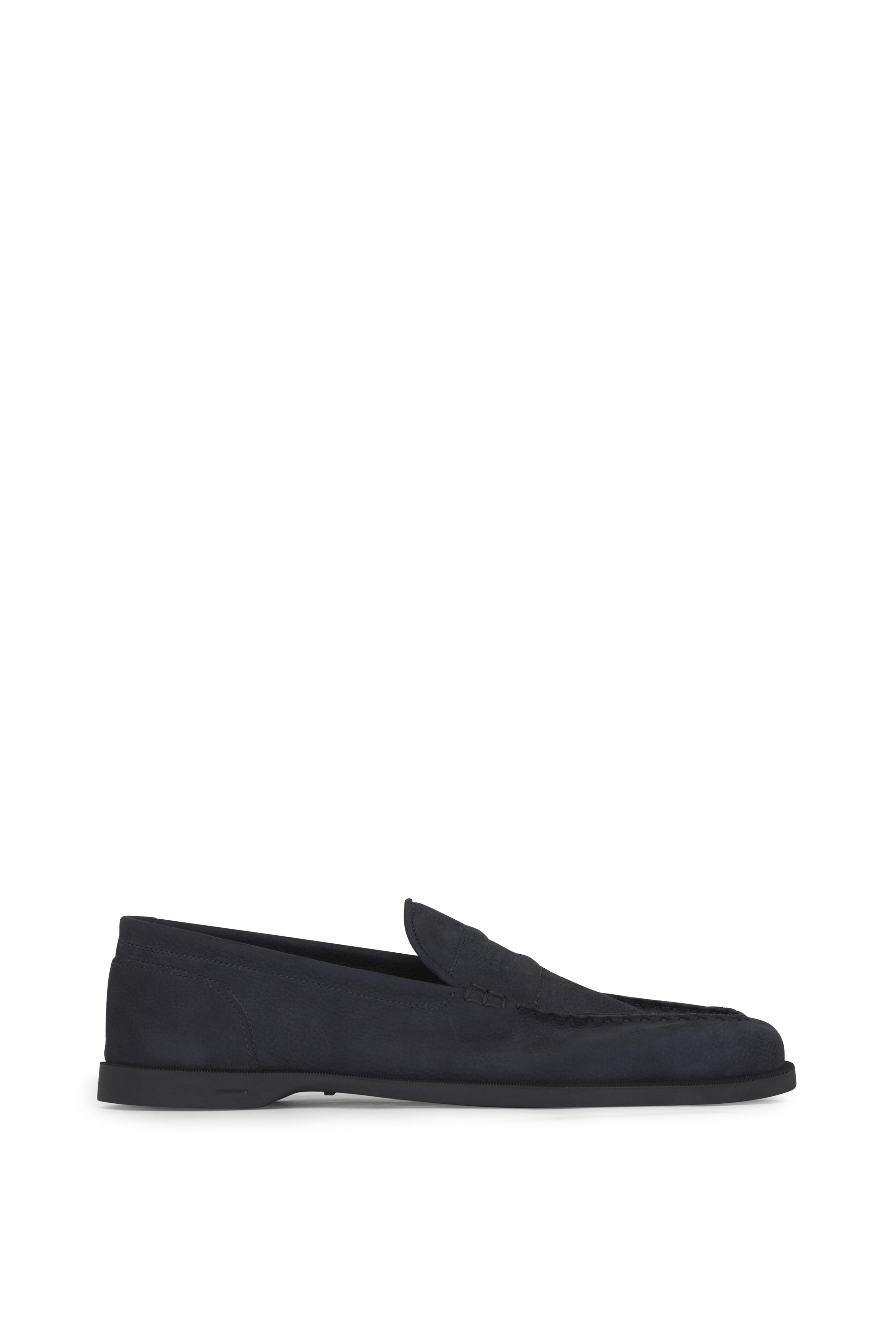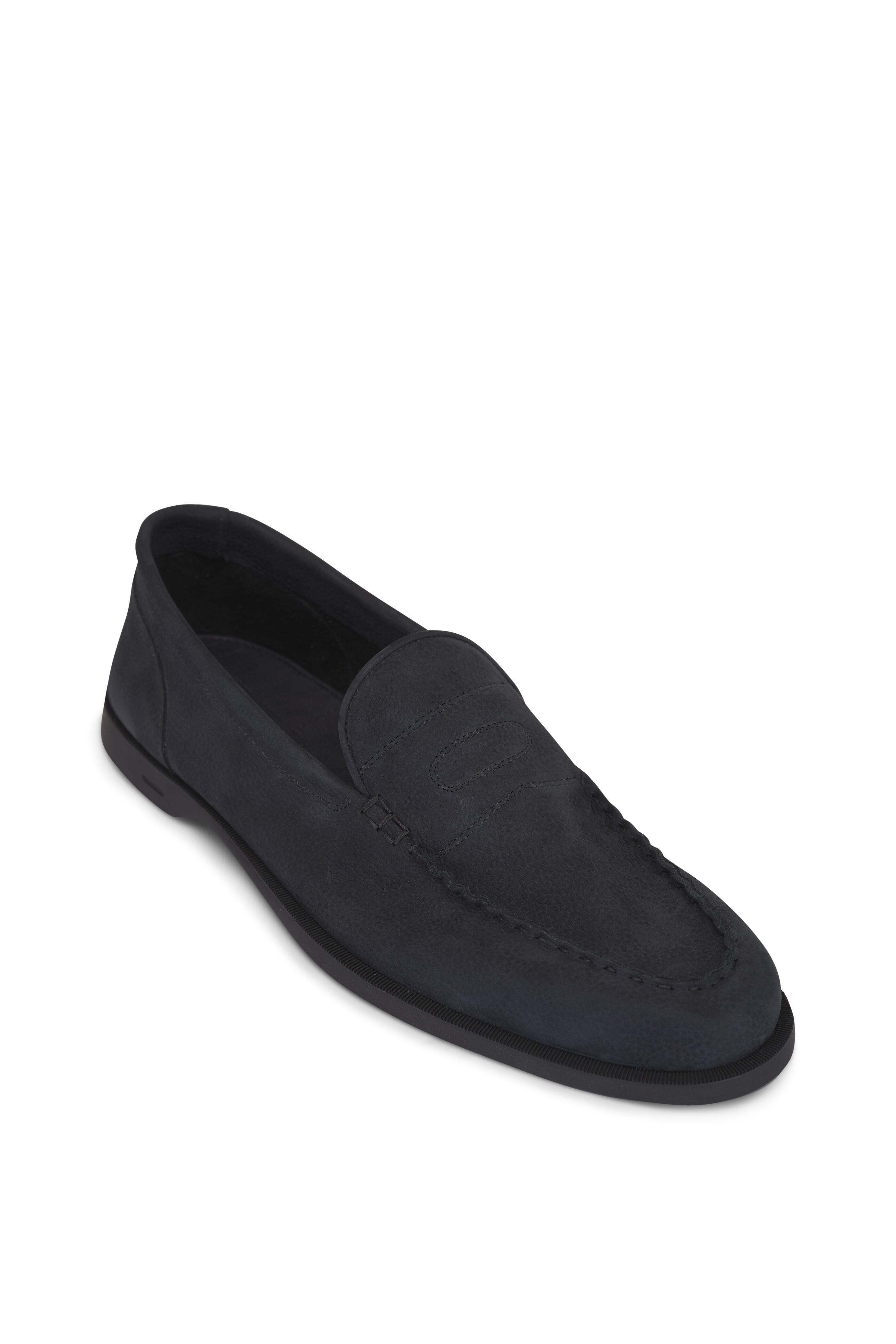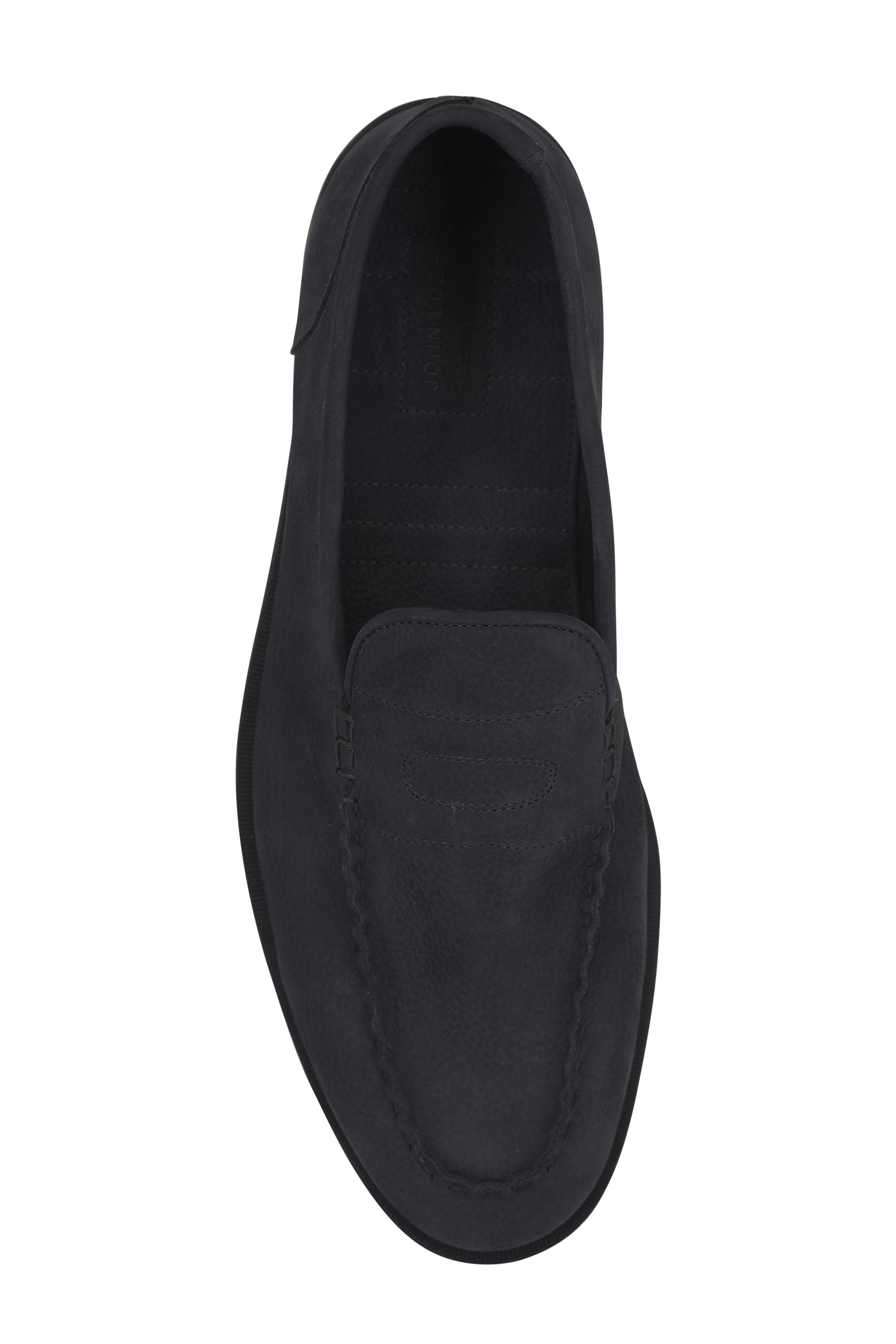Soft nubuck upper. Moc toe. Stitched penny strap at vamp. Unlined; nubuck insole. Rubber sole. Made in England.