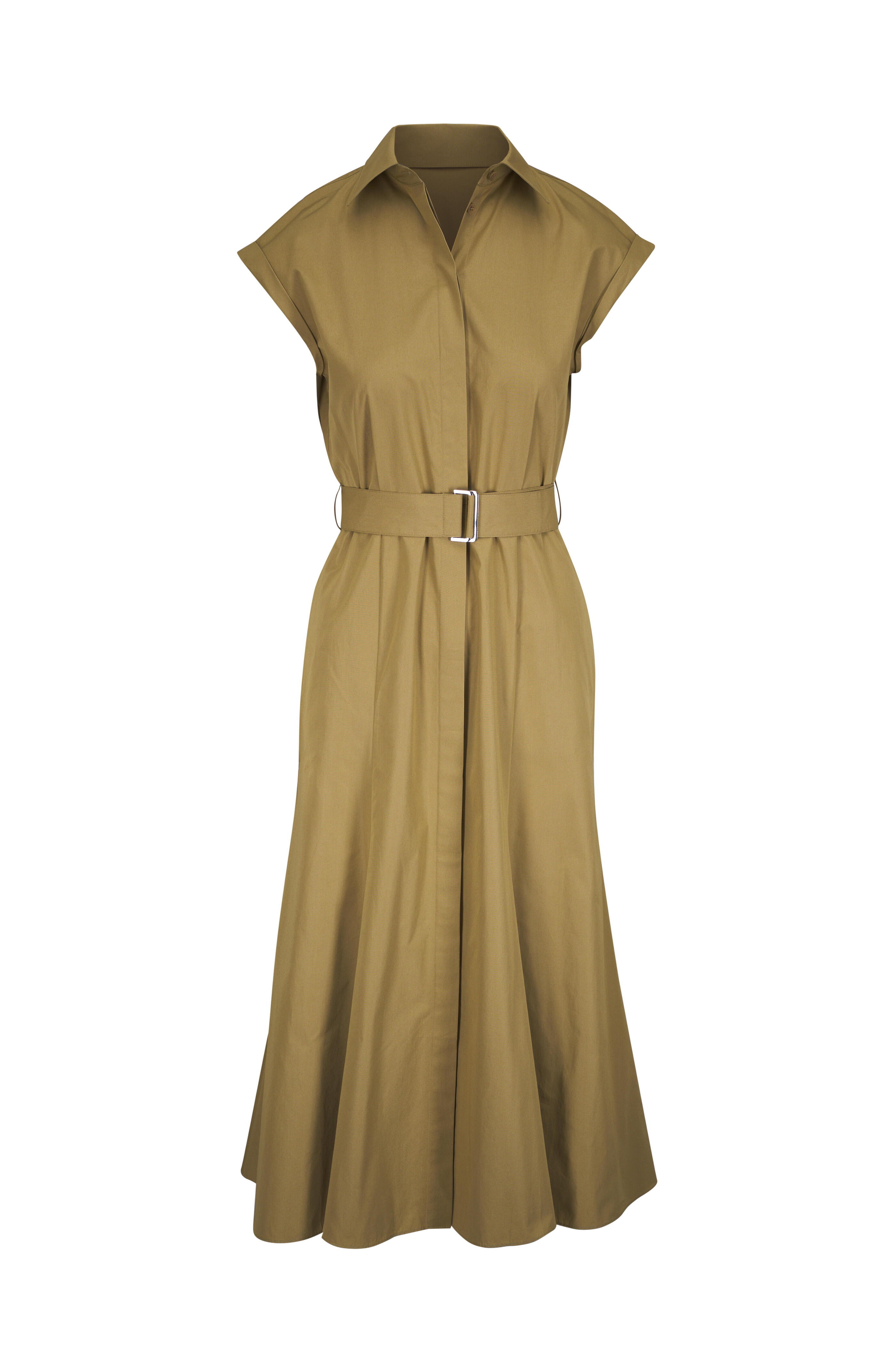 Spread collar. Concealed front button placket. Belt loops; adjustable d-ring belt. Side slip pockets. Cap sleeves. Imported. Approximately 46" shoulder to hem (measurements taken from size 4). 100% cotton. Machine wash.