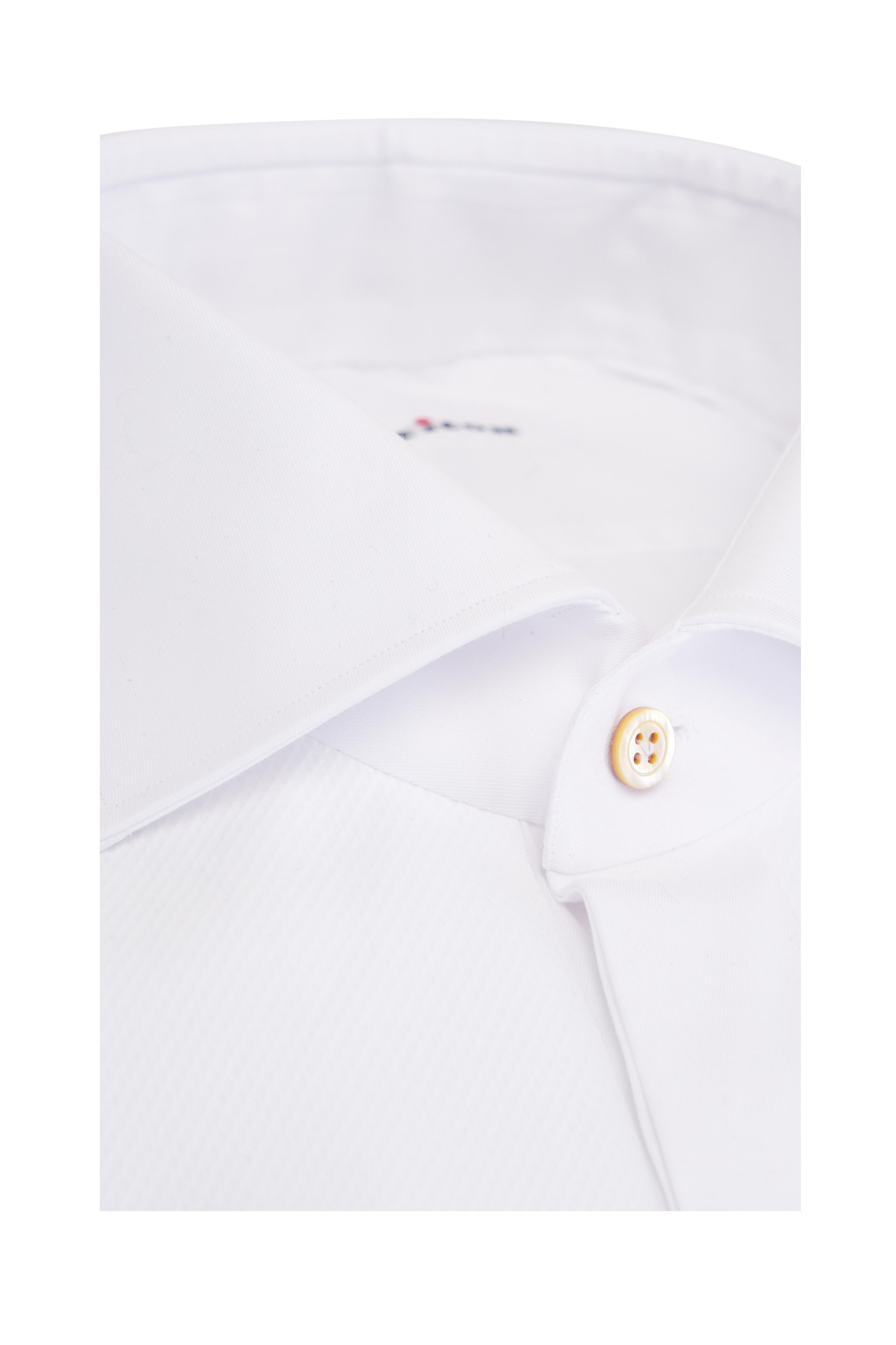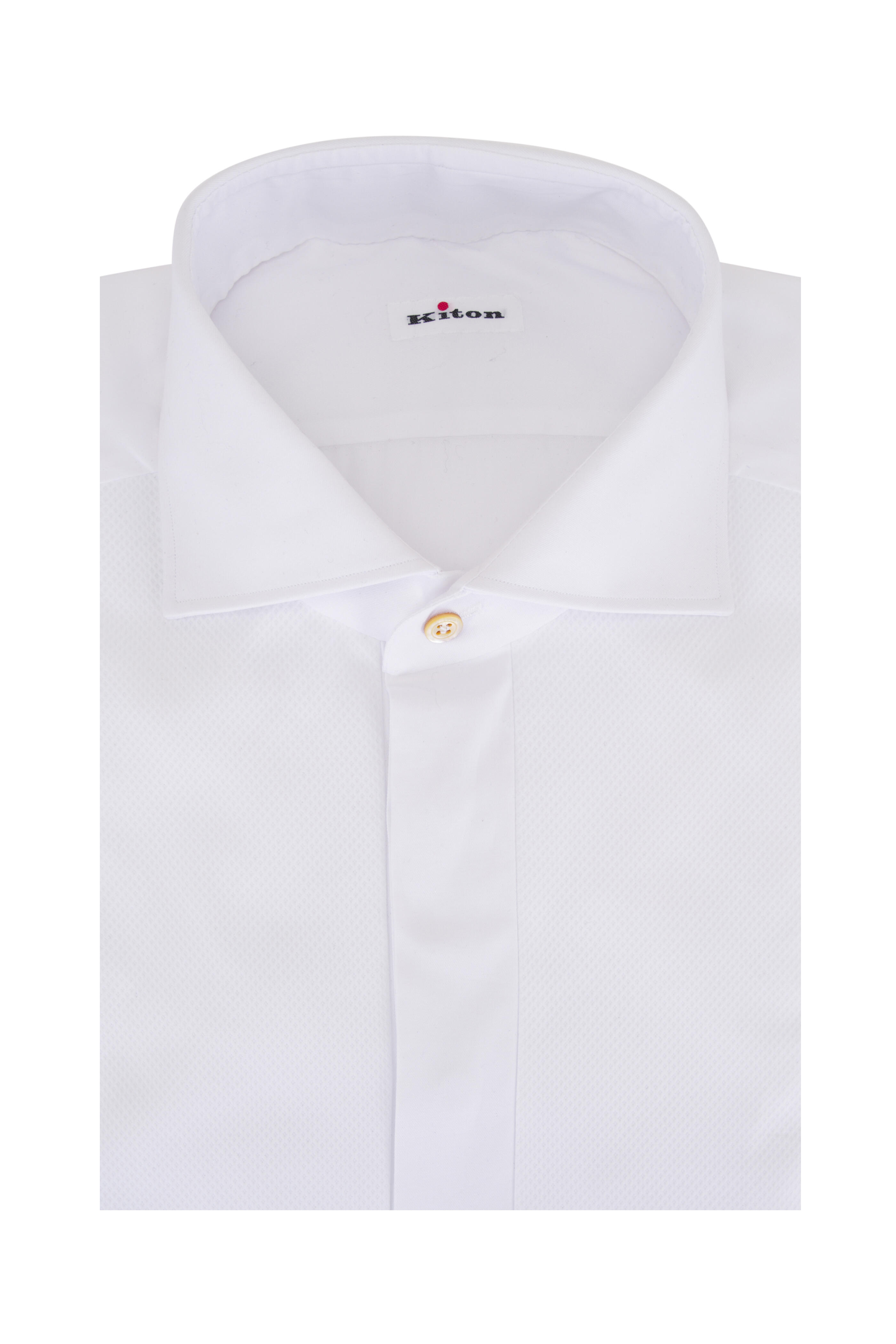 Point collar. Concealed front button placket. Single button square cuffs. Made in Italy. 100% cotton. Dry clean.
