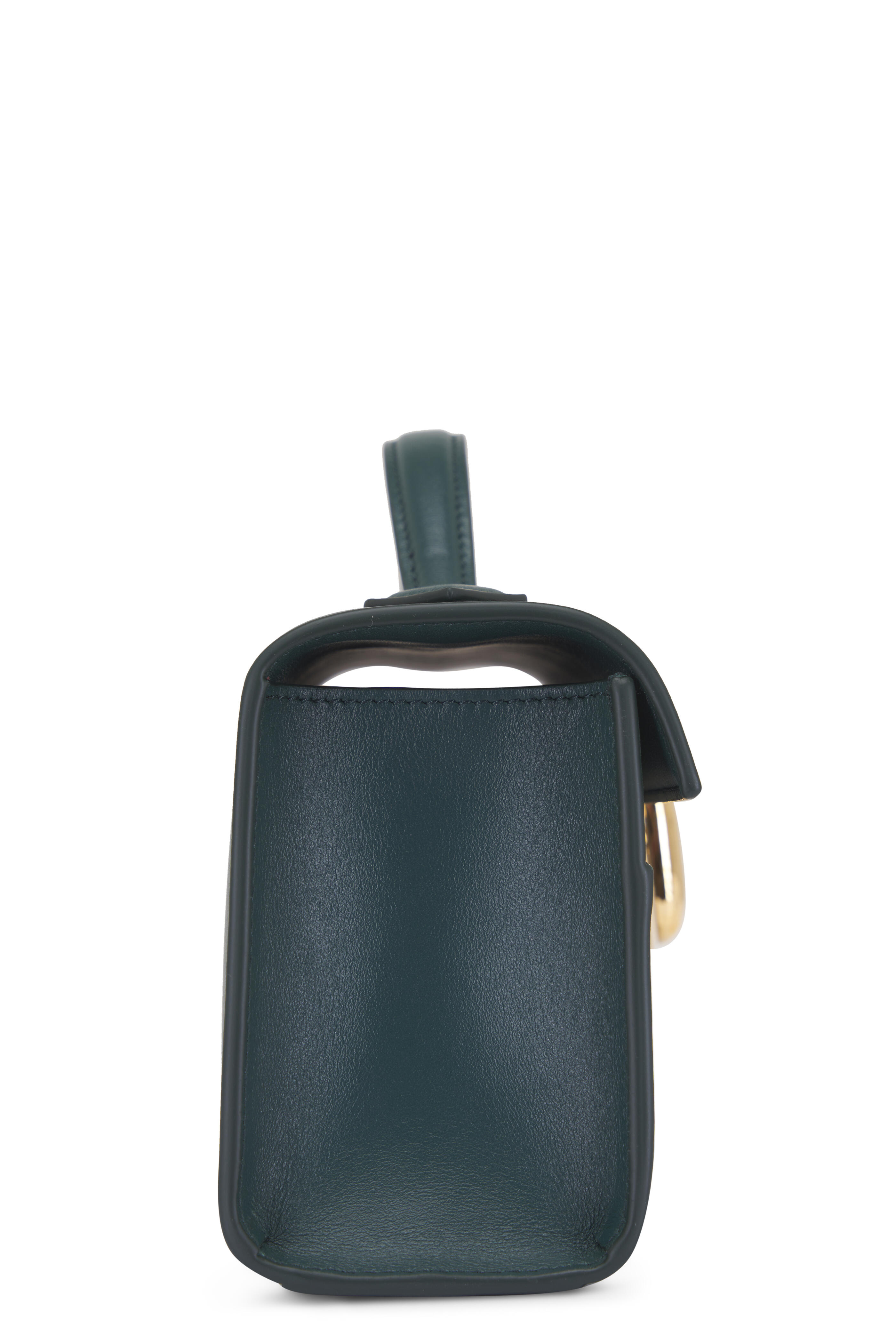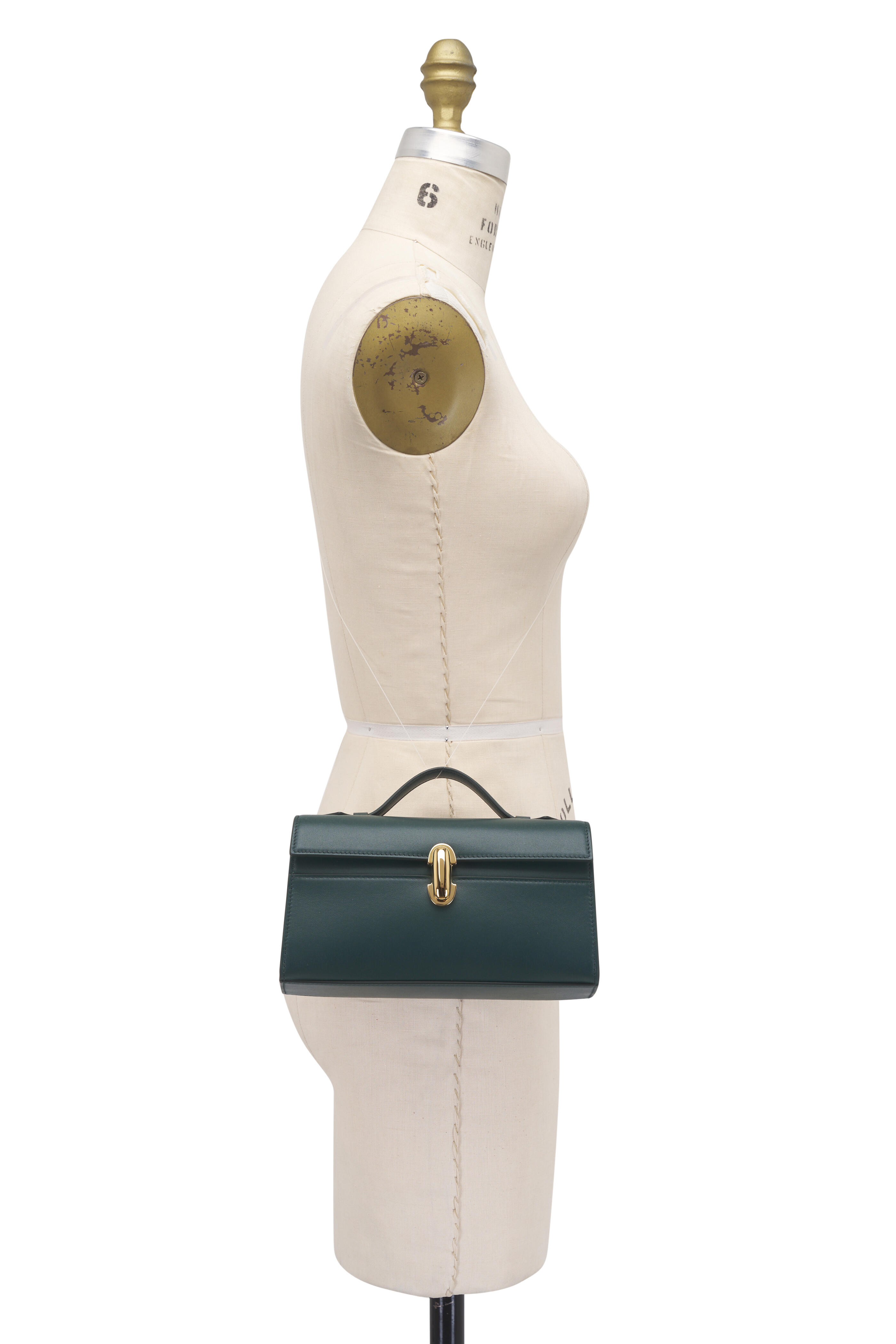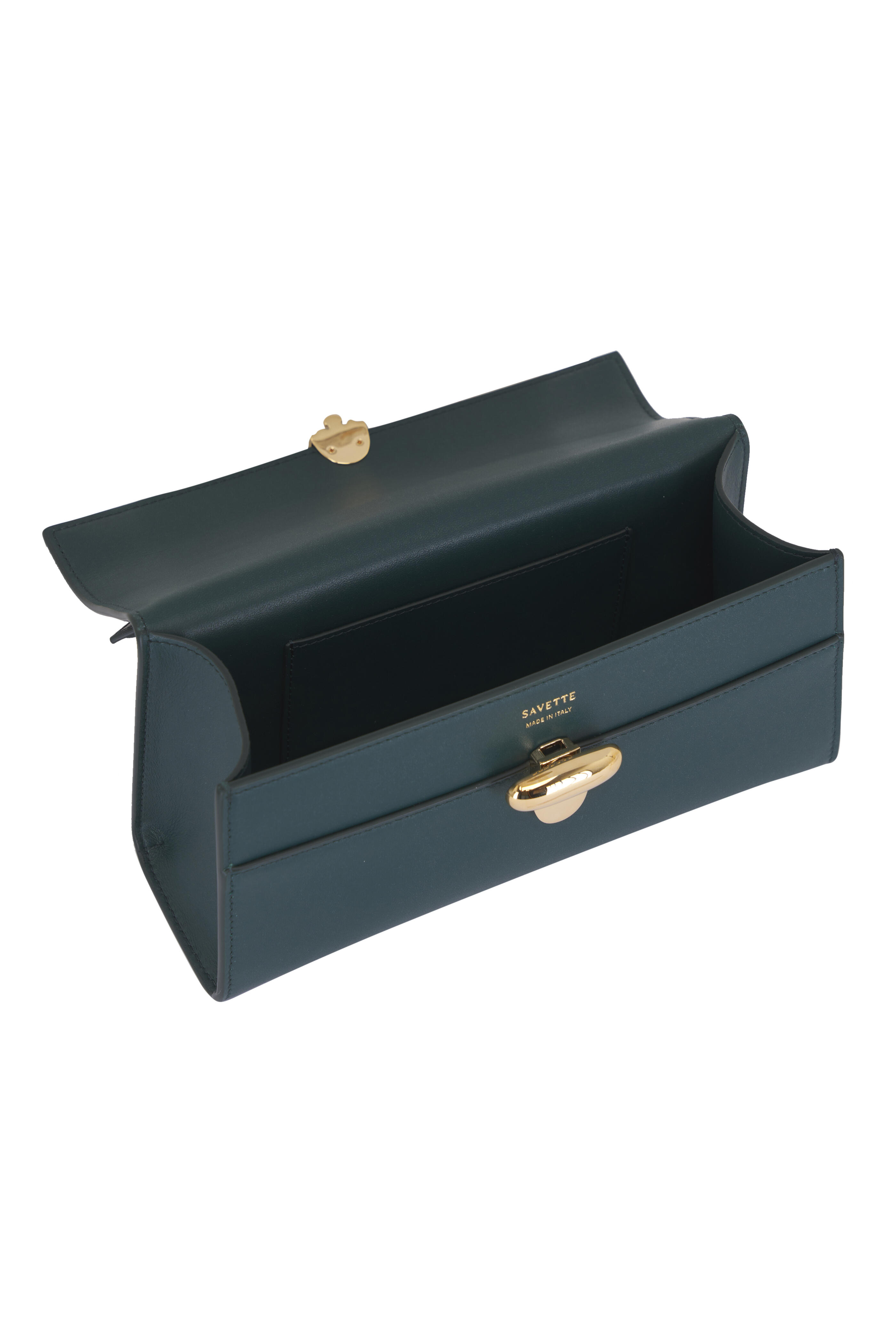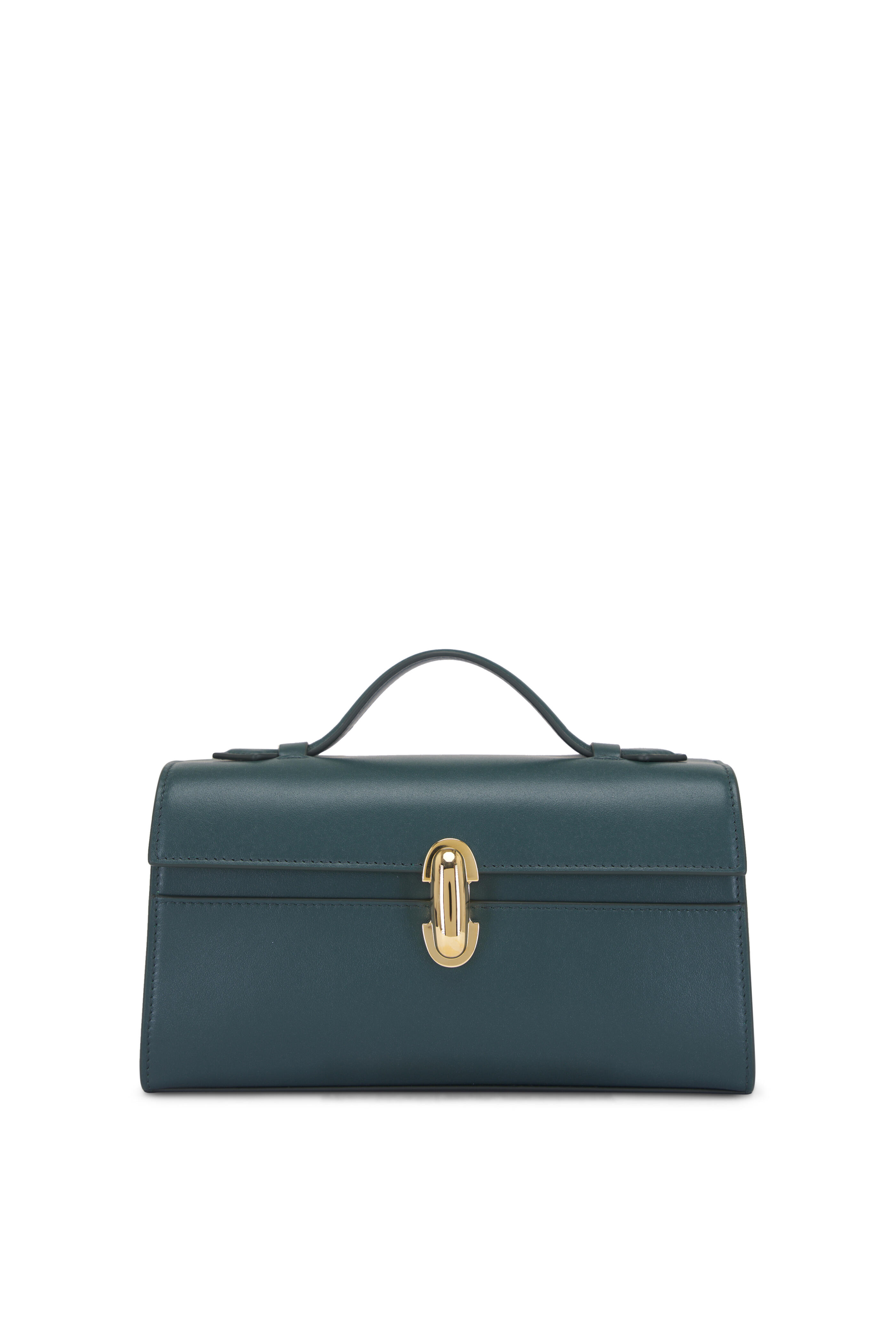 Calf leather. Single top handle. Turn lock closure. One interior pocket. Made in Italy. 9 inches long x 5 inches wide x 3 inches deep.