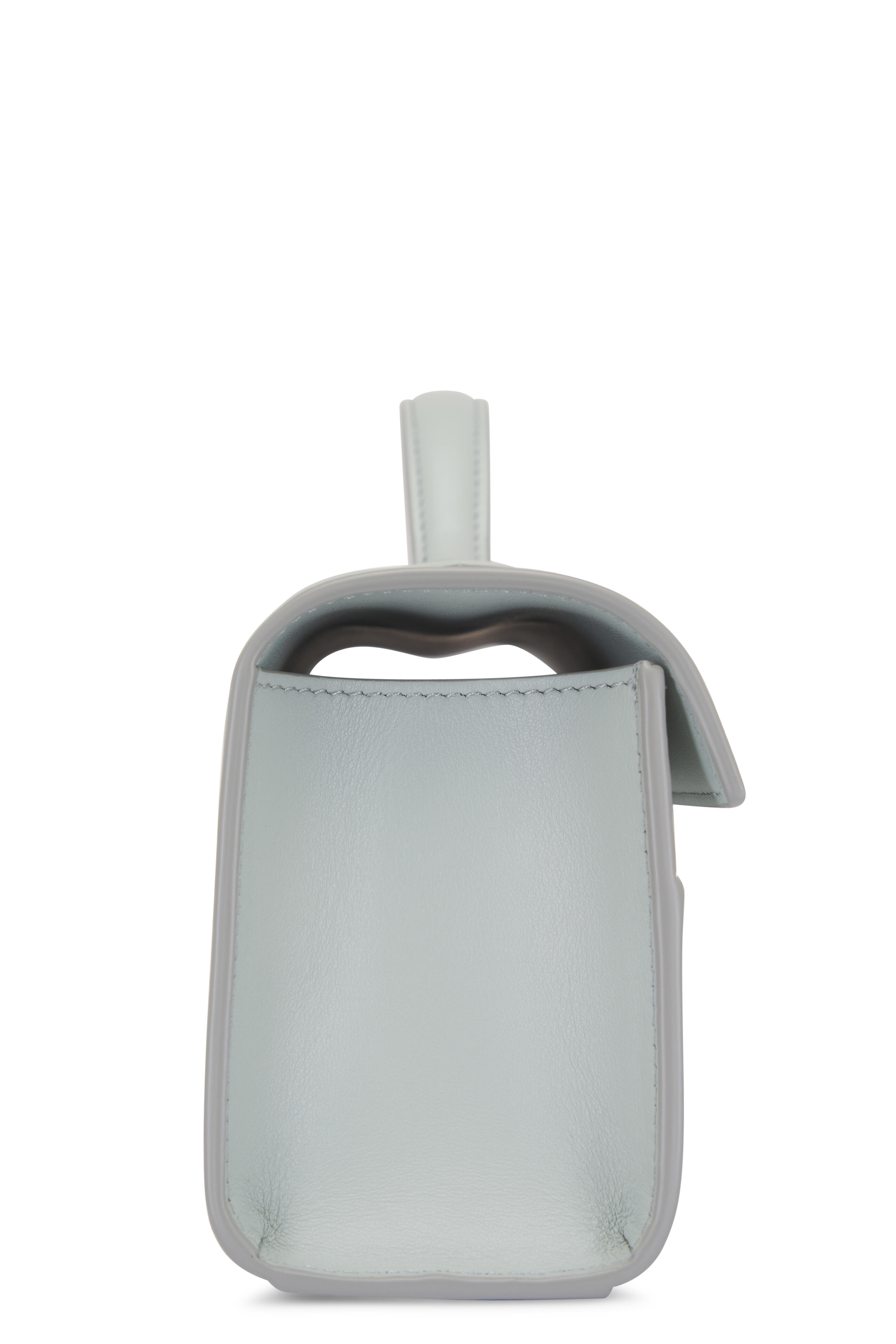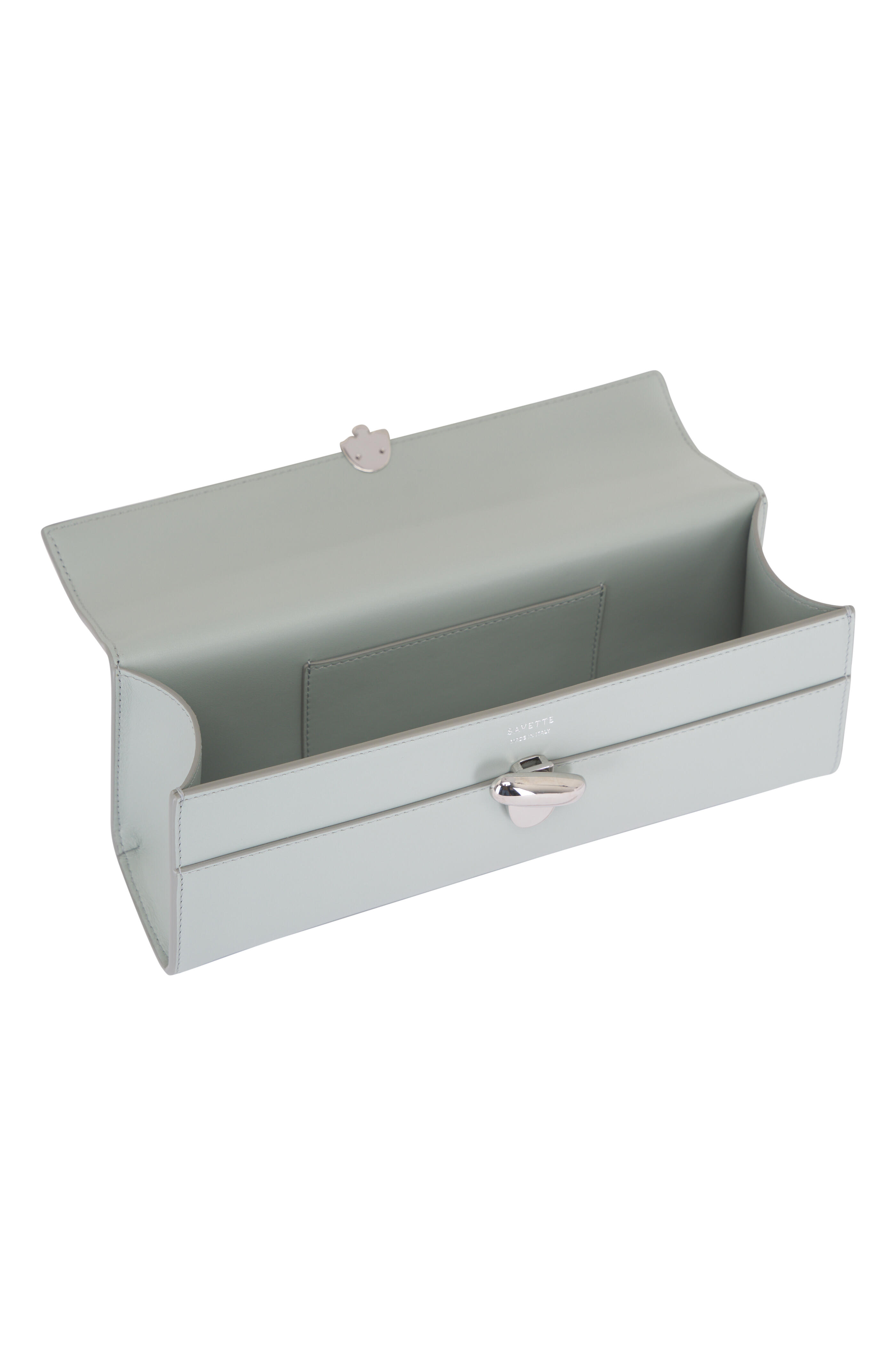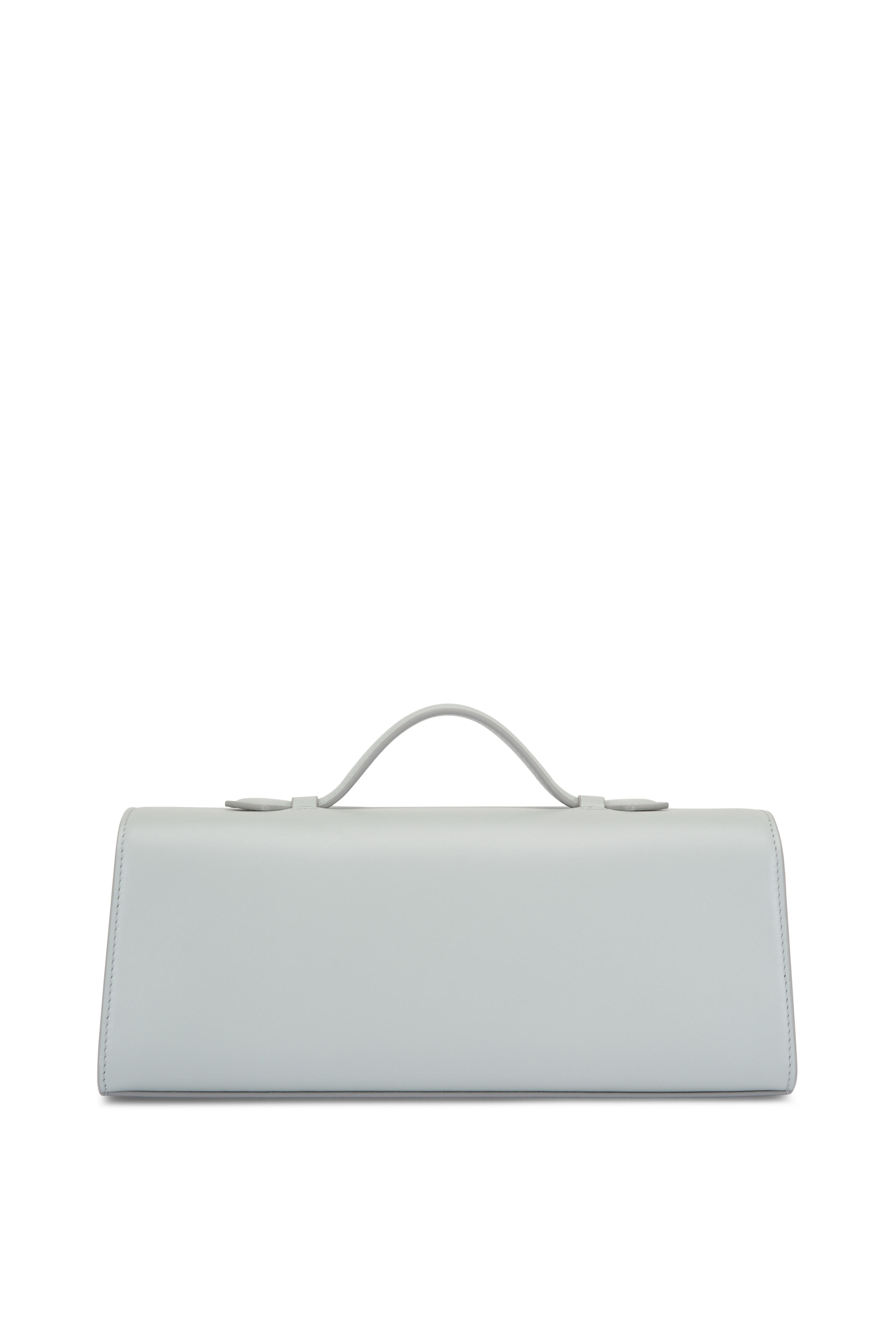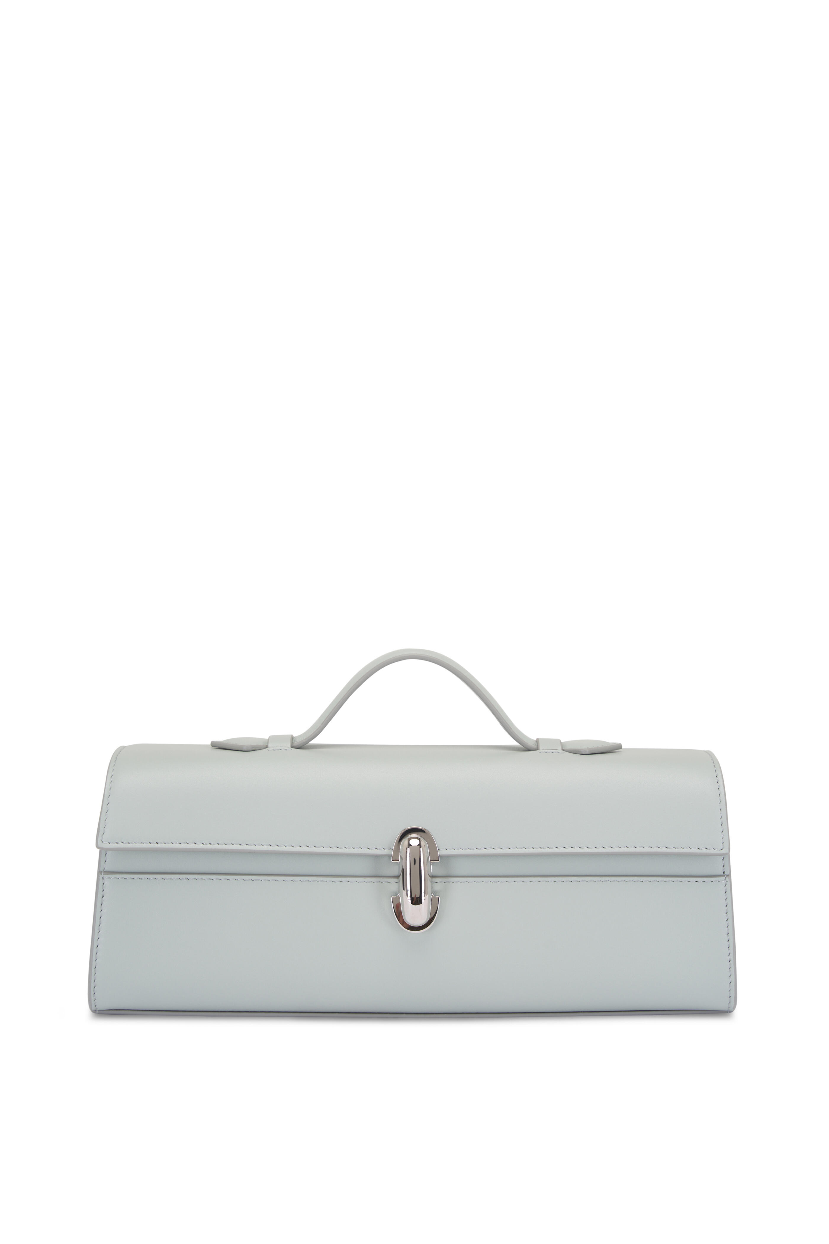 Leather. Flap closure with turn lock. Single top handle. Single compartment. Interior wall pocket. Leather lining. Made in Italy. Length: 11". Width: 4.5". Depth: 3".
