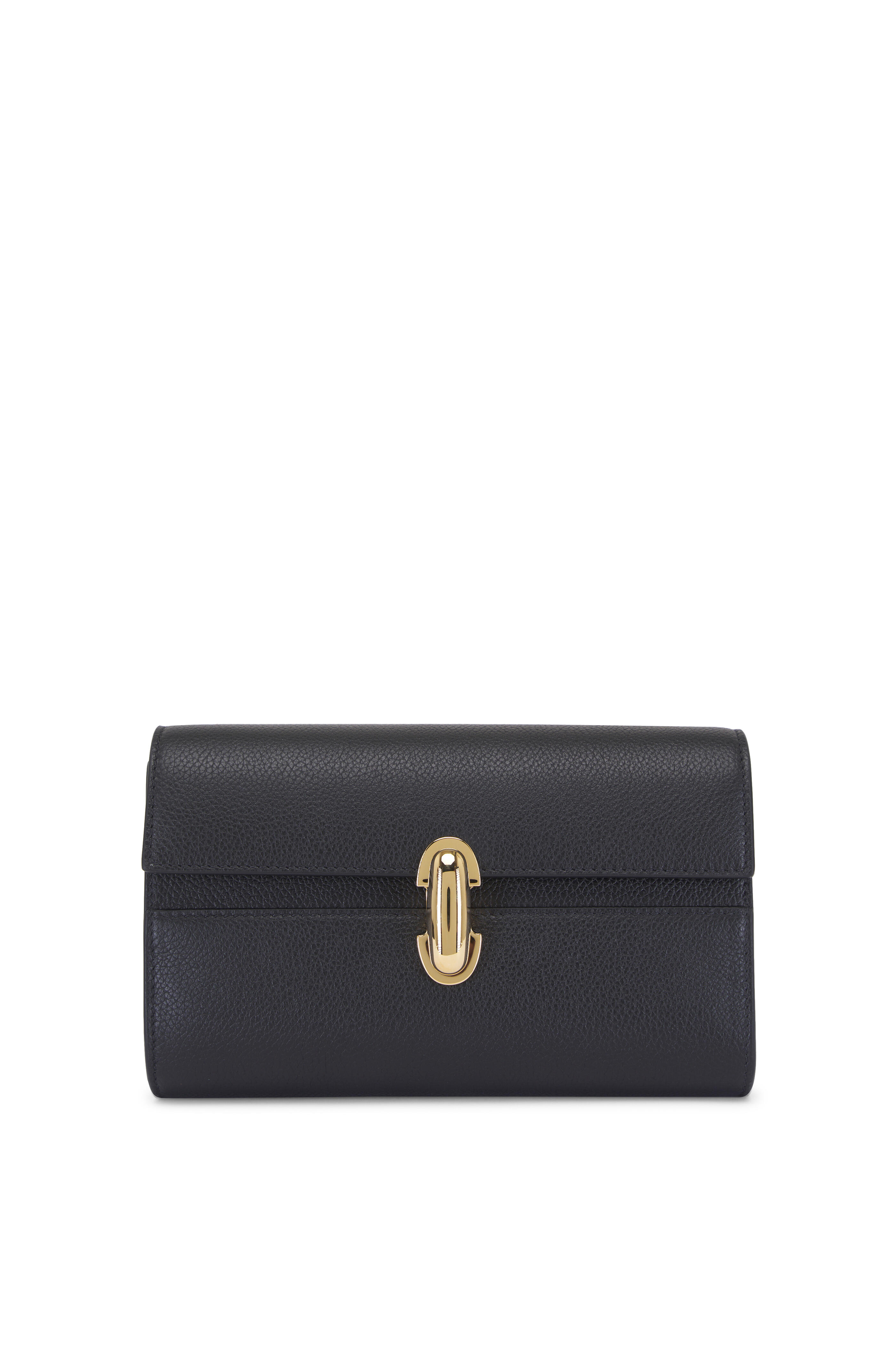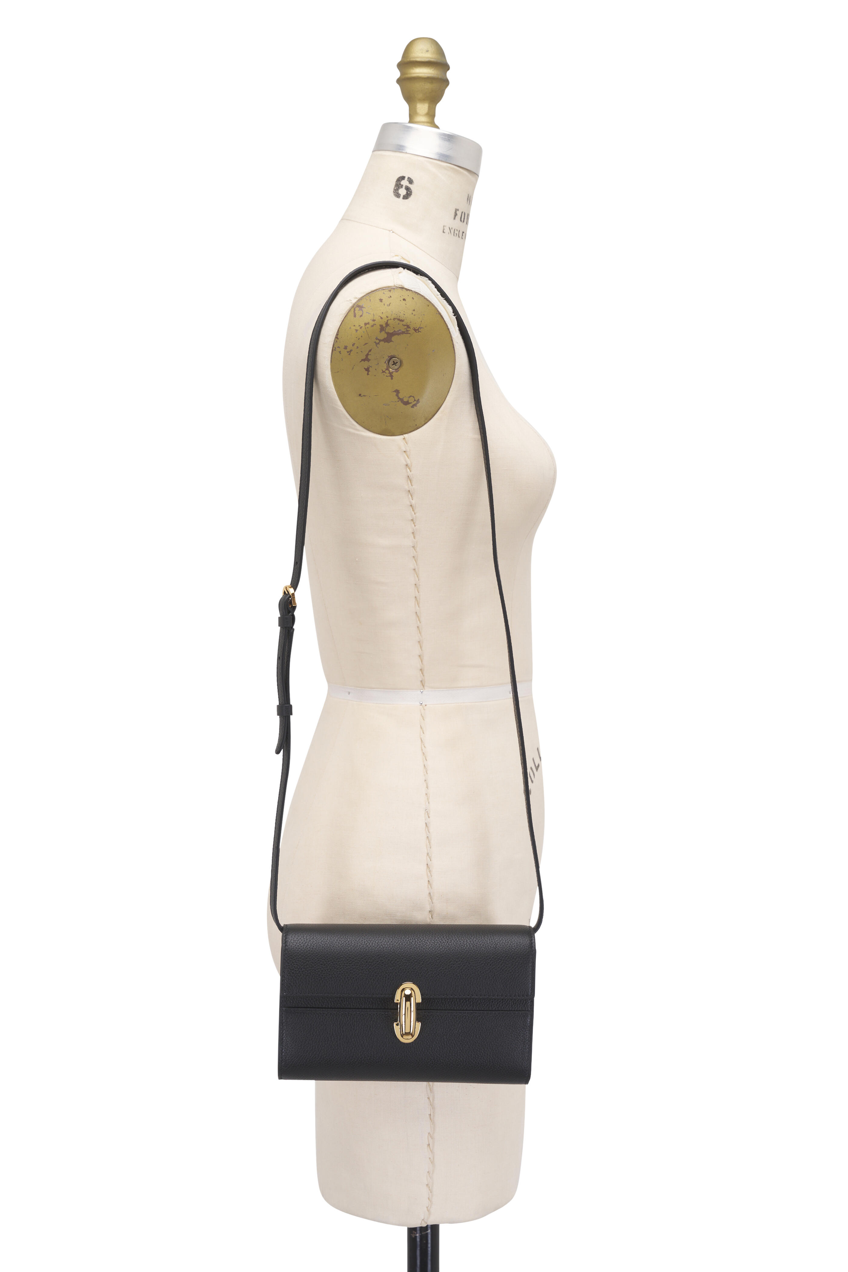 Calf leather. Adjustable and removable leather shoulder or crossbody strap. Turn lock closure. Interior card slot. Made in Italy. 7 inches long x 5 inches wide x 1 inch deep. Can hold a smart phone, cards, few small items.