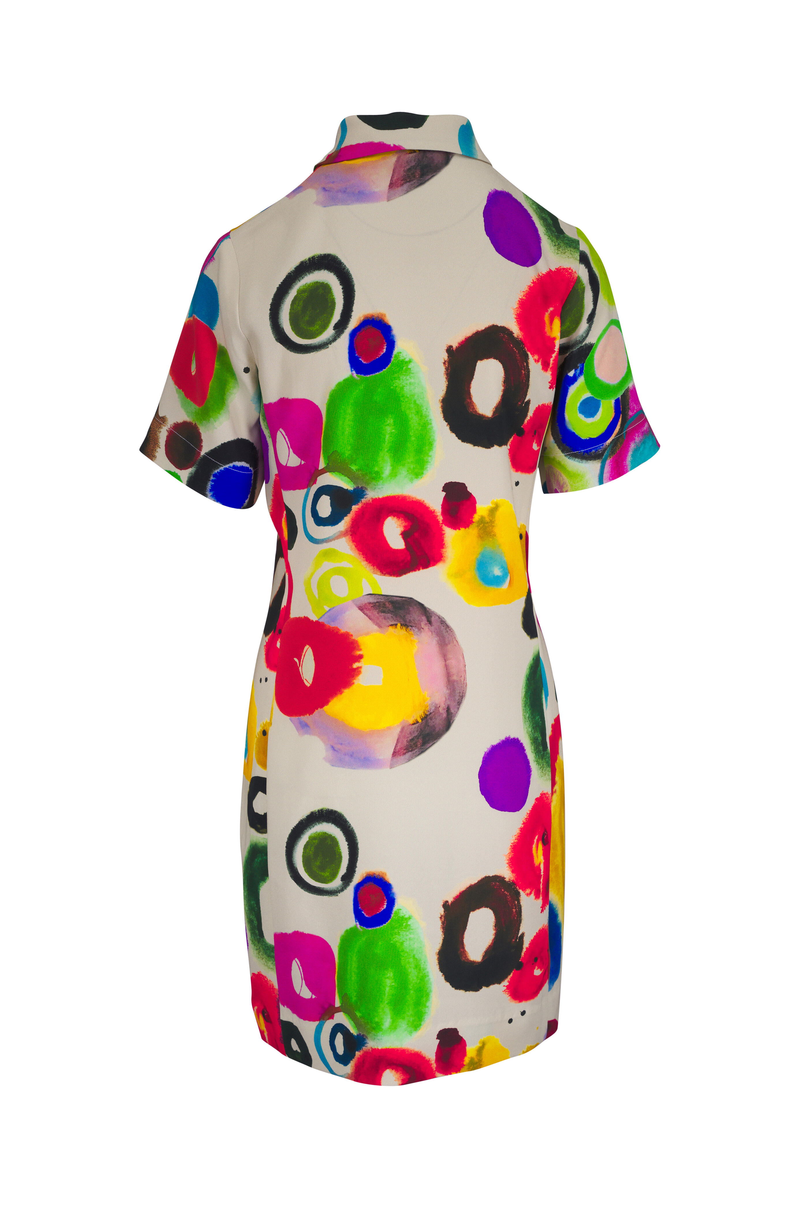 Spread collar. Partial front button placket. Side slip pockets. Made in the USA. Approximately 36" shoulder to hem (measurements taken from size S). 94% silk, 6% elastane. Dry clean.