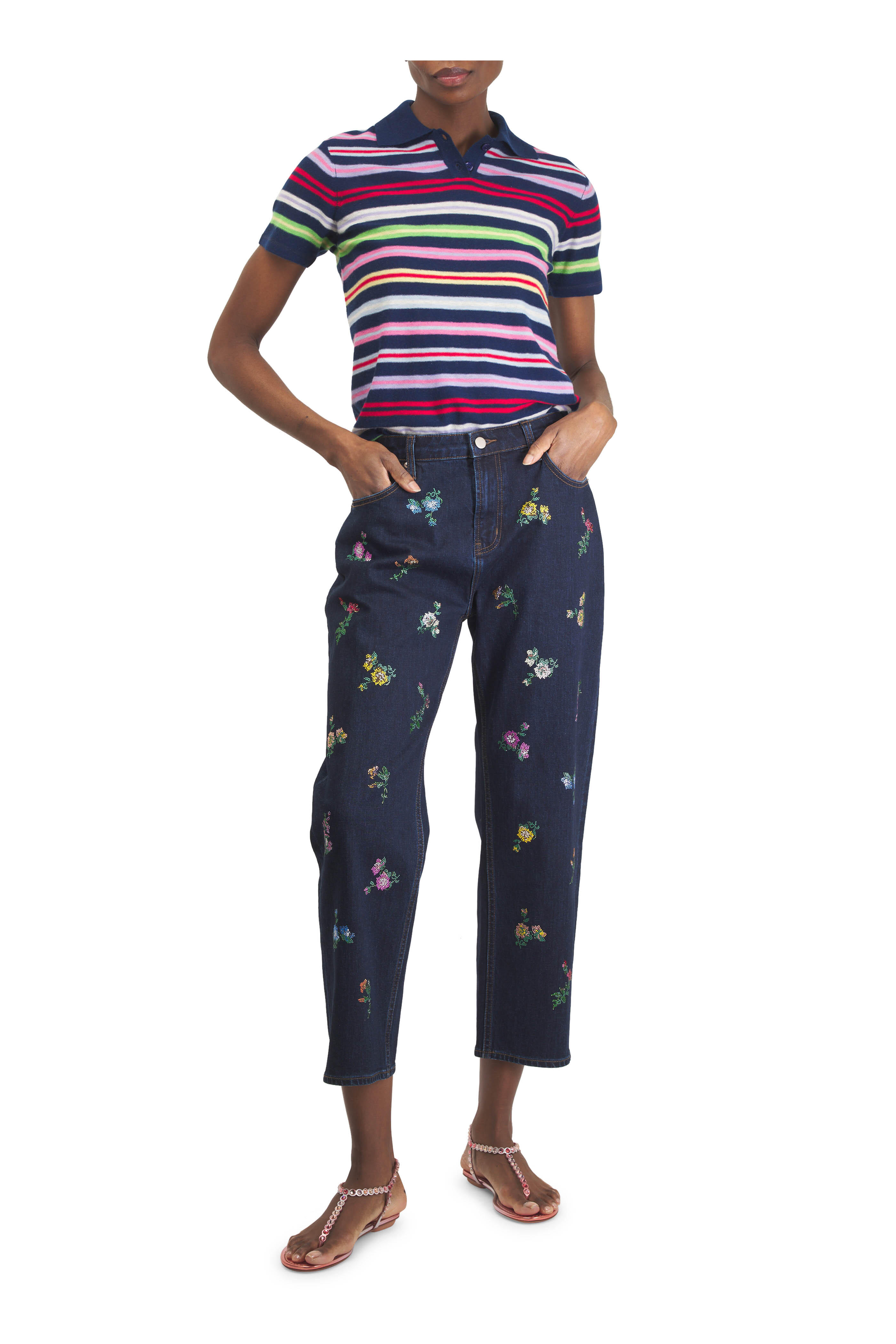 Zip fly; button closure. Five pocket styling. Hand made embellished details throughout. Straight hem. Made in Italy. 26" Inseam (size s). 97% cotton, 3% elastane. Dry clean.