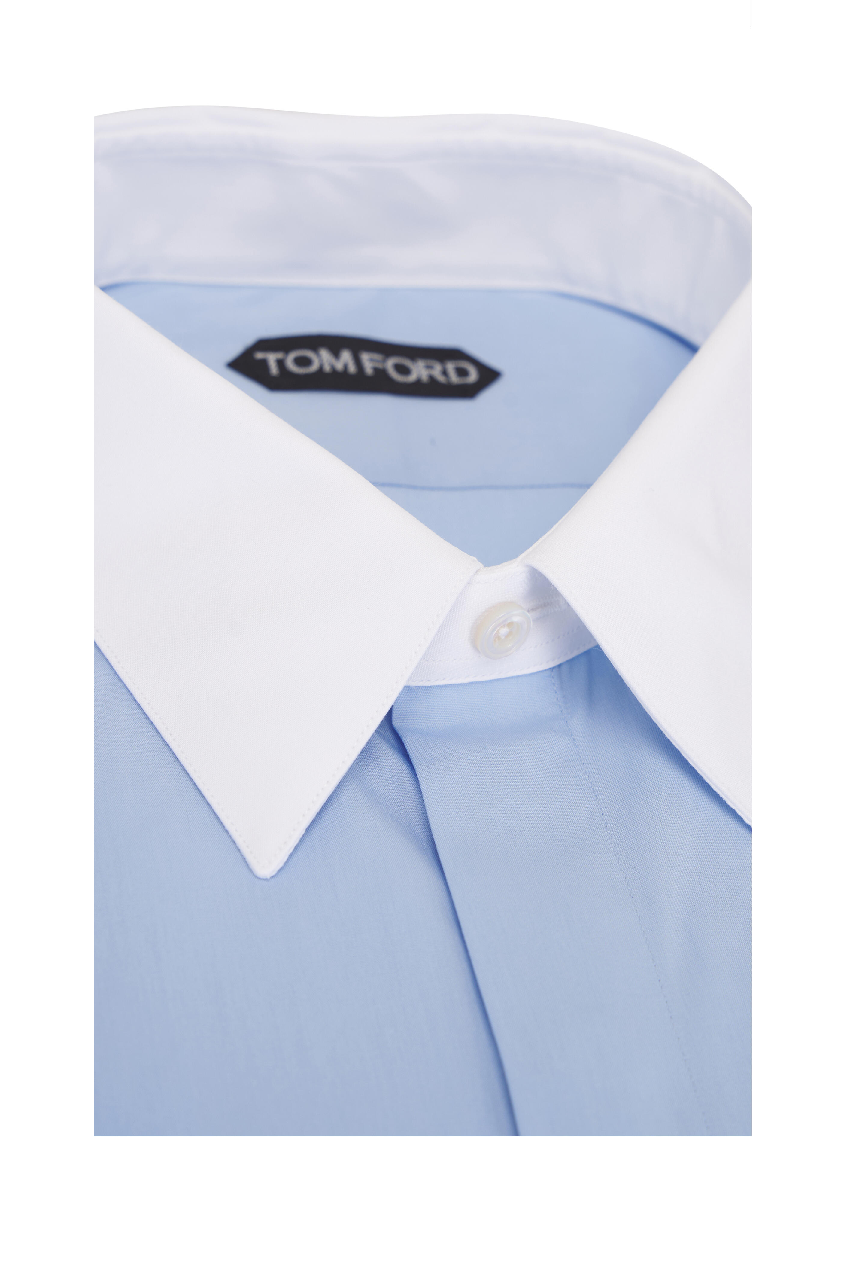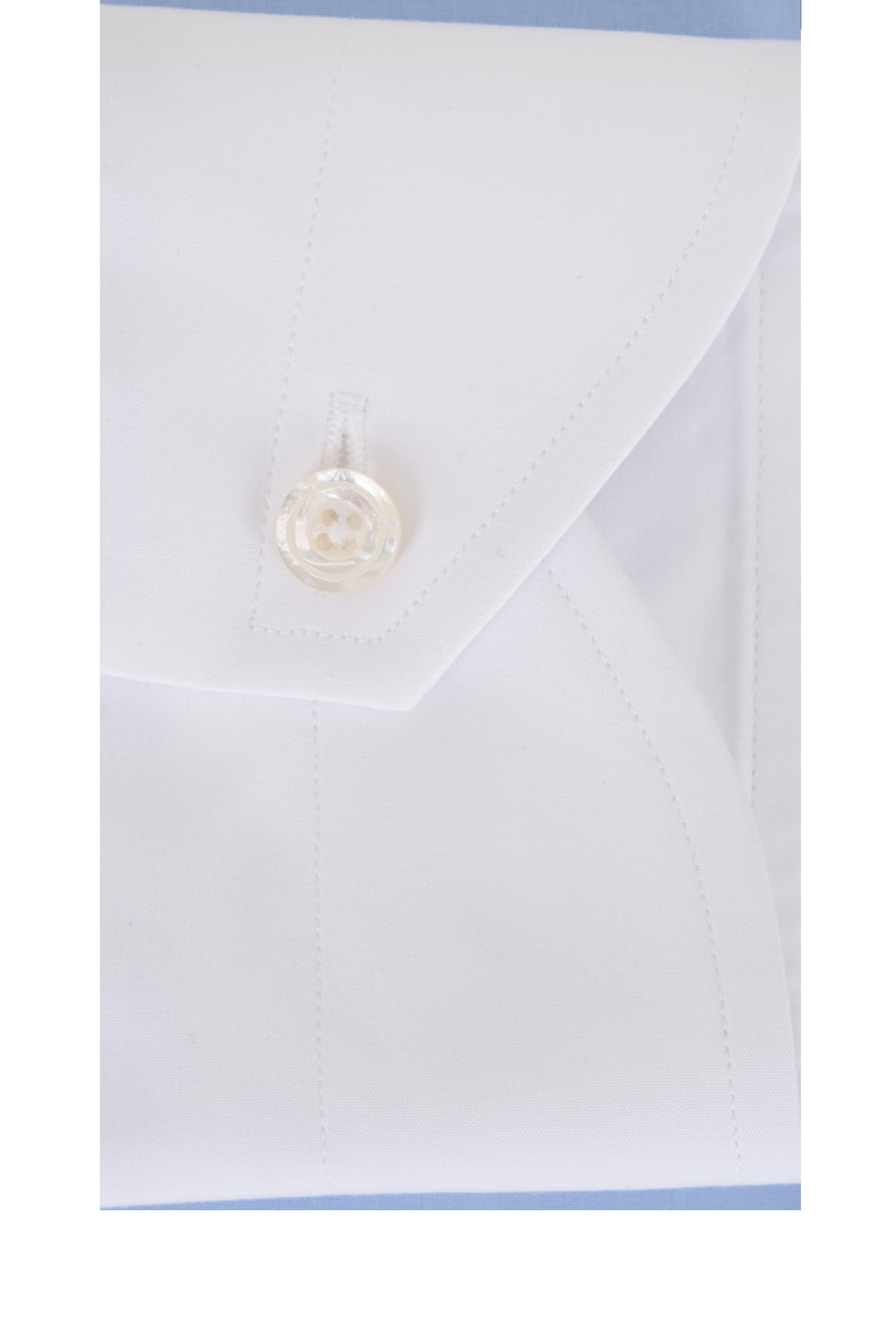 Spread collar. Hidden placket. Single-button mitered cuffs. Made in Italy. 100% cotton. Dry clean.