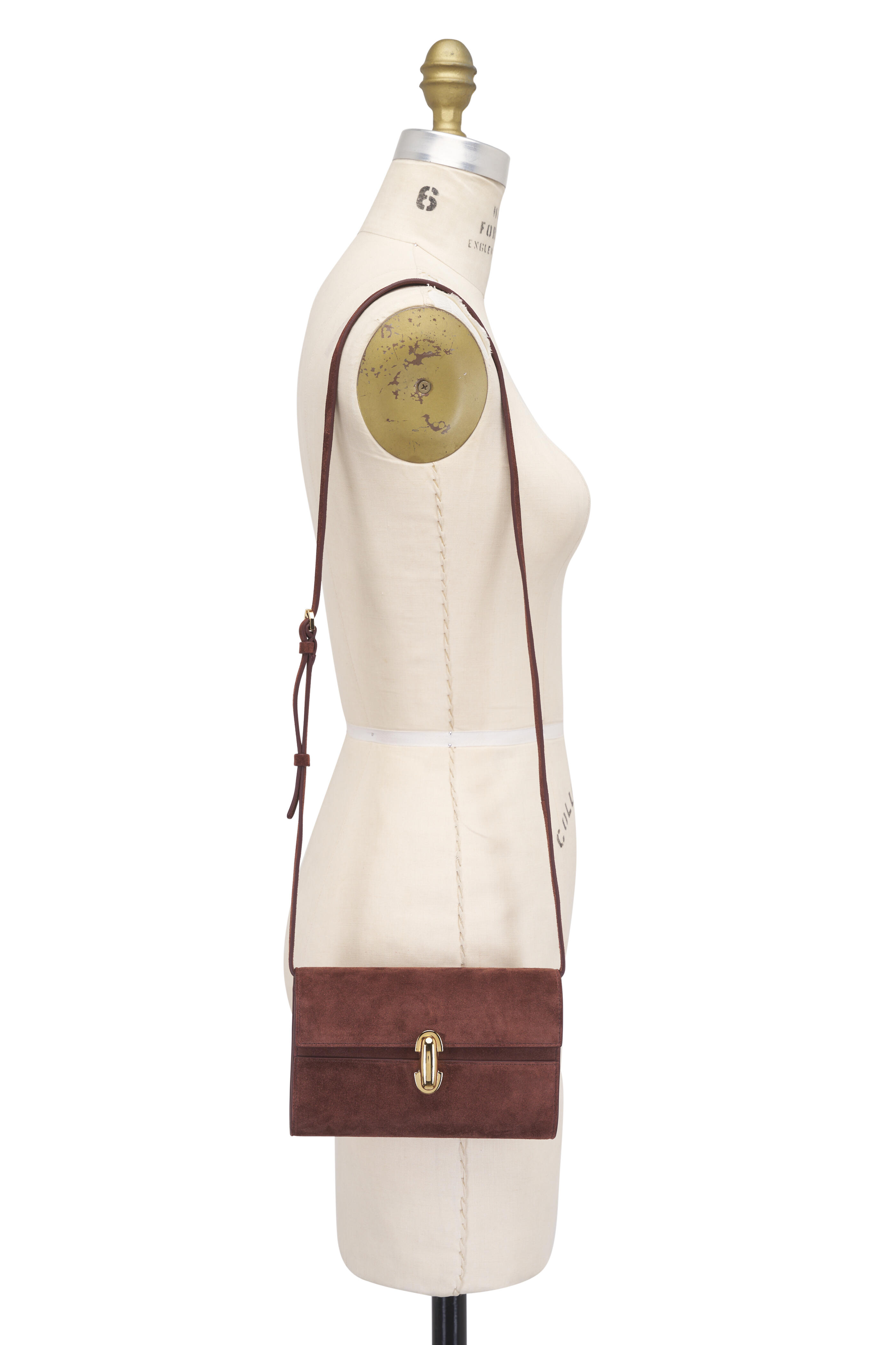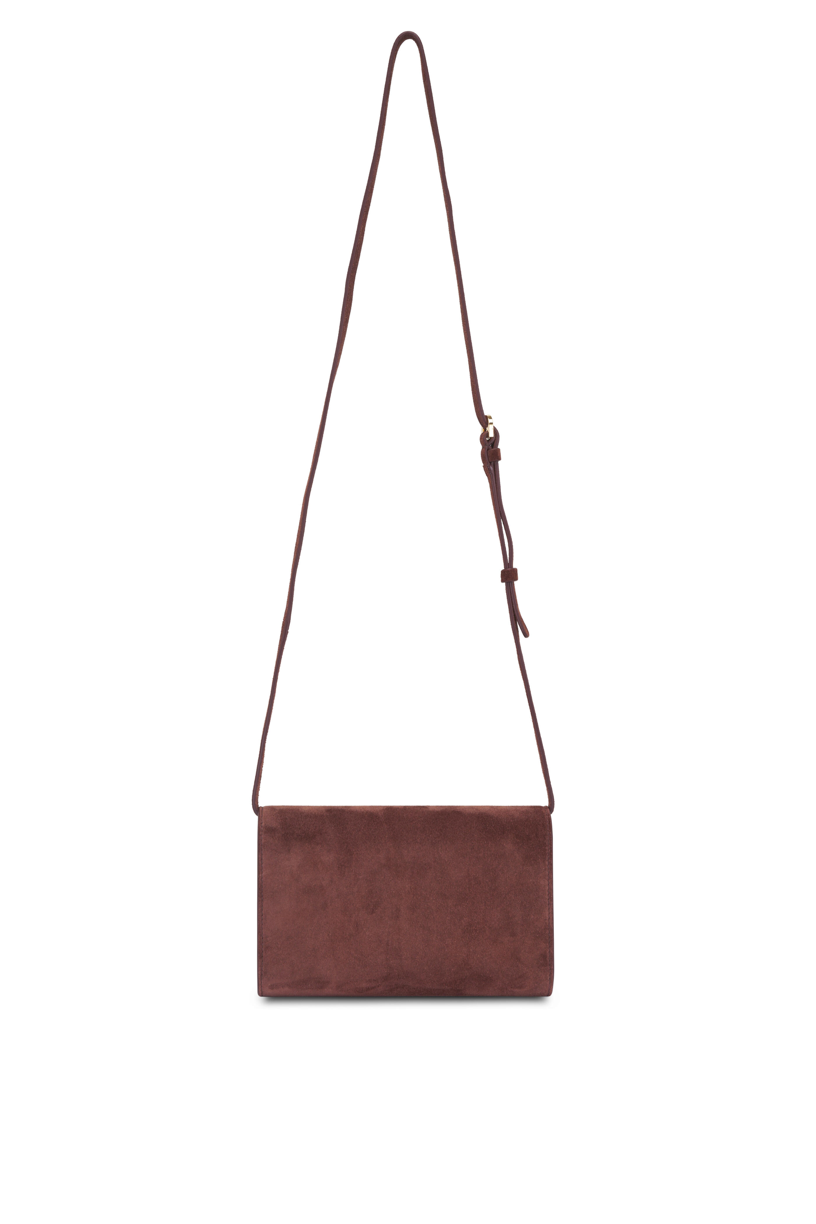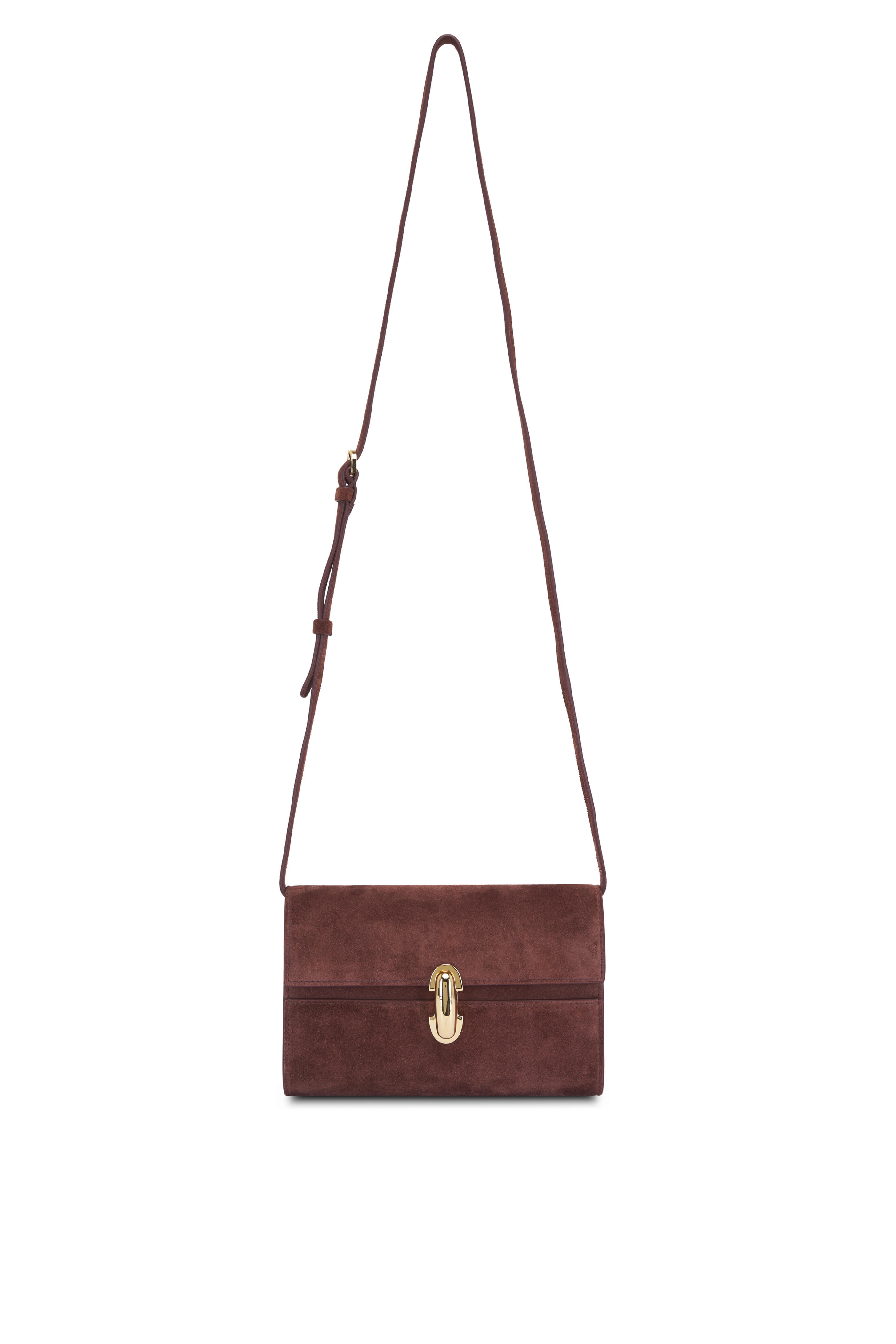 Suede. Flap closure with turn lock. Removable strap. Single compartment. Single card pocket. Leather lining. Made in Italy. Length: 7". Width: 5". Depth: 1".