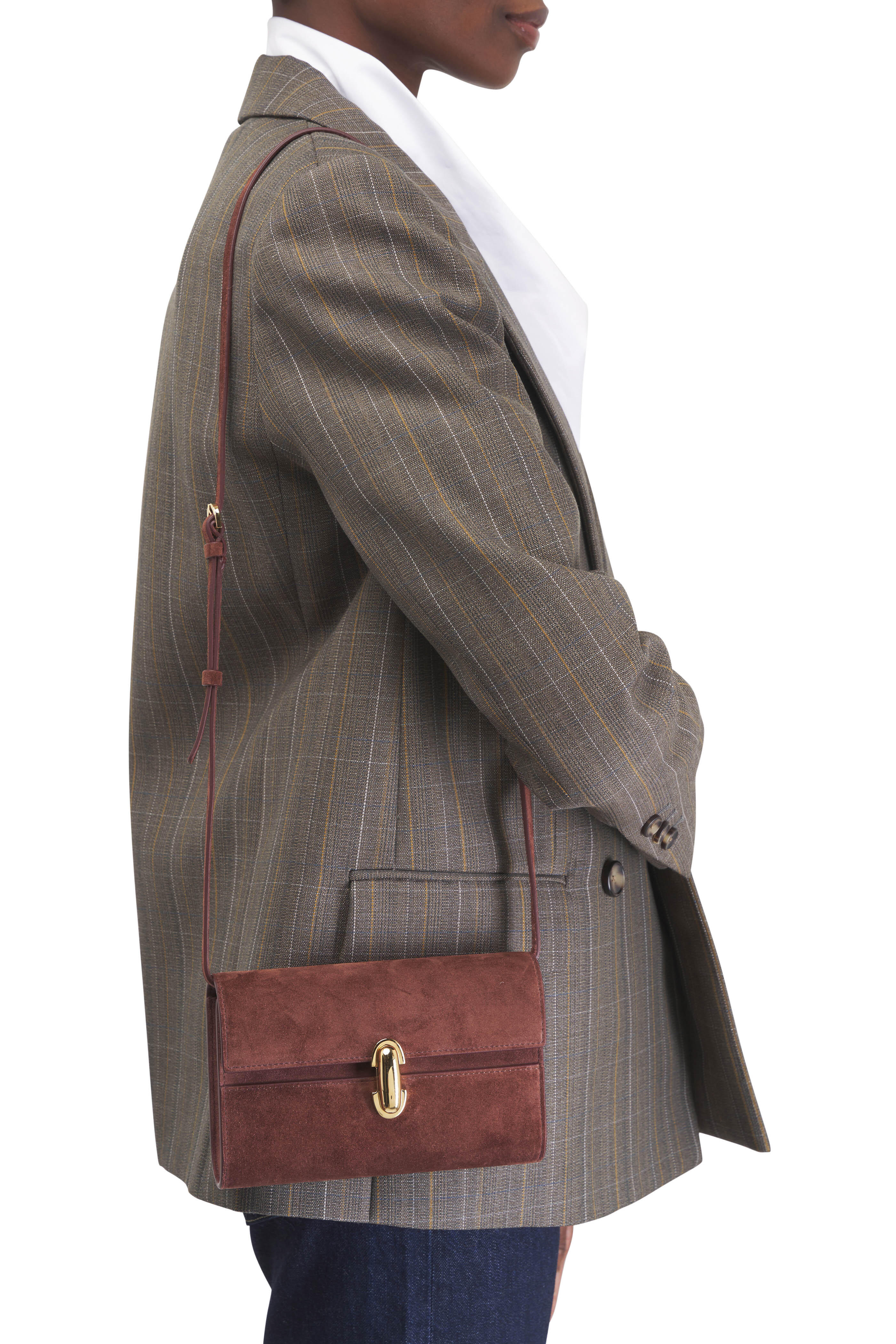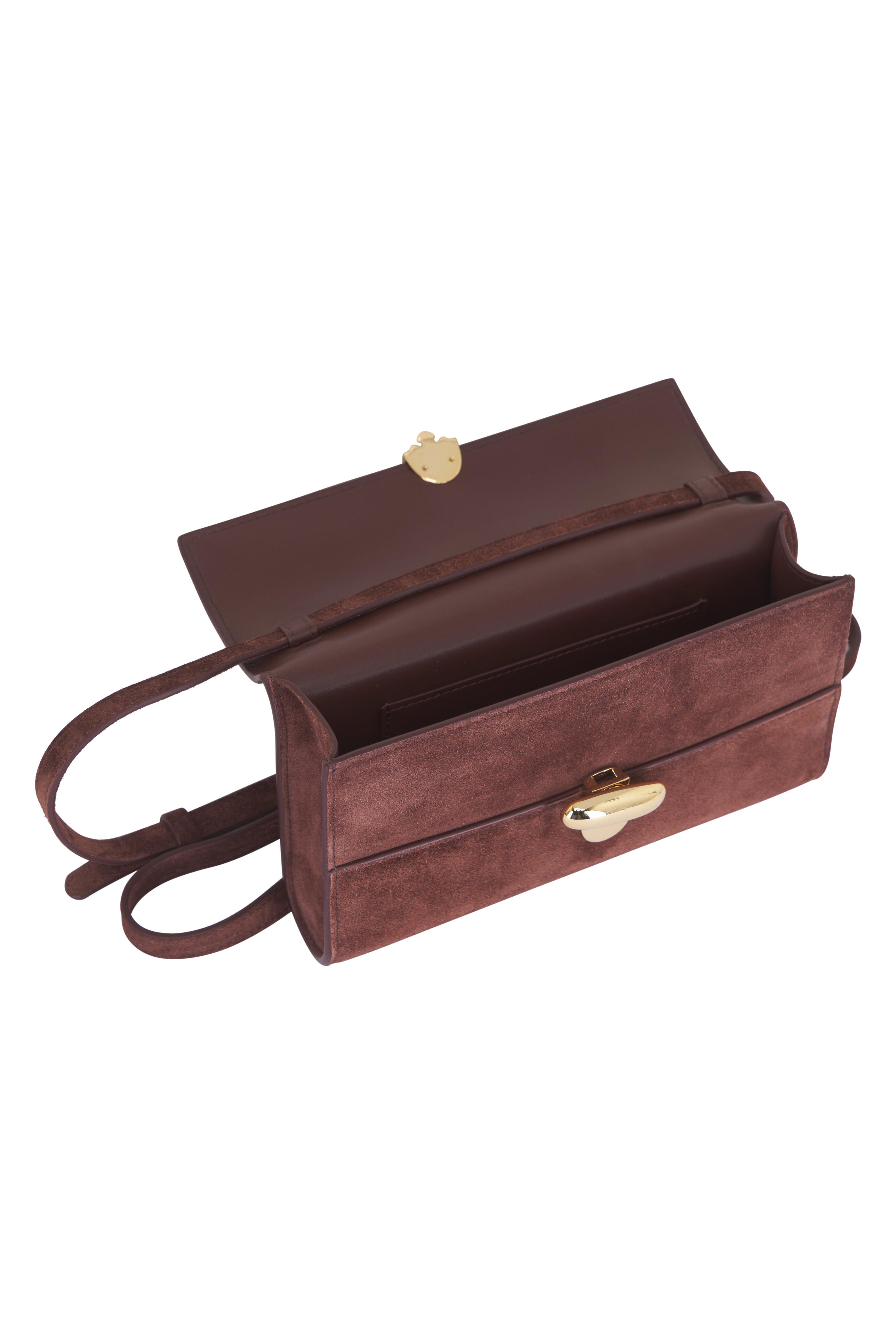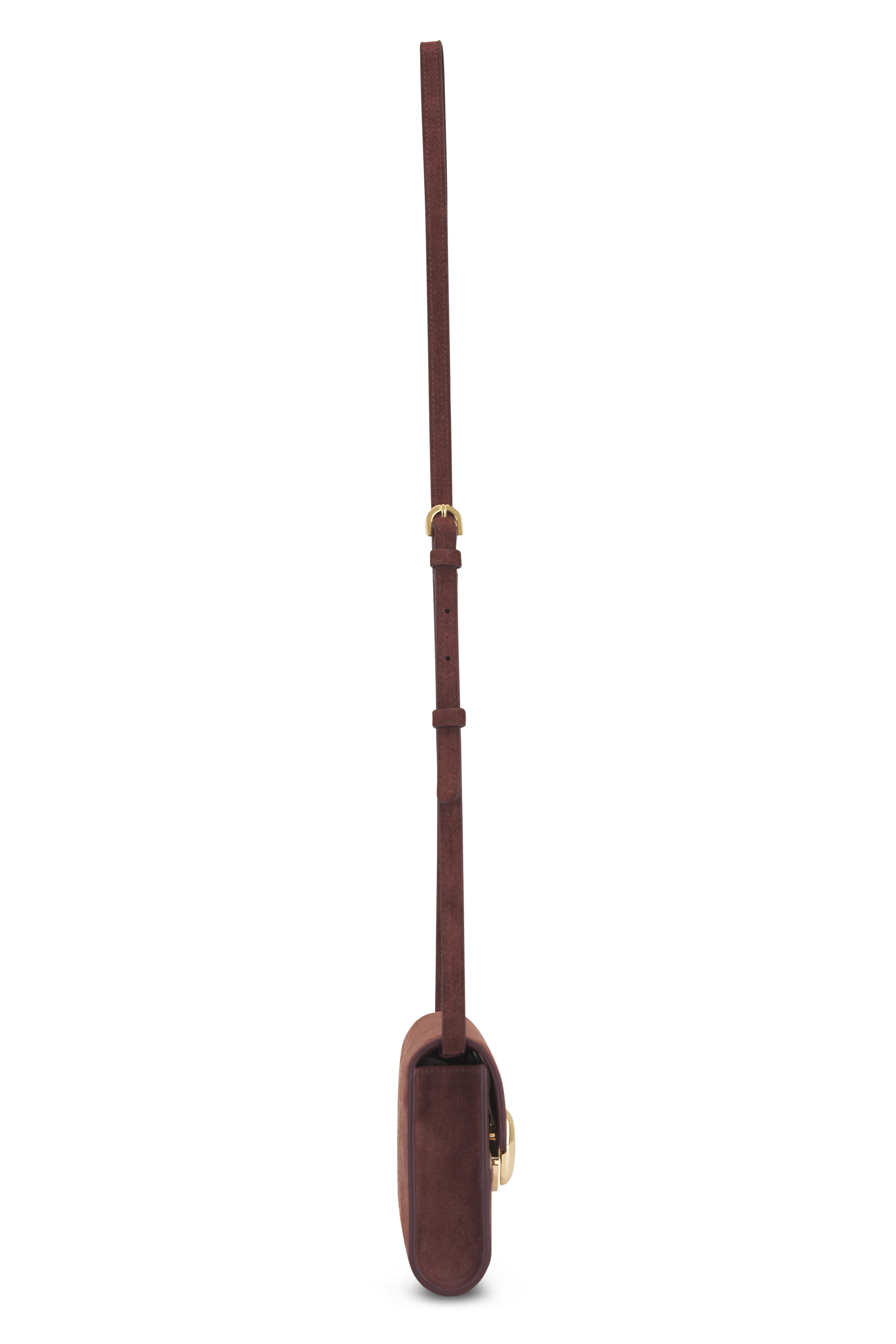Suede. Flap closure with turn lock. Removable strap. Single compartment. Single card pocket. Leather lining. Made in Italy. Length: 7". Width: 5". Depth: 1".
