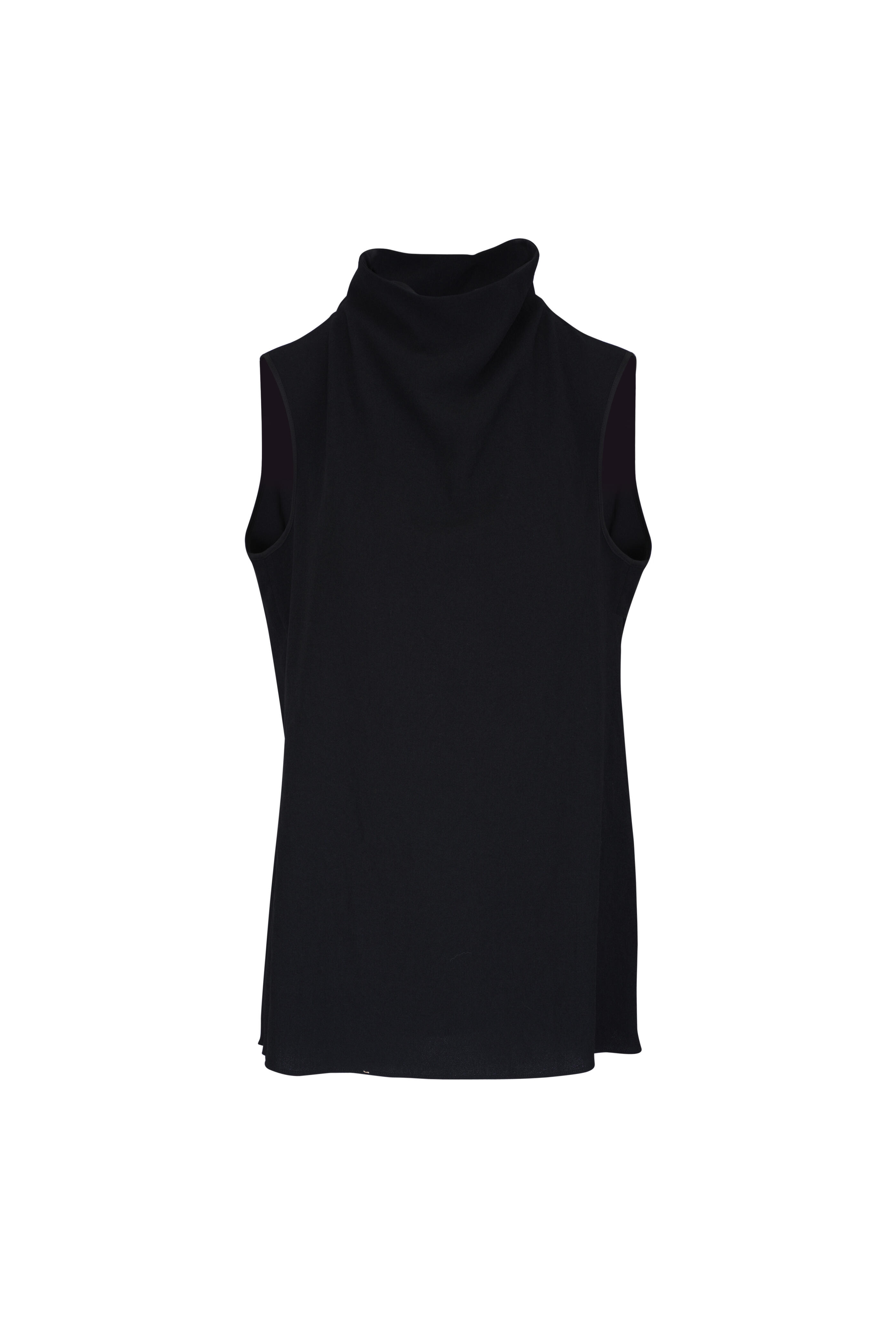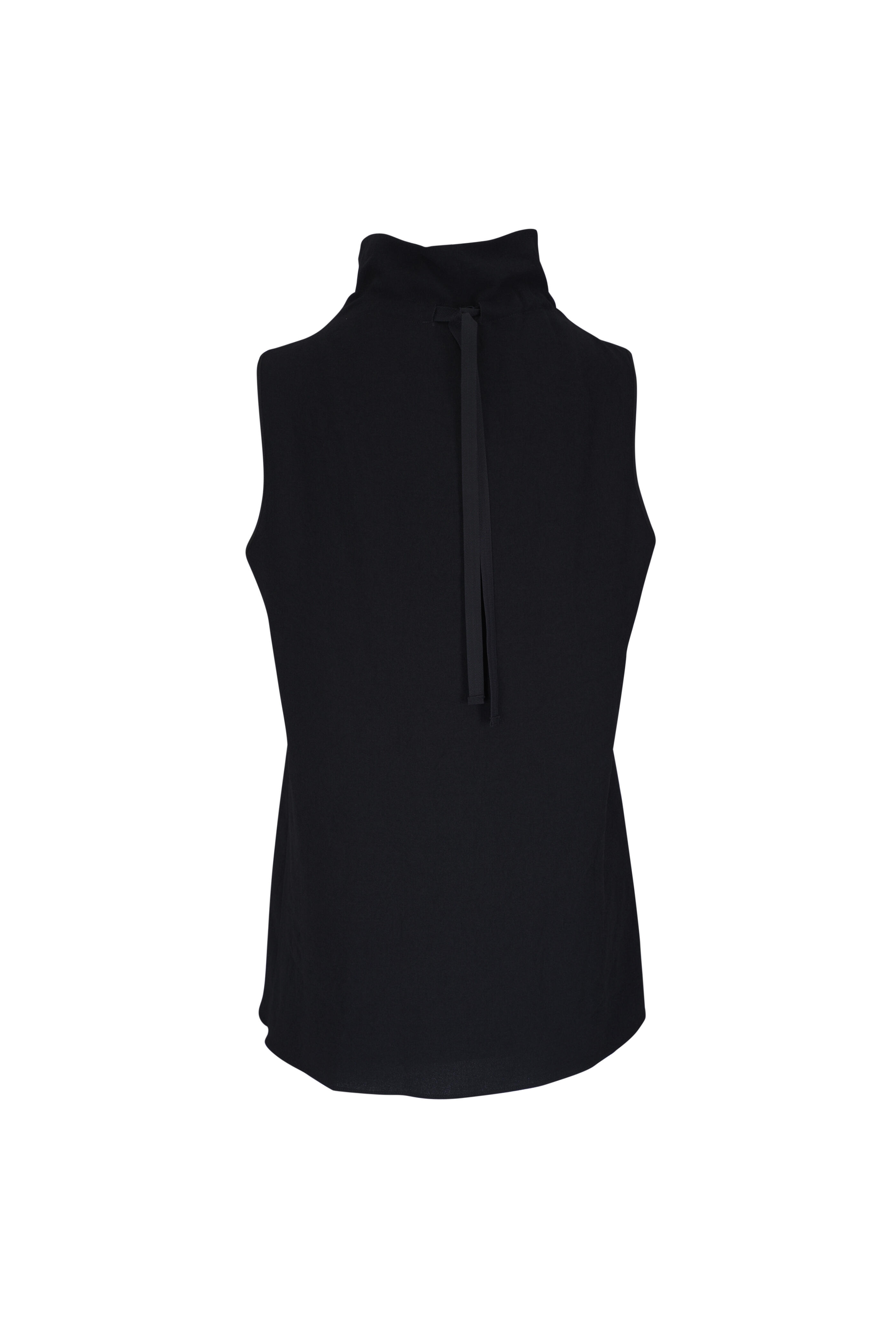 Cowl neckline; back-neck elasticized ribbon cinch detail. Concealed side zip. Straight hem. Made in the USA. Shoulder to hem 28" (size s). 100% polyester; lining: 97% silk, 3% elastane. Dry clean.