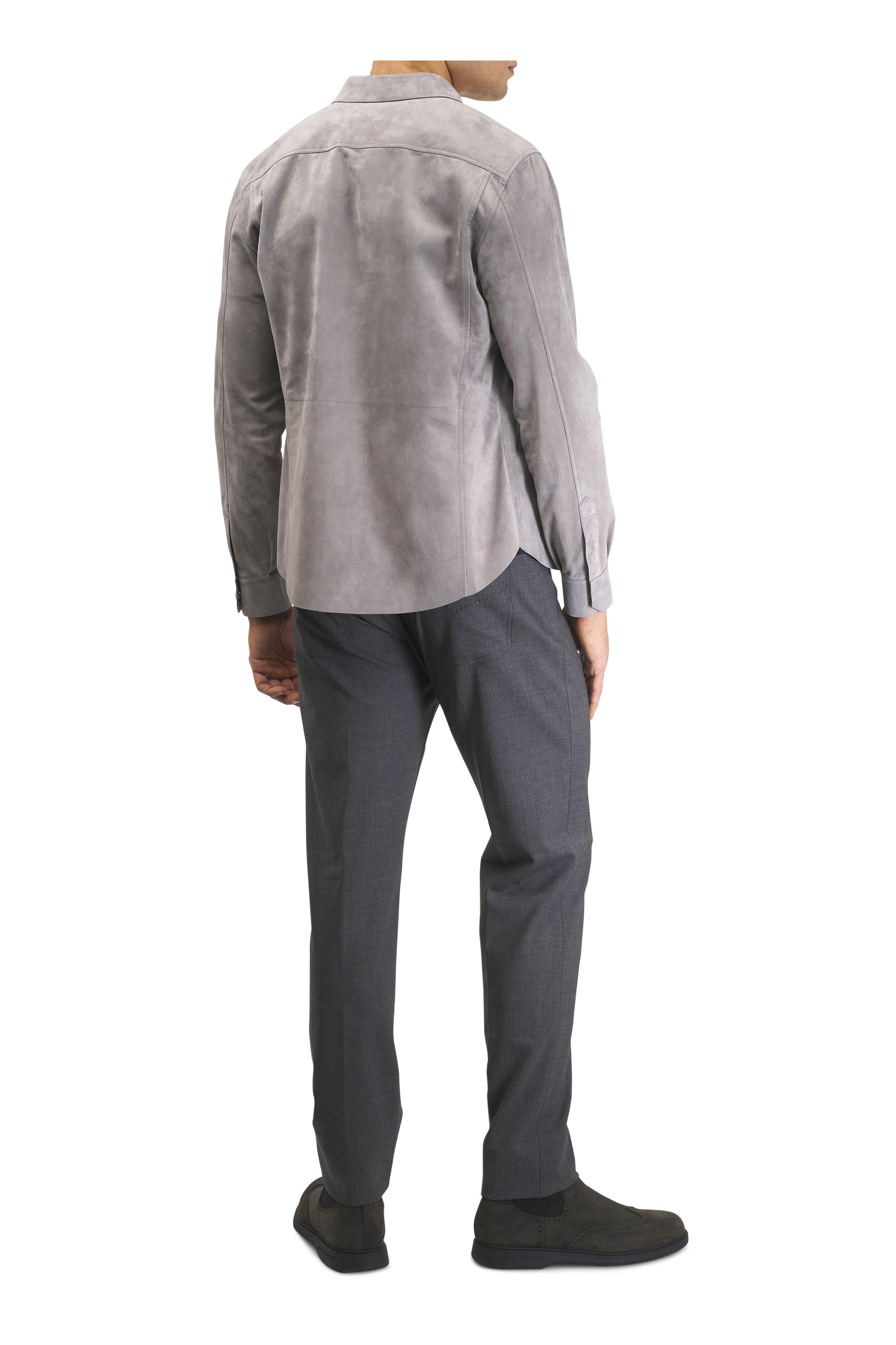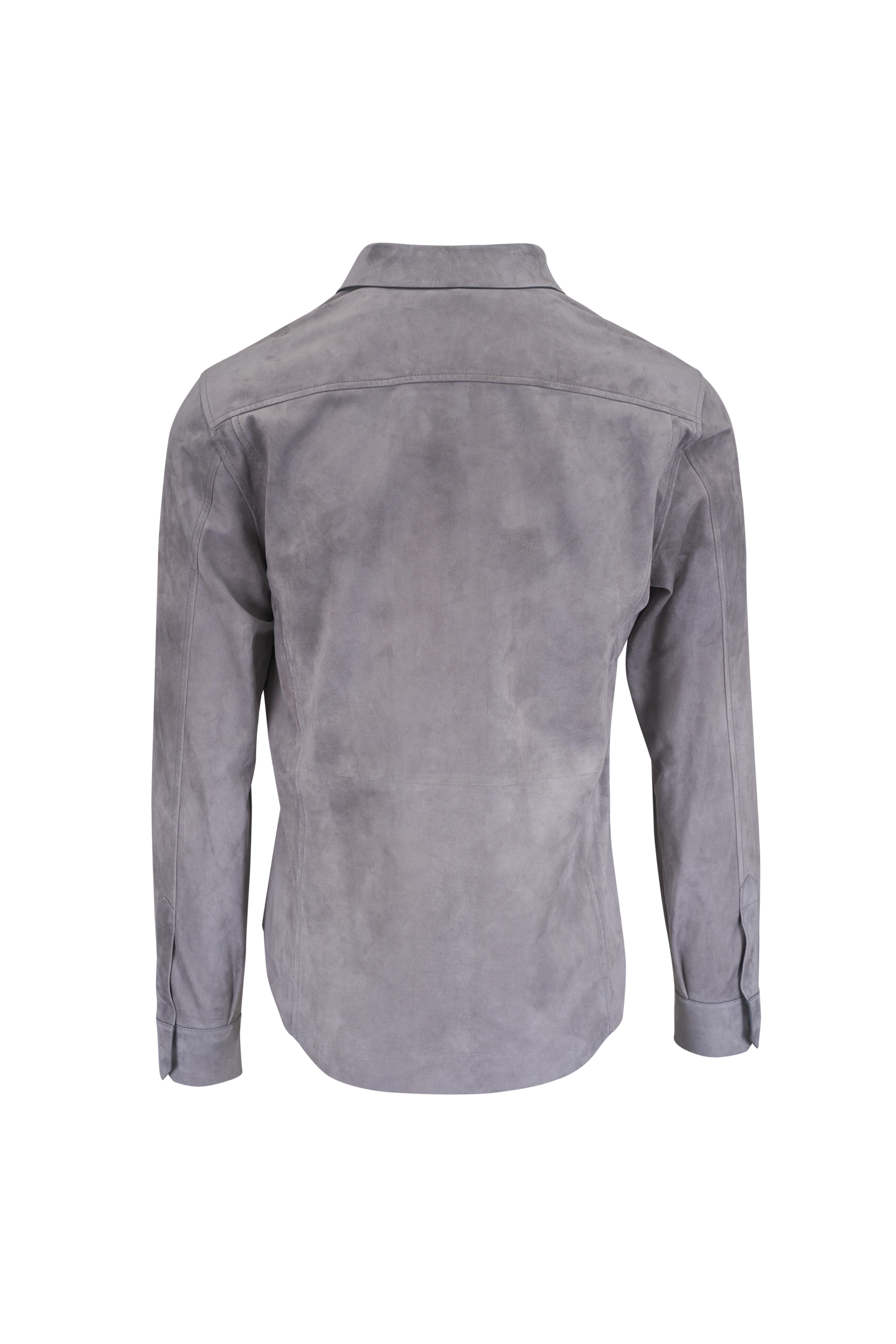 Point collar. Front covered snap button placket. Single button mitered cuffs. Shirttail hem. Made in Italy. Shoulder to hem 27" (size 50 R). 100% suede leather. Dry clean.