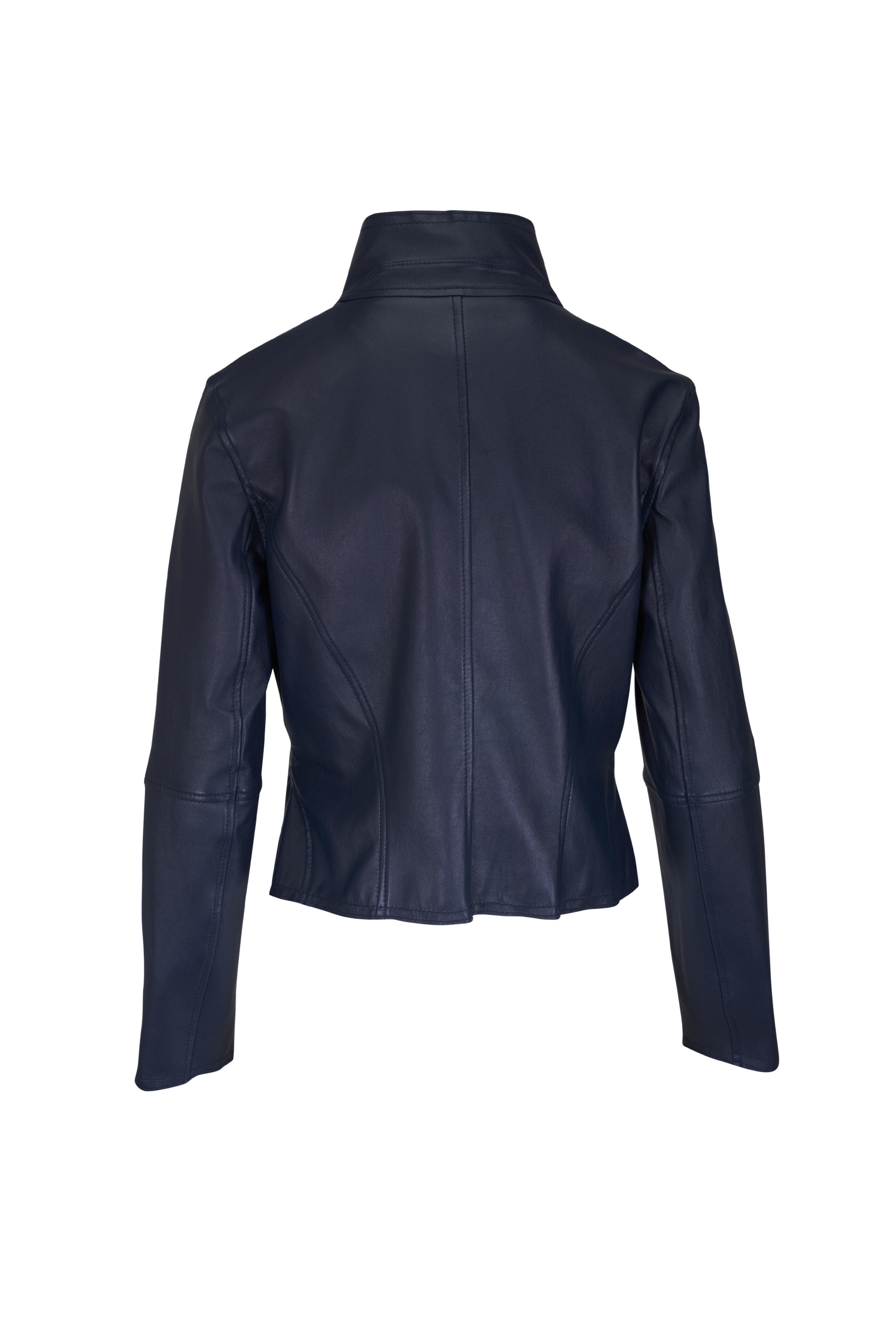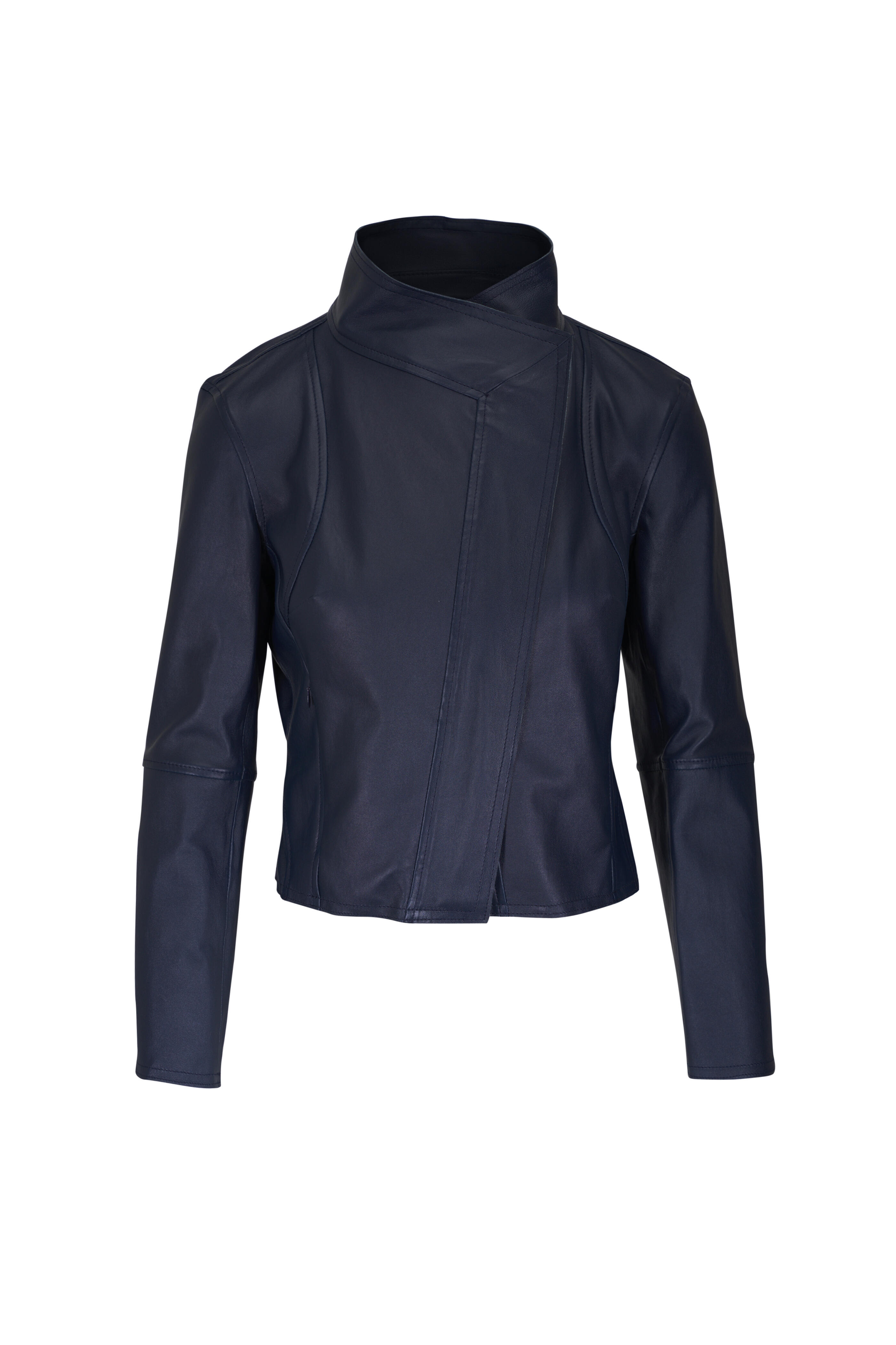 Draped collar. Concealed front zip. Side zip pockets. Figure shaping seamlines. Straight hem. Raw edge at neck, front, and hems. Made in the USA. Approximately 20" shoulder to hem (measurements taken from size s). 100% stretch lambskin leather. Machine wash.
