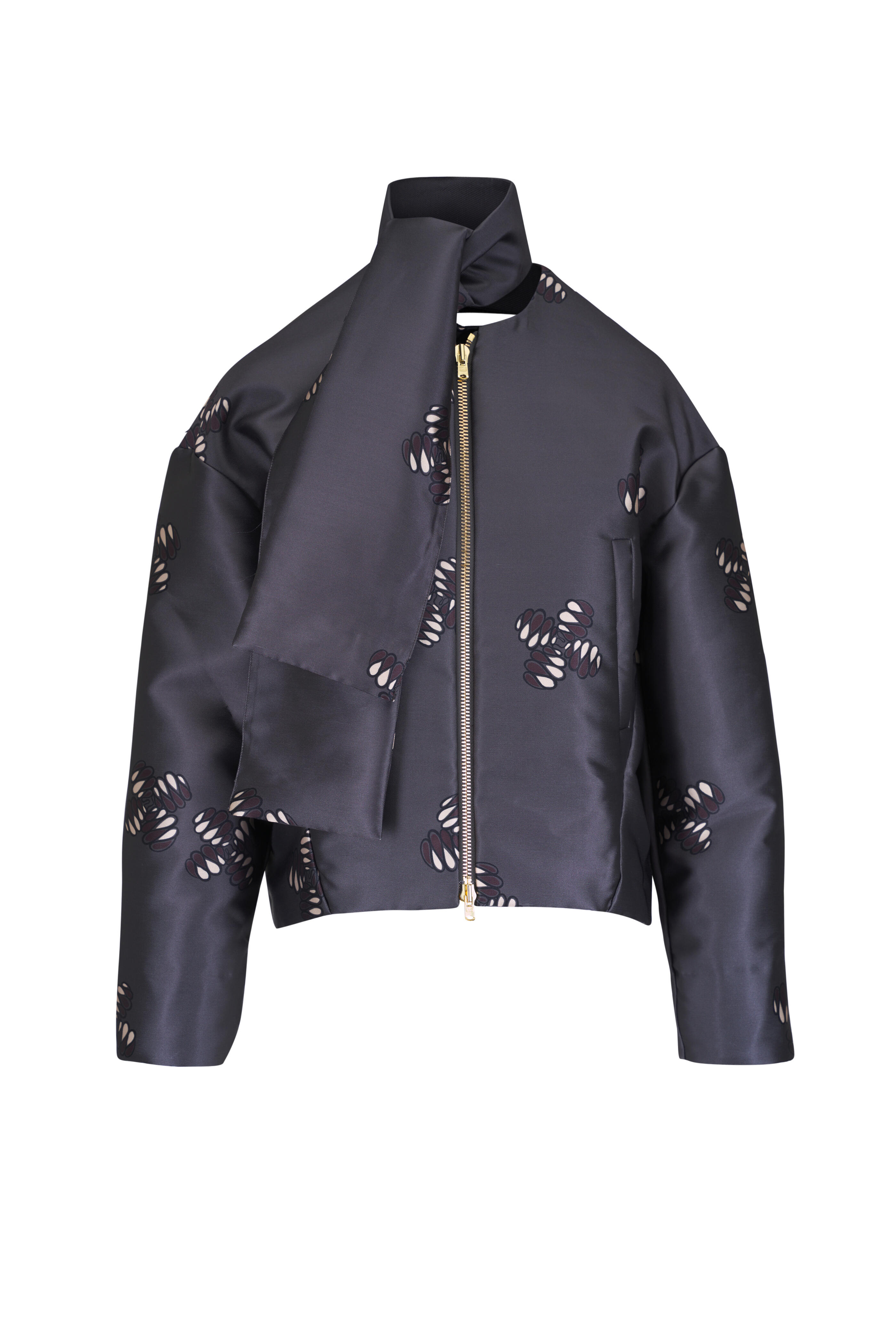 Collarless; self-tie scarf. Two way front zip. Drop shoulders. Side slip pockets. Imported. 51% recycled polyester, 49% polyester. Dry clean.