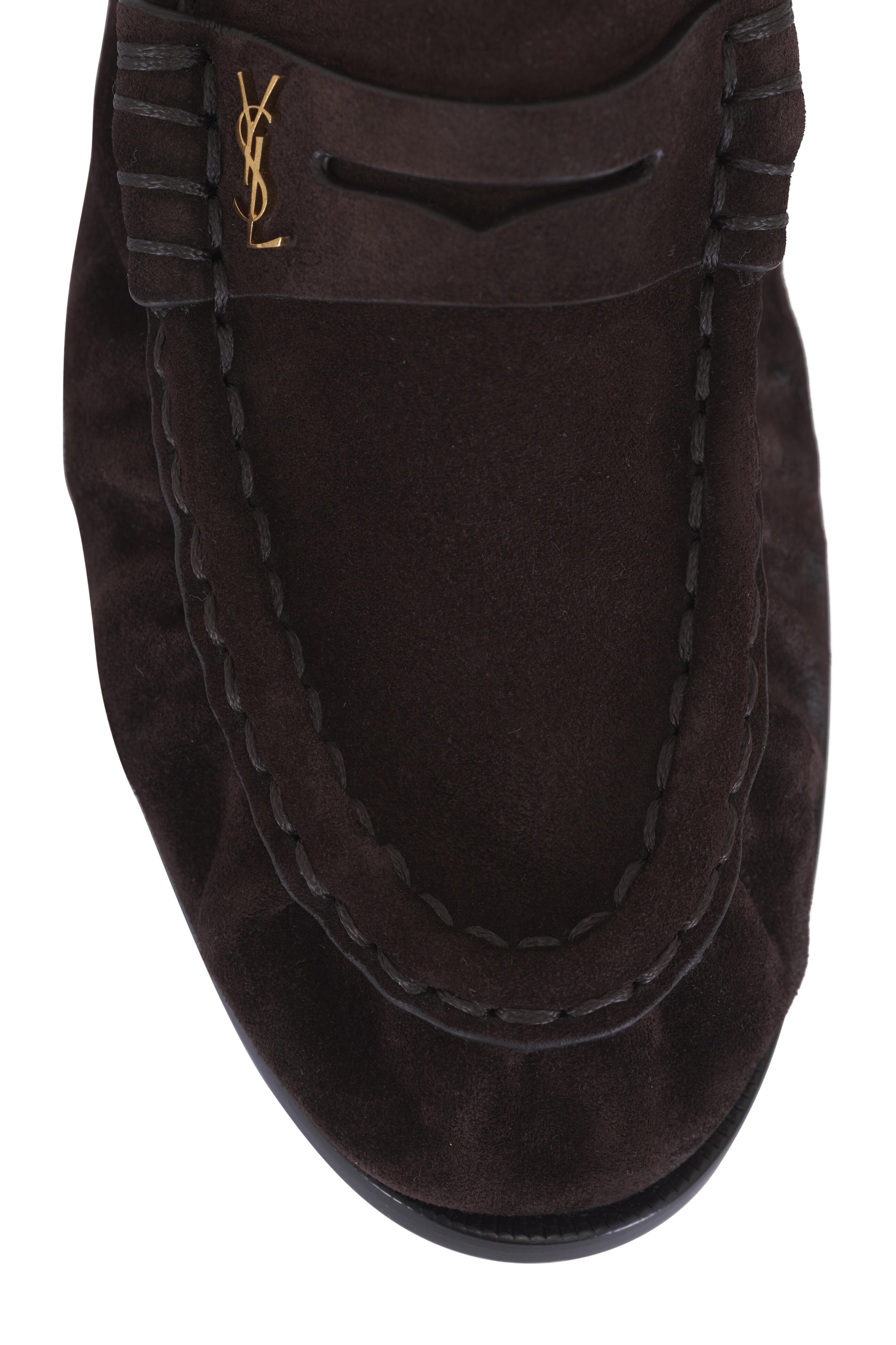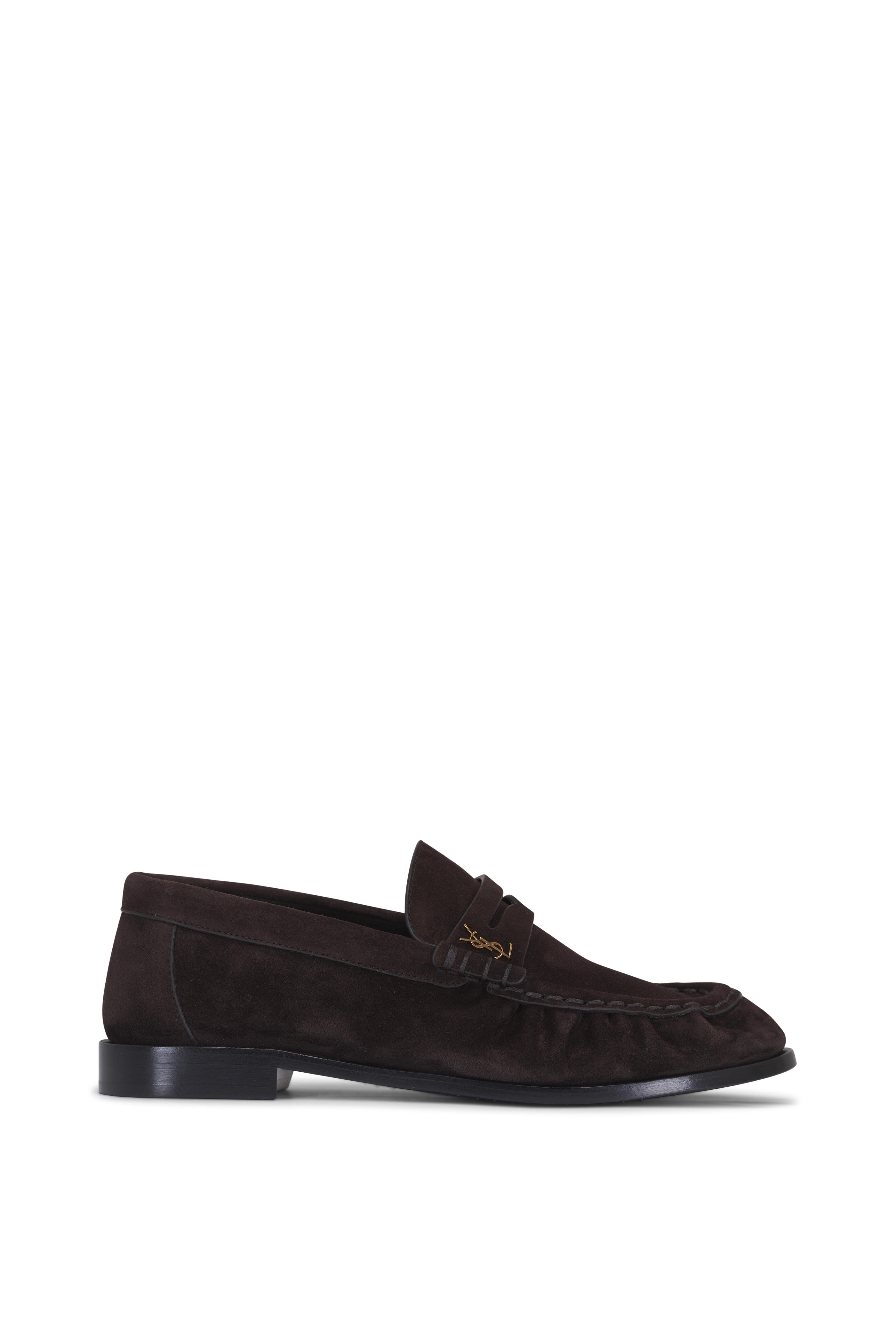 Suede upper. Slip on style. Penny strap at vamp. Leather lining and insole. Leather sole. Cassandre detailing at side. Made in Italy. Heel height: 15mm.