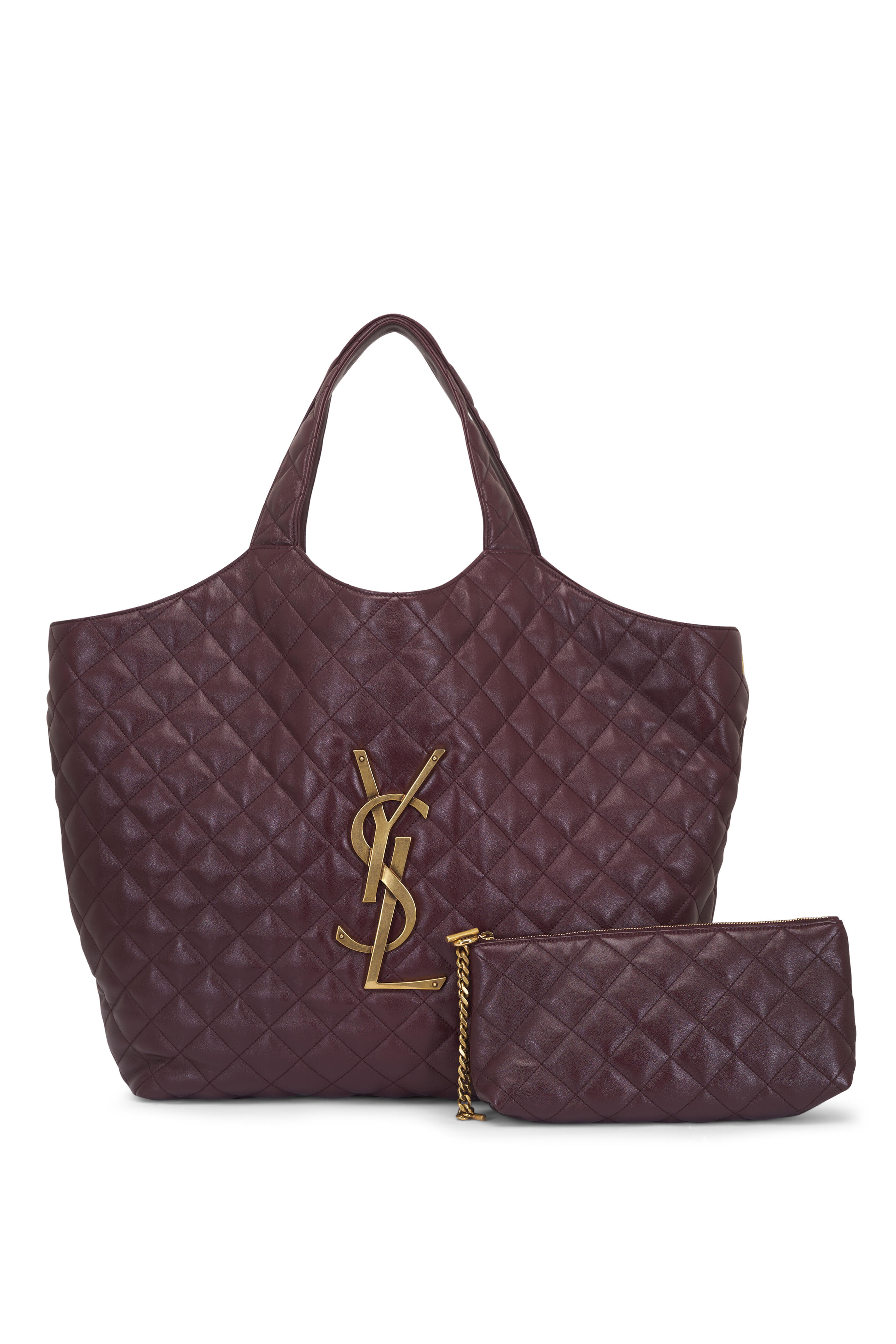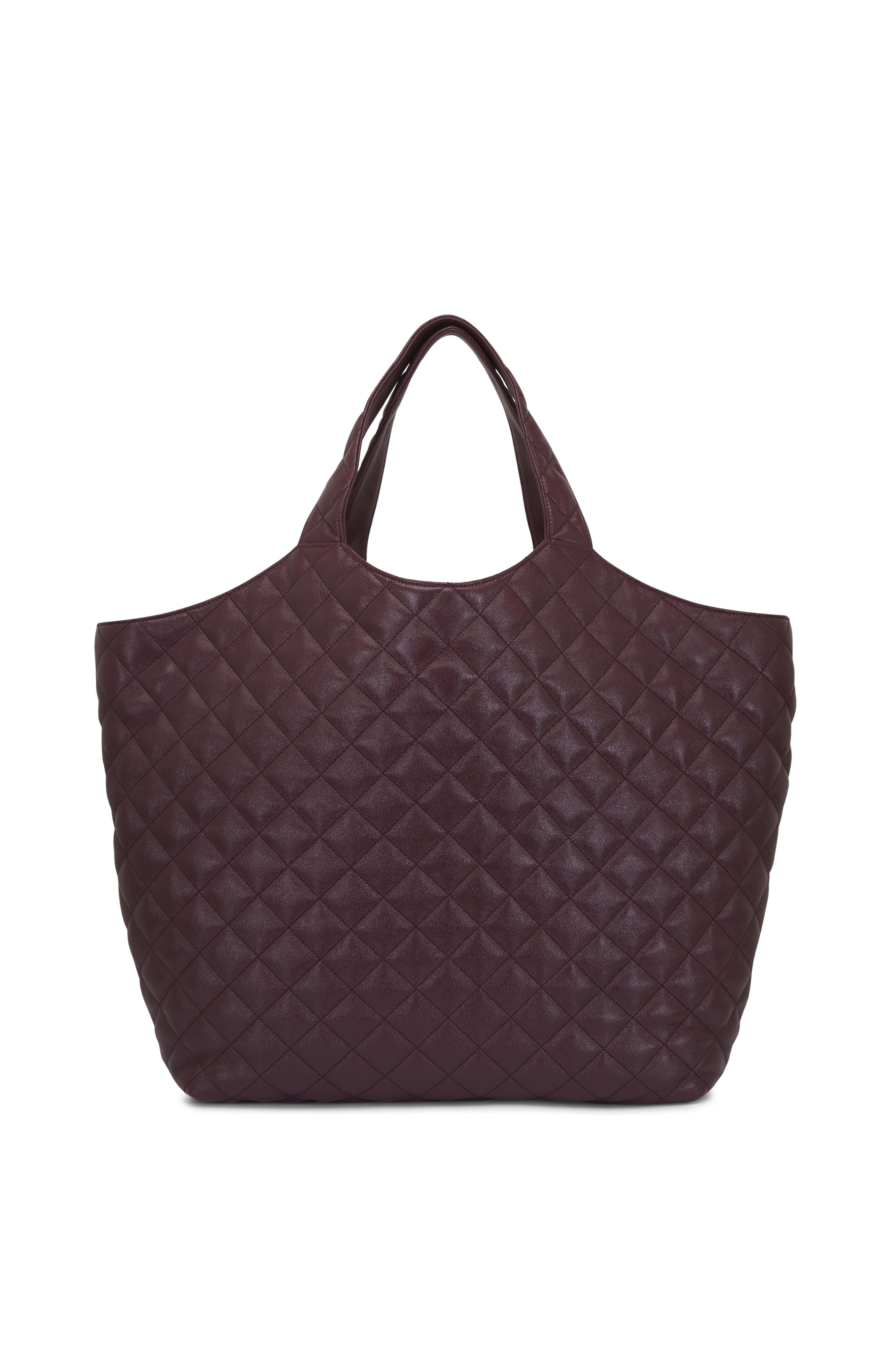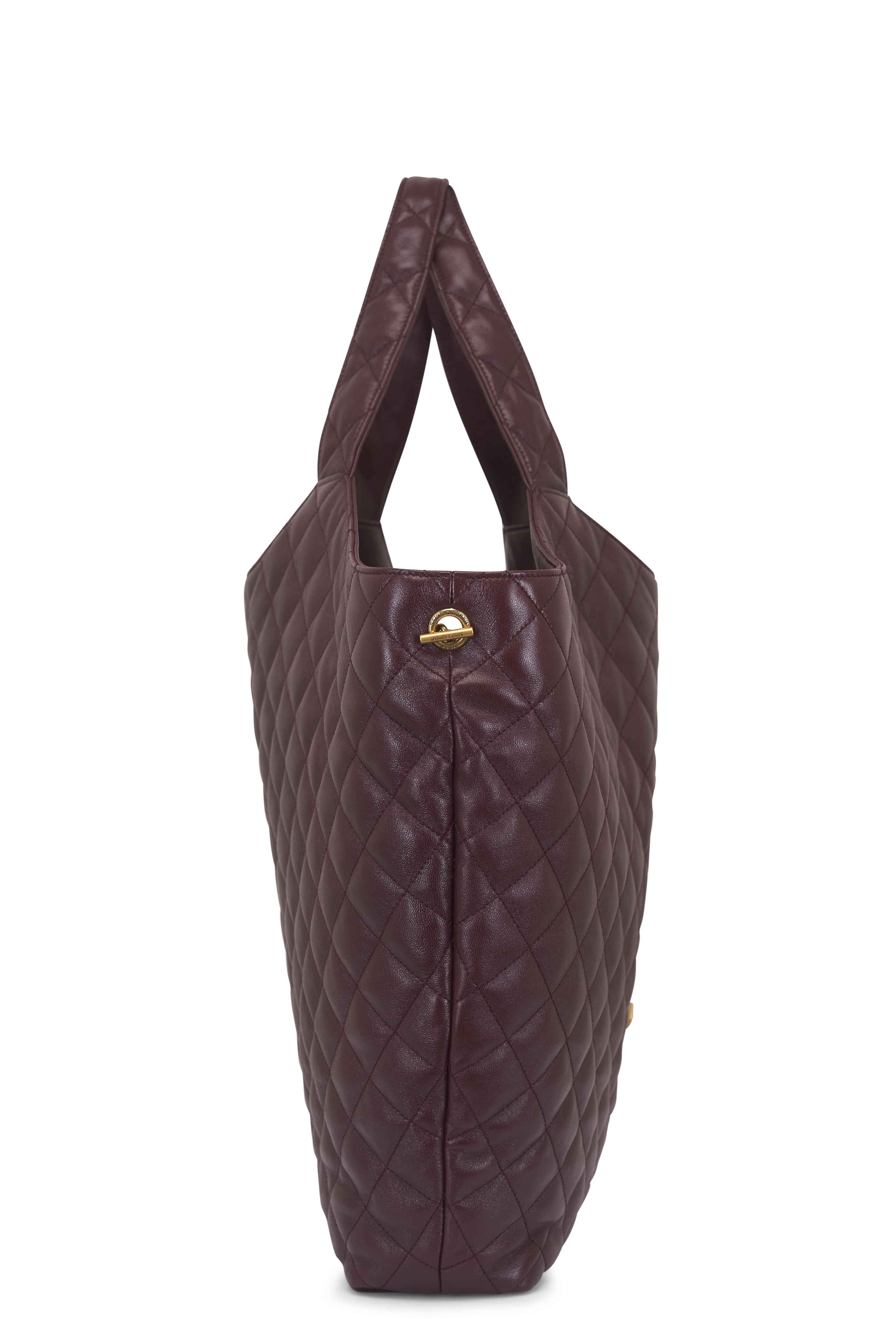 Quilted nappa lambskin leather. Dual top handles. Detachable chain toggle closure. Removable quilted zip pouch. Leather lining. Bronze-tone hardware. Made in Italy. Color: Rouge Cabernet. 14.6"–21.7" x 16.9" x 2". Strap drop: 8.3".