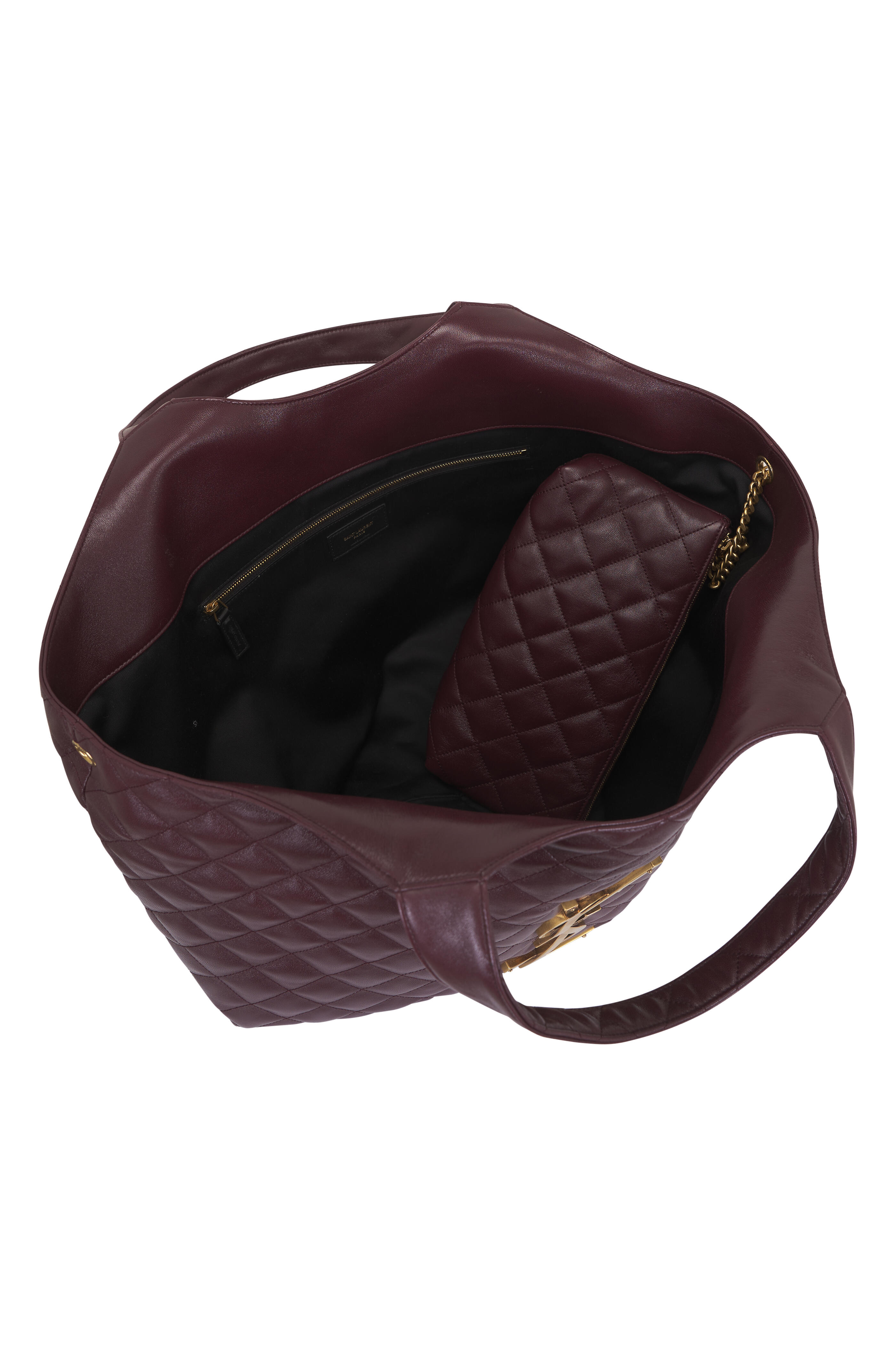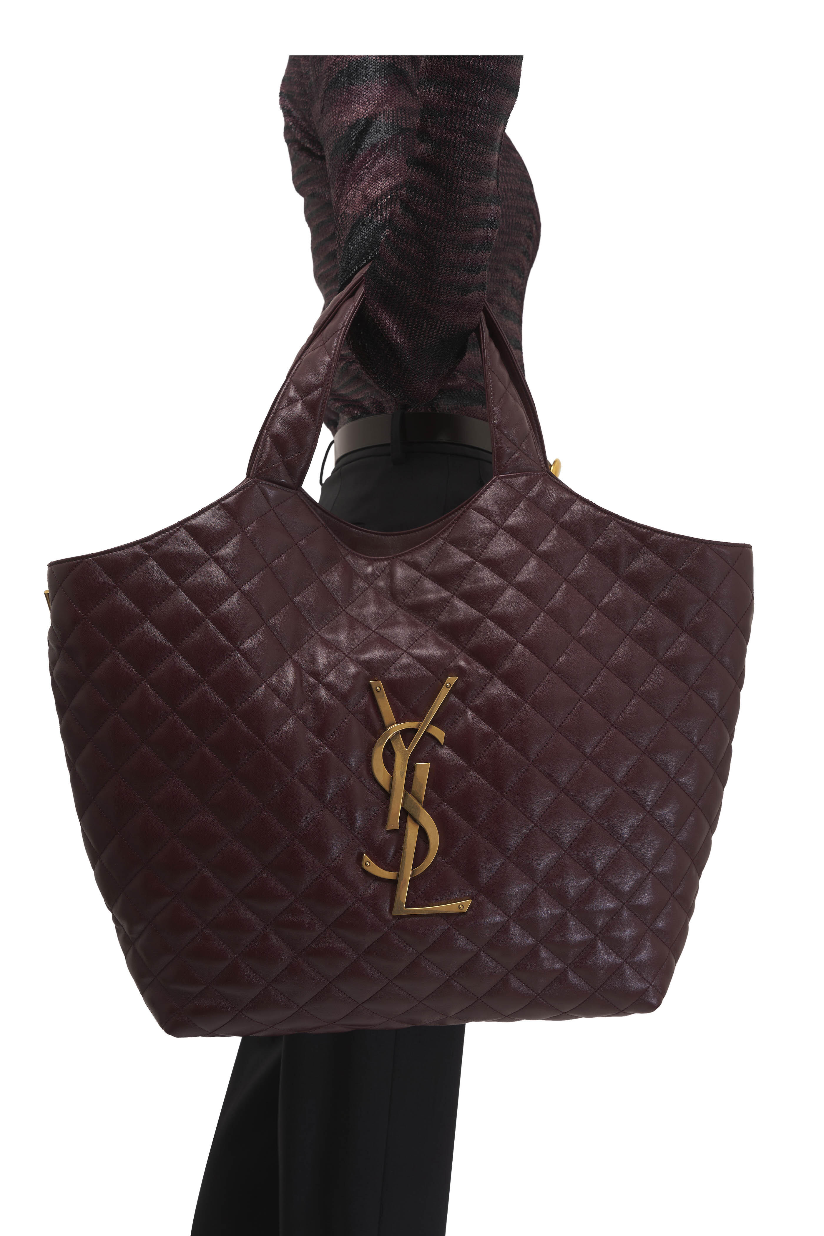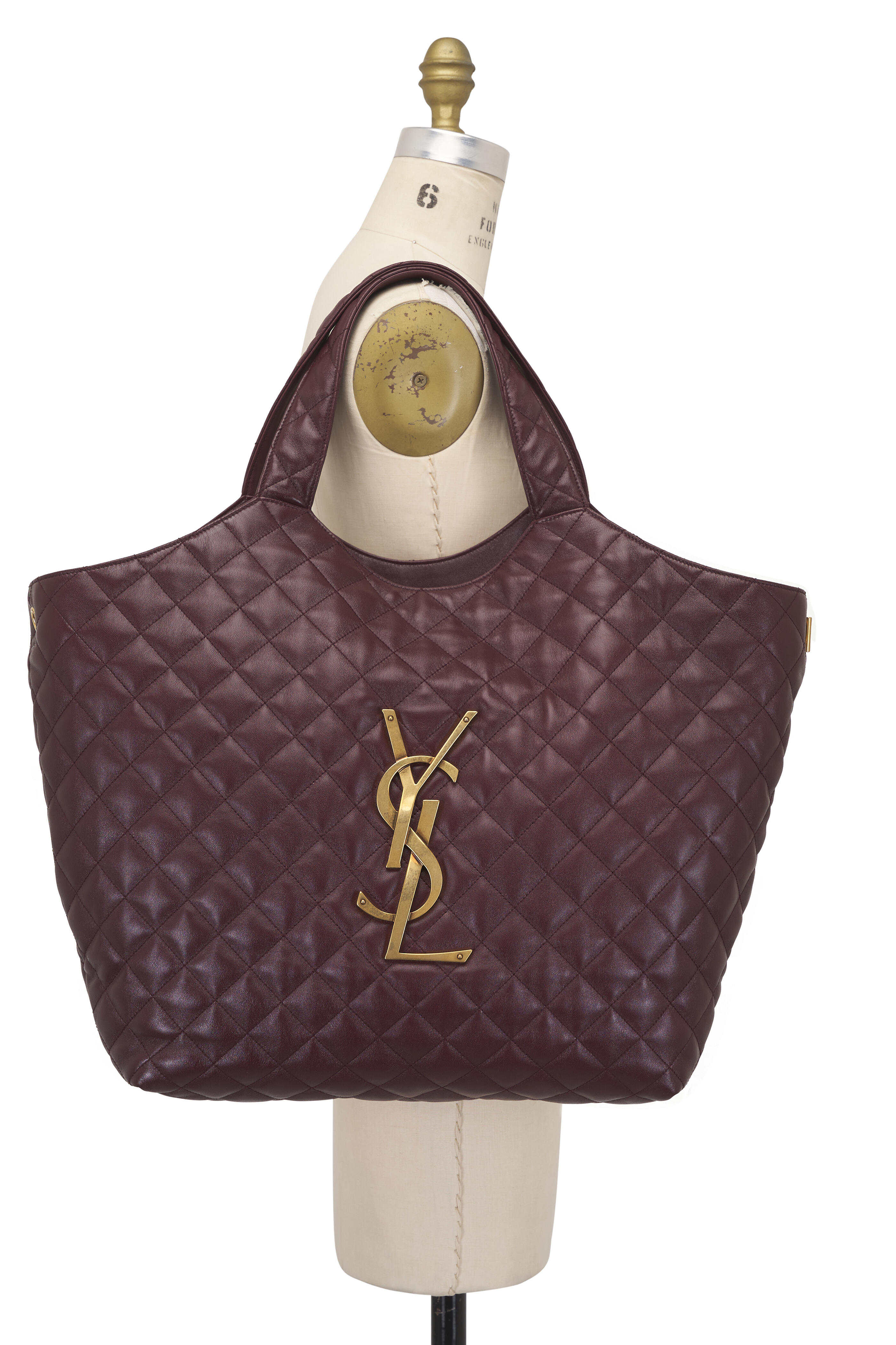 Quilted nappa lambskin leather. Dual top handles. Detachable chain toggle closure. Removable quilted zip pouch. Leather lining. Bronze-tone hardware. Made in Italy. Color: Rouge Cabernet. 14.6"–21.7" x 16.9" x 2". Strap drop: 8.3".
