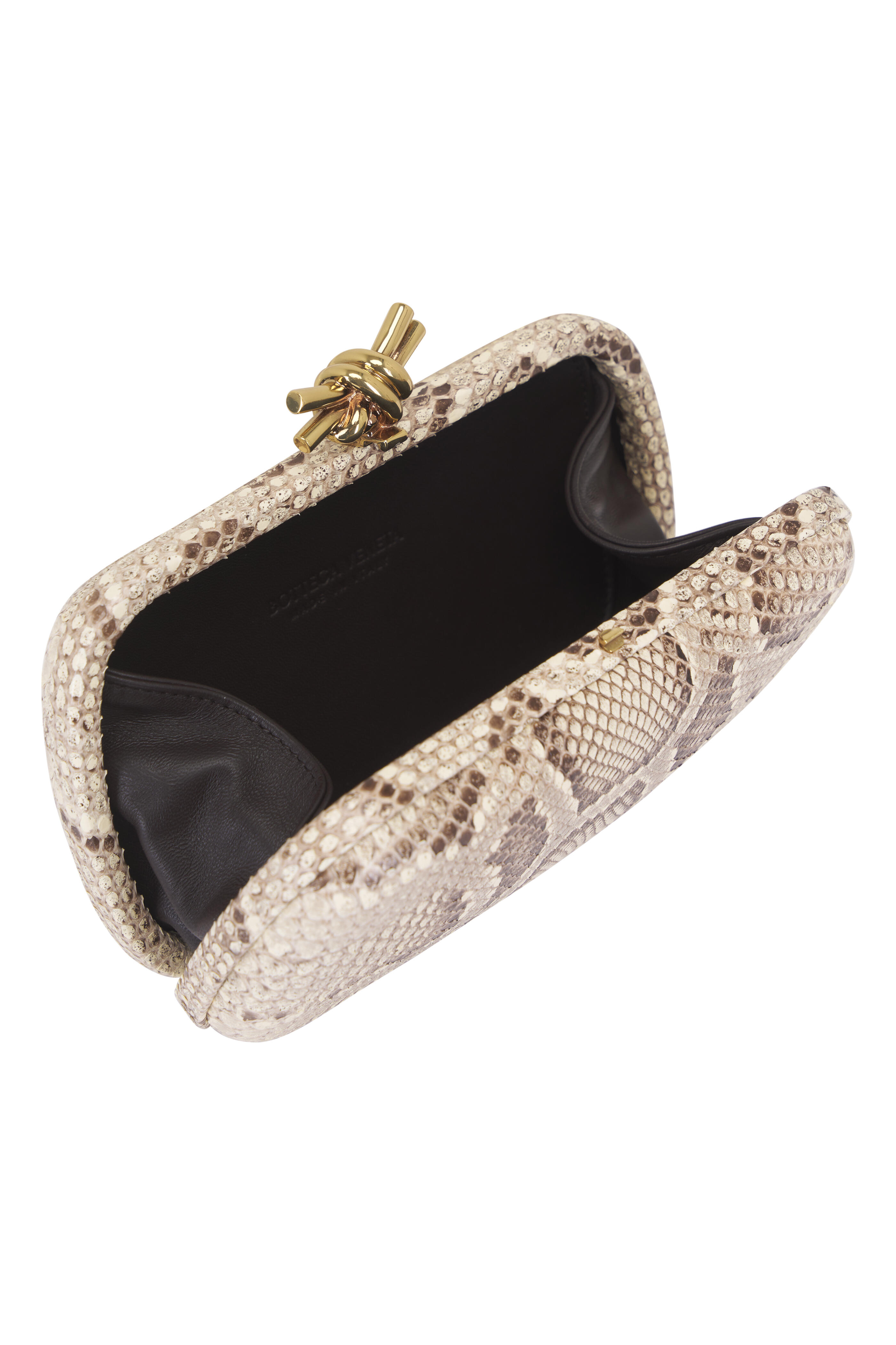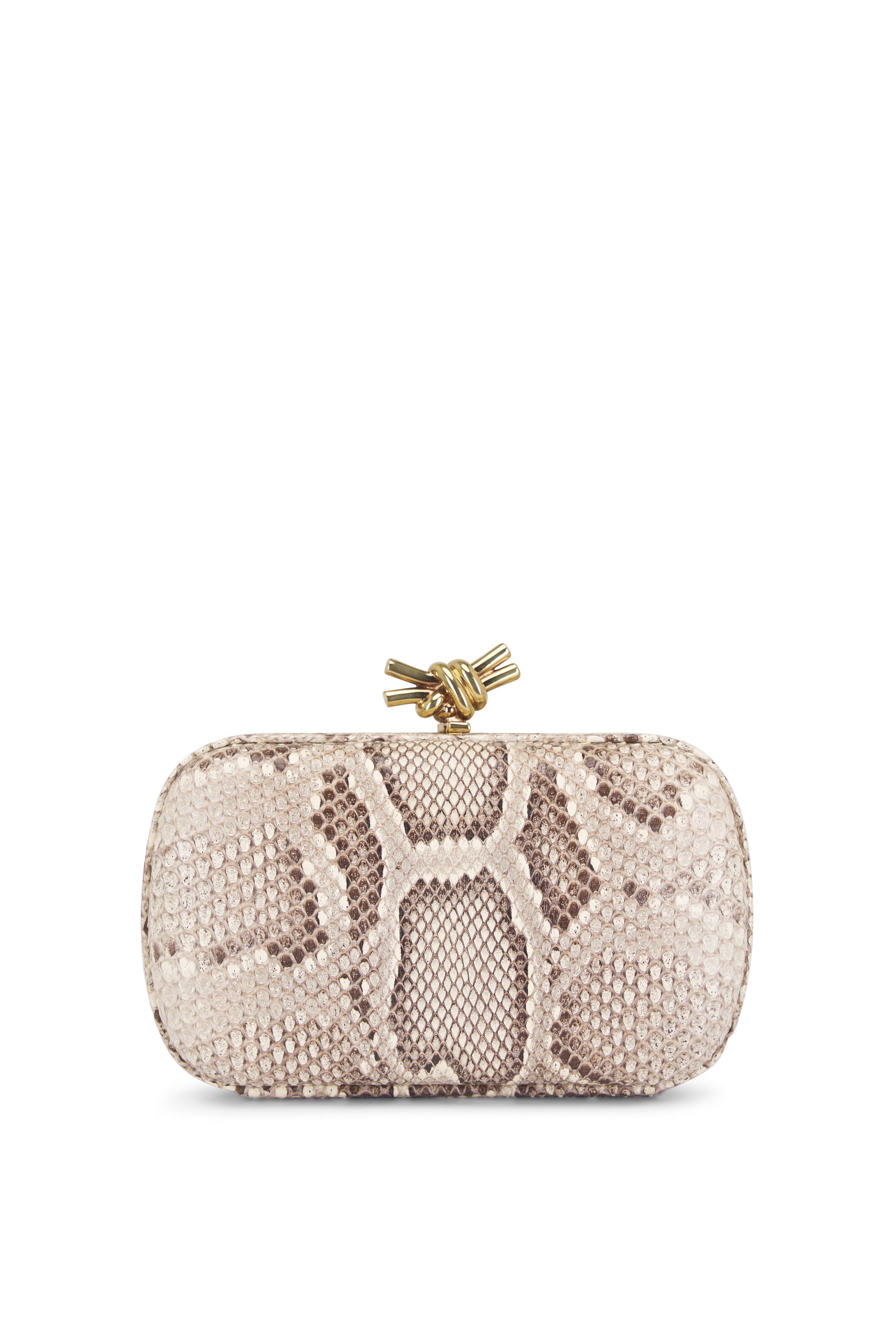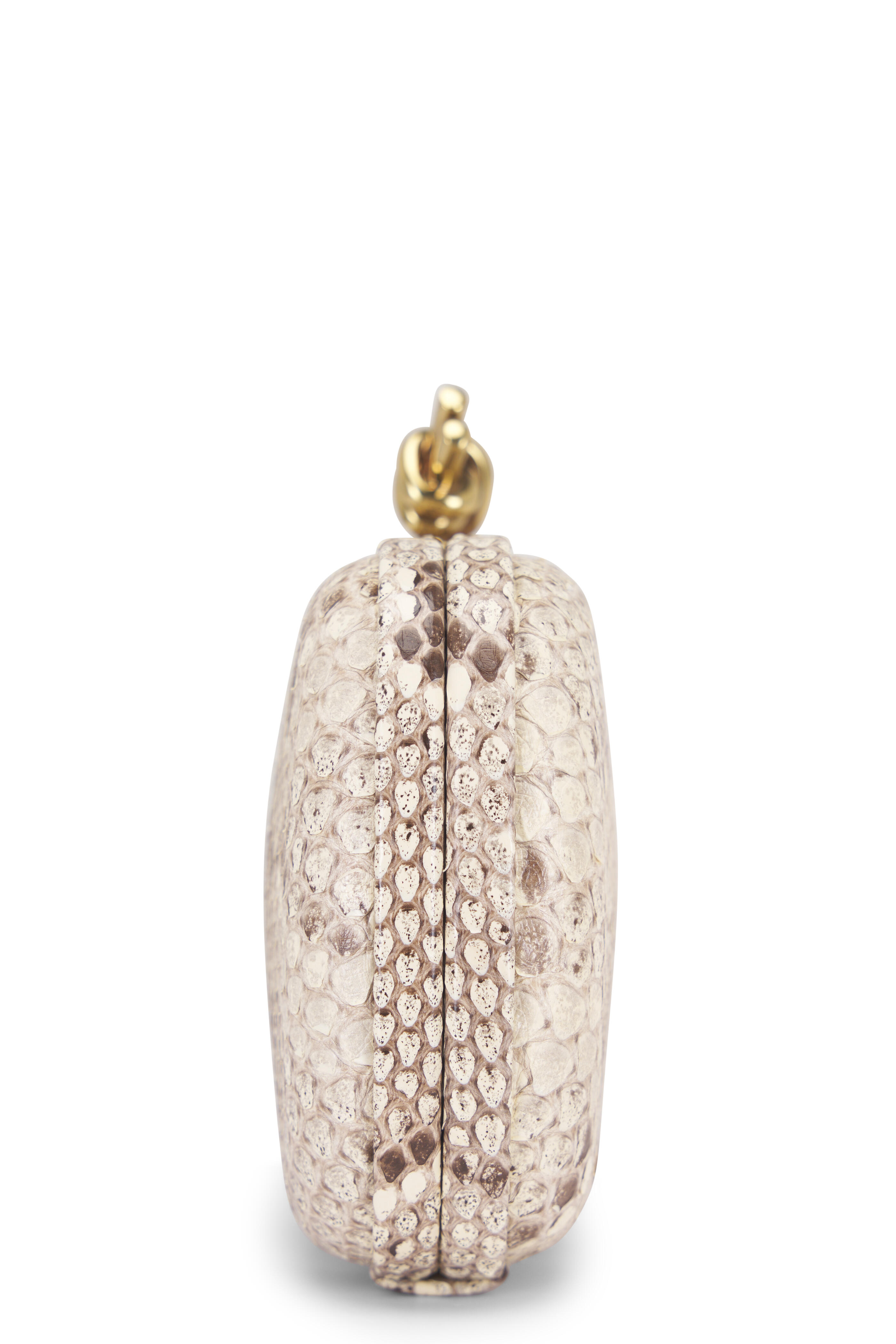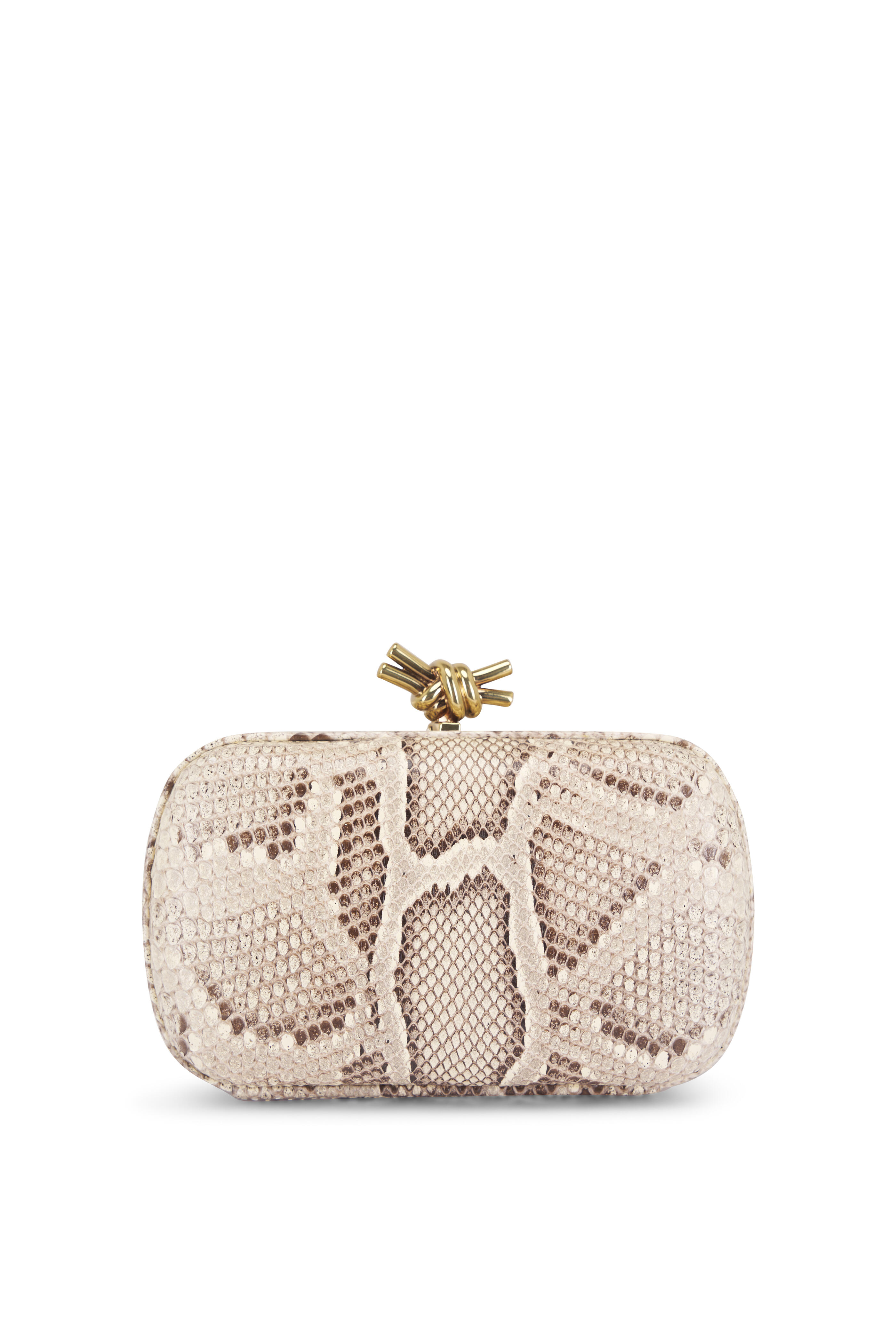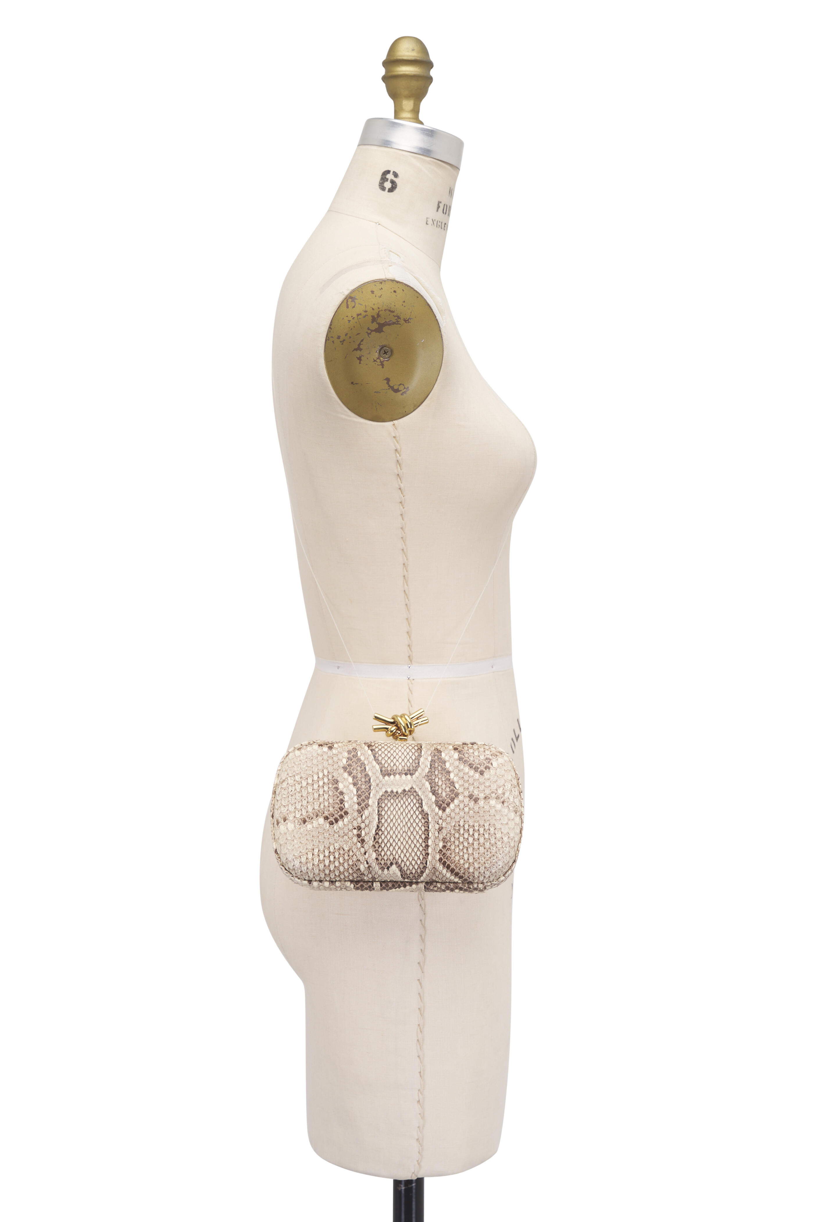 Python. Metallic knot clasp closure. Single interior compartment. Lambskin lining. Brass finish hardware. Made in Italy. Height: 11.5 cm | 4.5". Width: 19 cm | 7.5". Depth: 5 cm | 2".