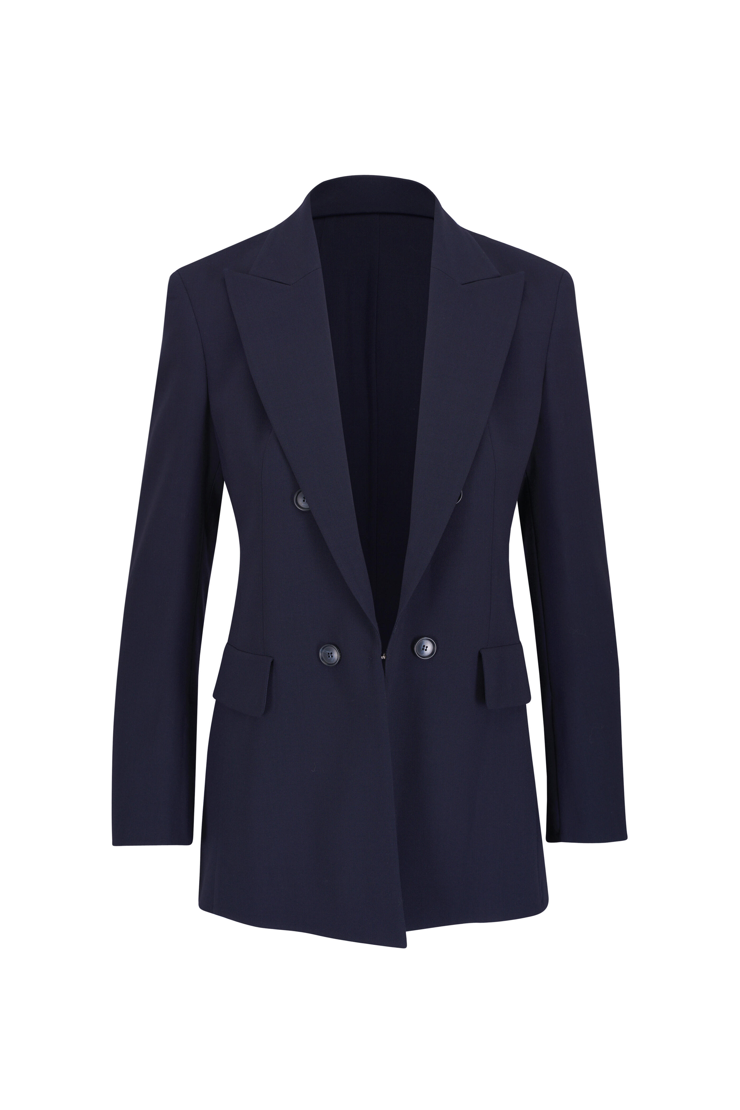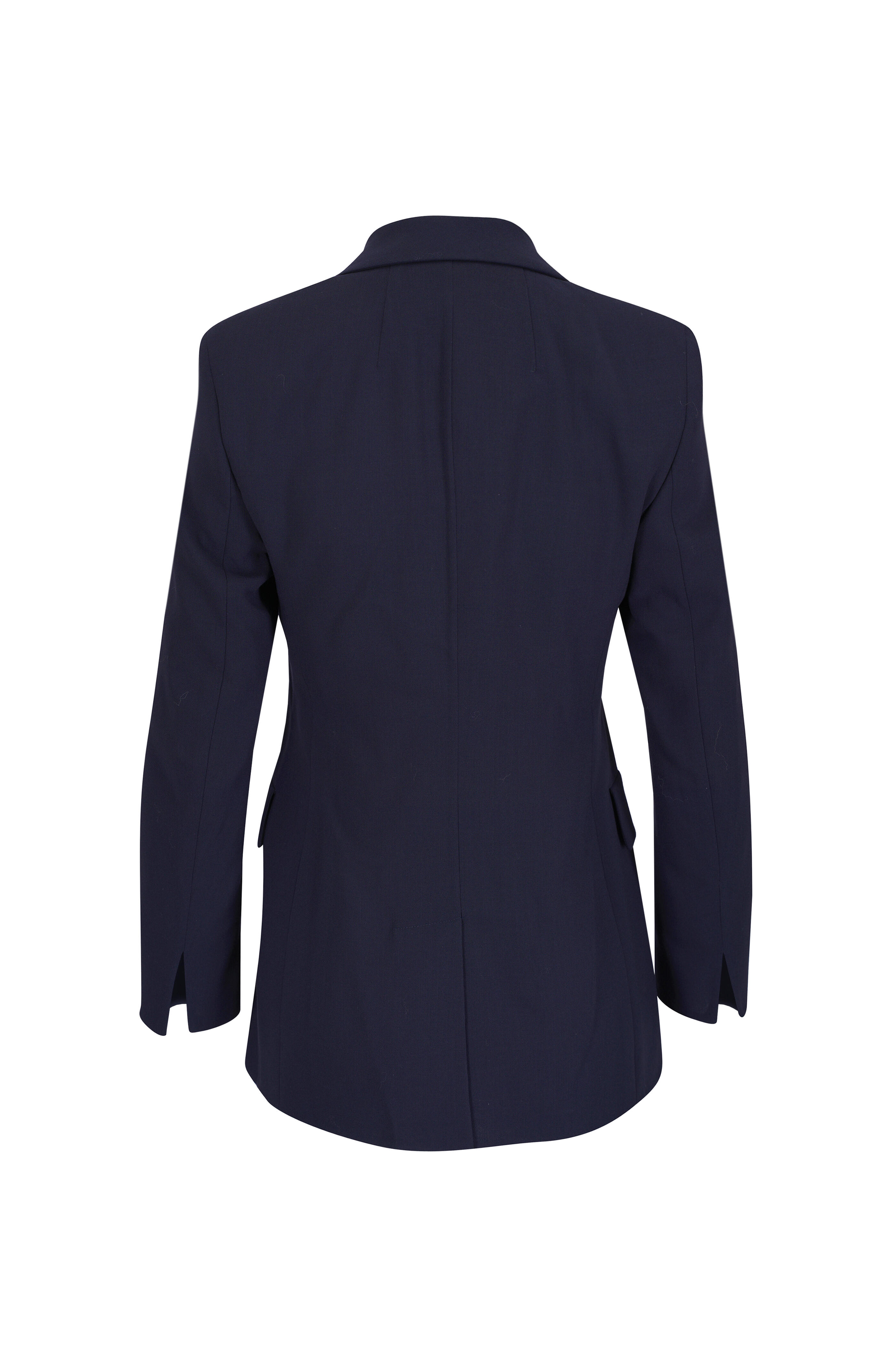 Peak lapel collar. Front hook-and-eye closure. Faux lower flap pockets. Back vent. Fabric from Italy. Approximately 28" shoulder to hem (measurements taken from size 4). 99% wool, 1% elastane. Dry clean.