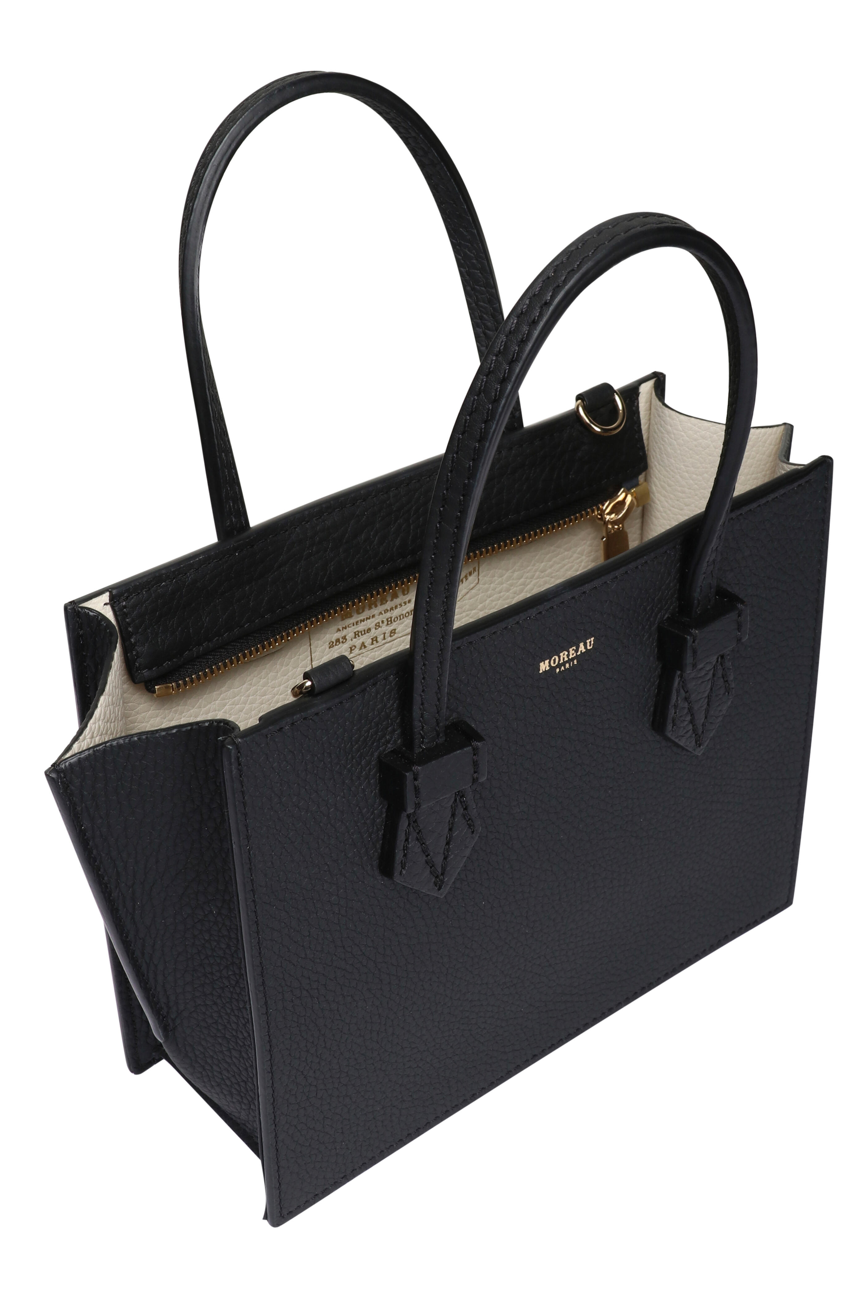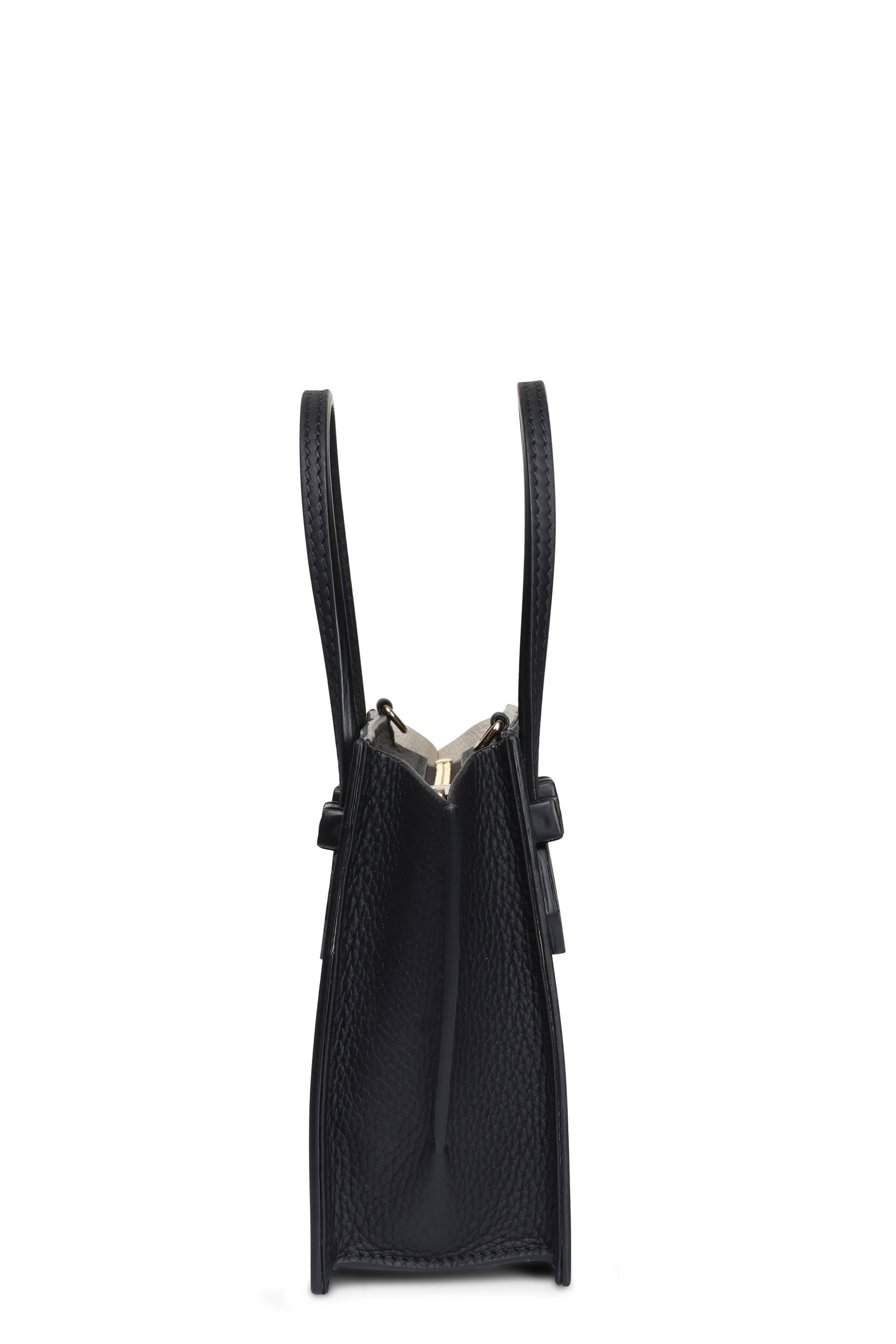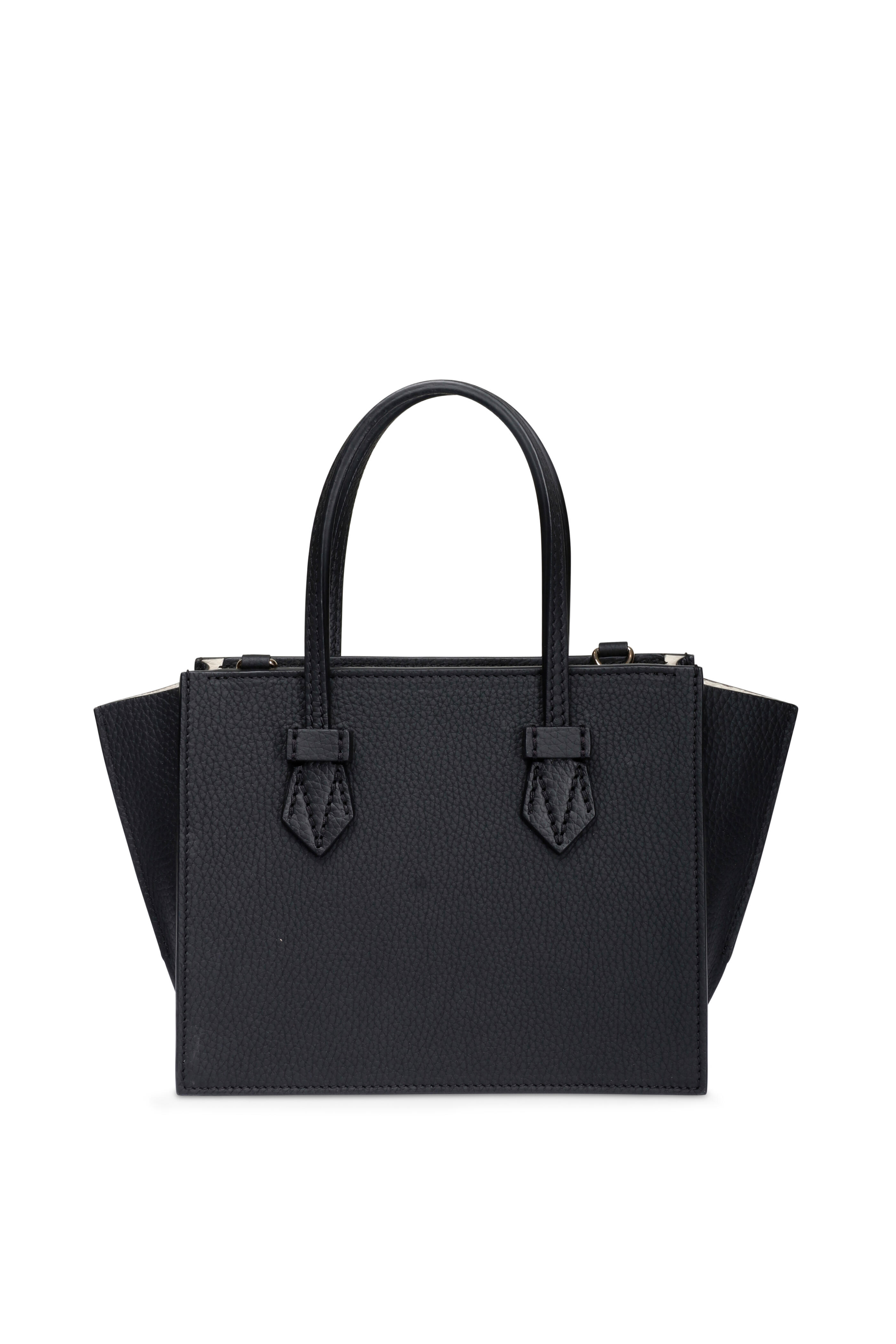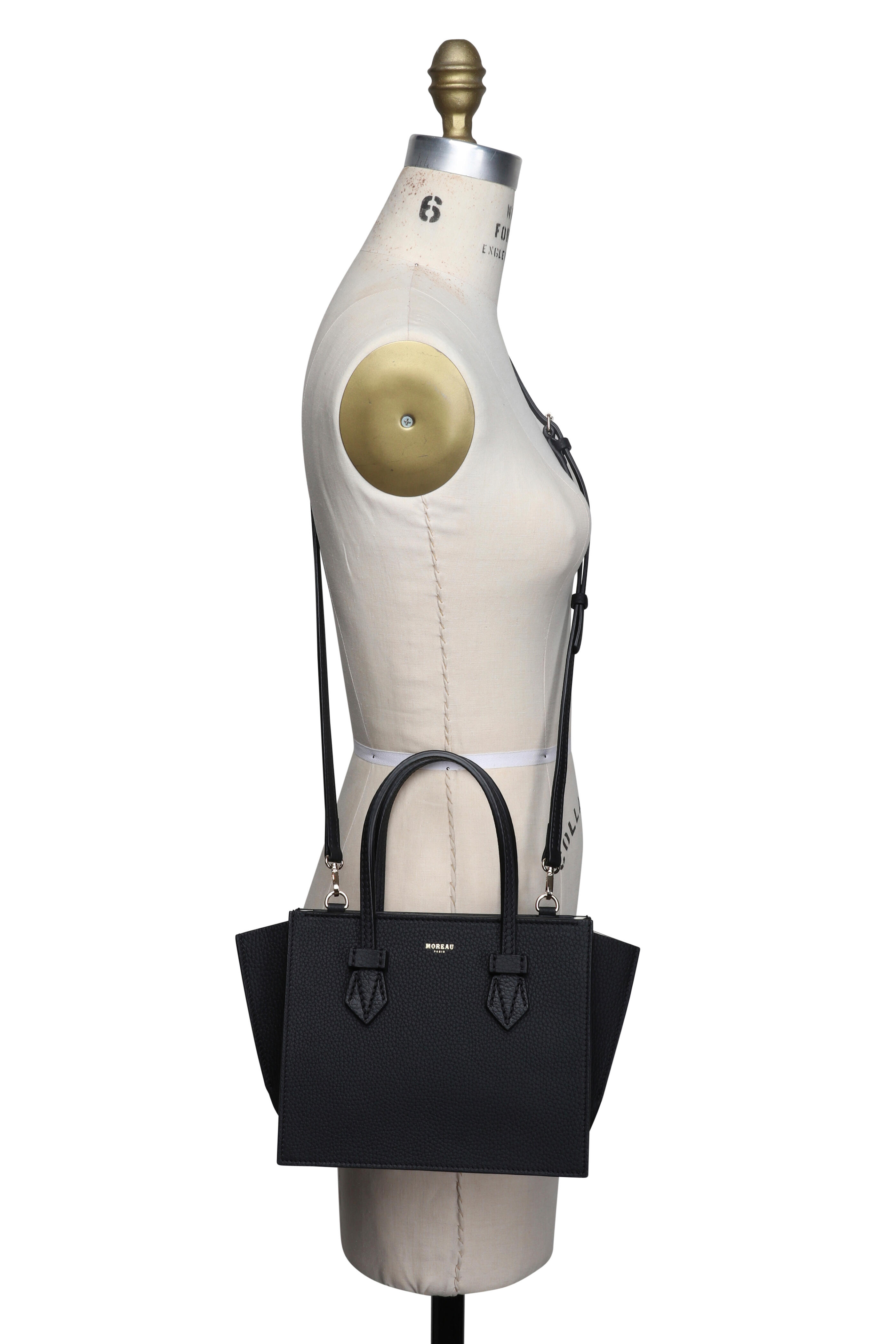 Calfskin leather outer. Ivory leather lining. Top zip closure. Two retractable top handles. Detachable crossbody strap. Interior slip pocket. Made in Italy. 8.7” W x 7” H x 2.7” D.