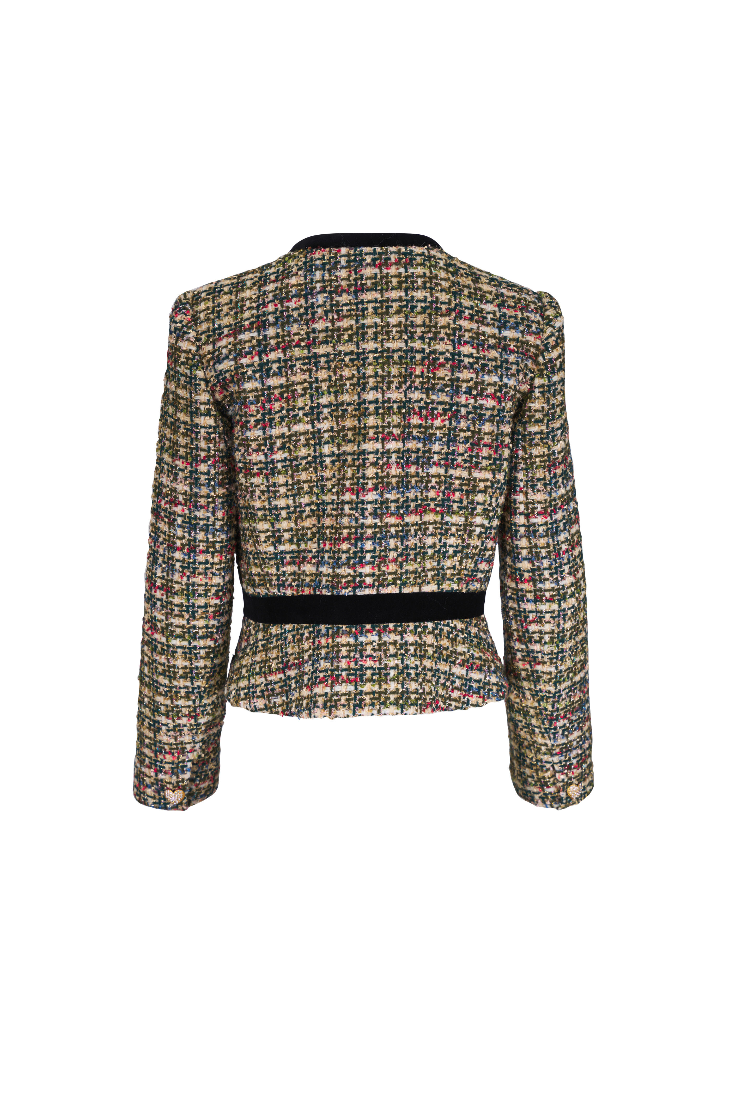 Crew neckline. Concealed front snap button placket. Chest welt pocket. Single button cuffs; crystal heart buttons. Velvet bow detailing. Made in Italy. Approximately 20 ½ shoulder to hem (measurements taken from size 6). 36% acrylic, 36% wool, 22% polyamide, 6% metallic fiber; lined. Dry clean.