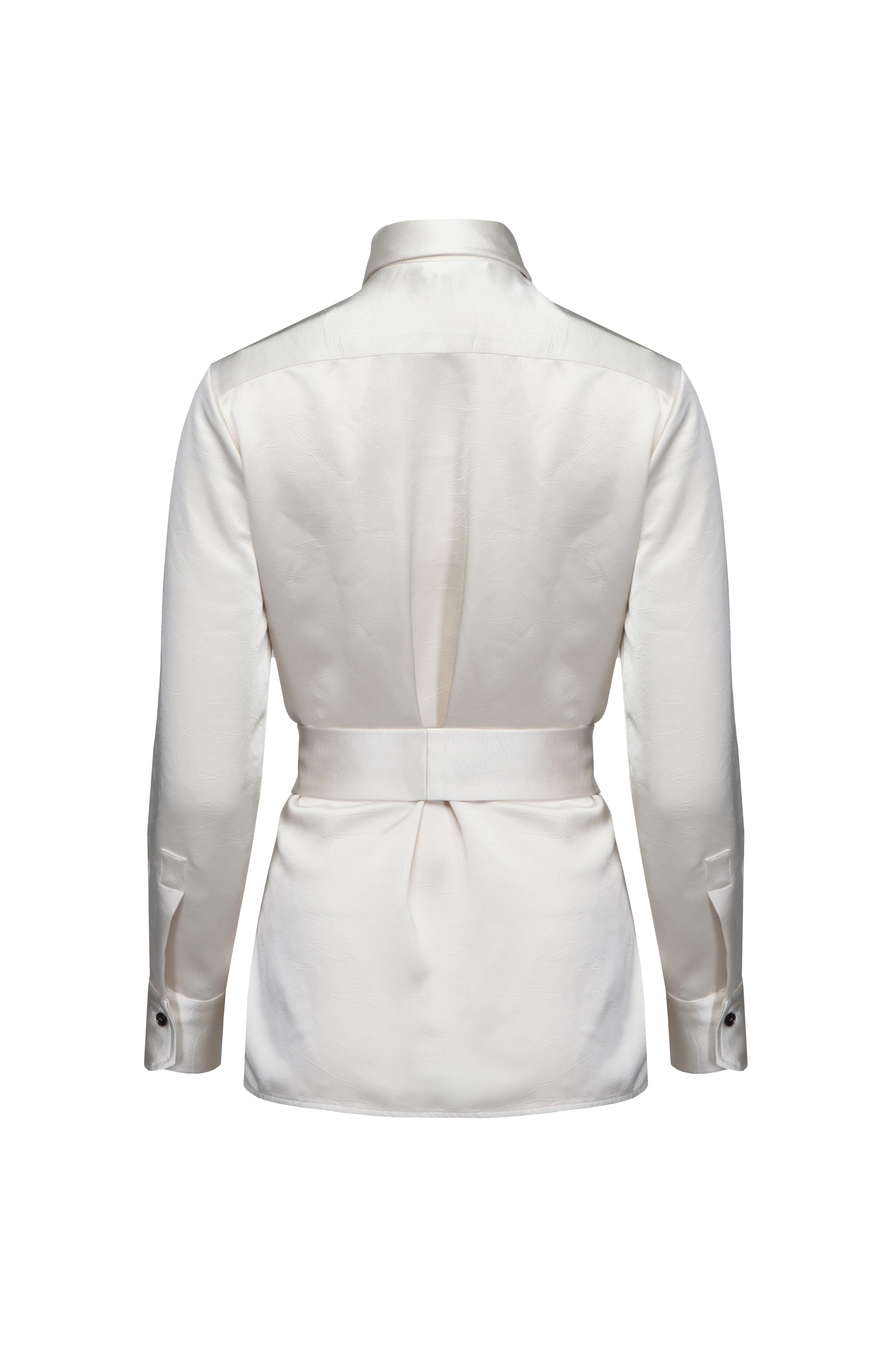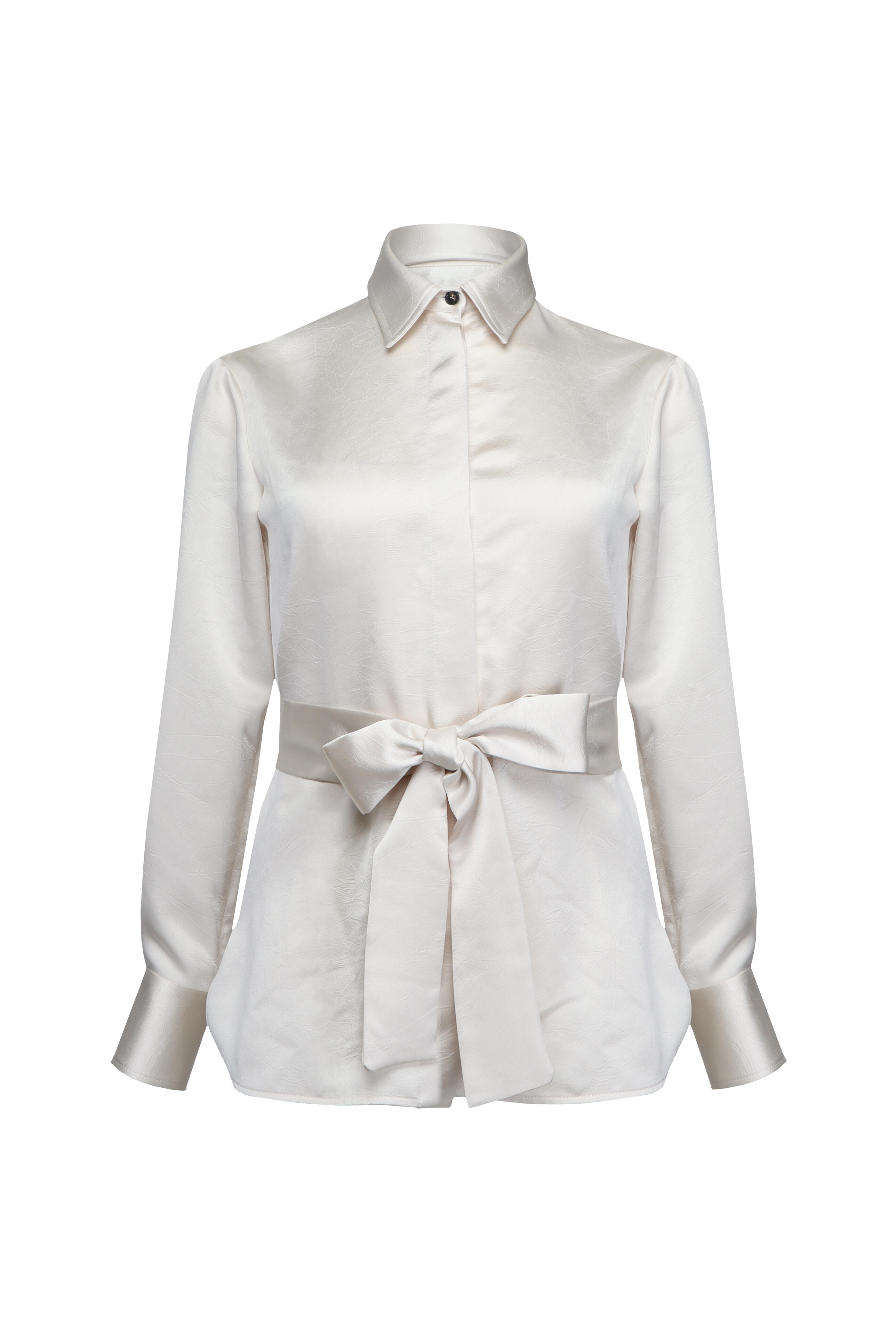 Collar. Long sleeves; button cuffs. Button front closure. Removable self-tie belt; self-fabrication. Relaxed fit. Made in Italy. 100% silk. Dry clean.