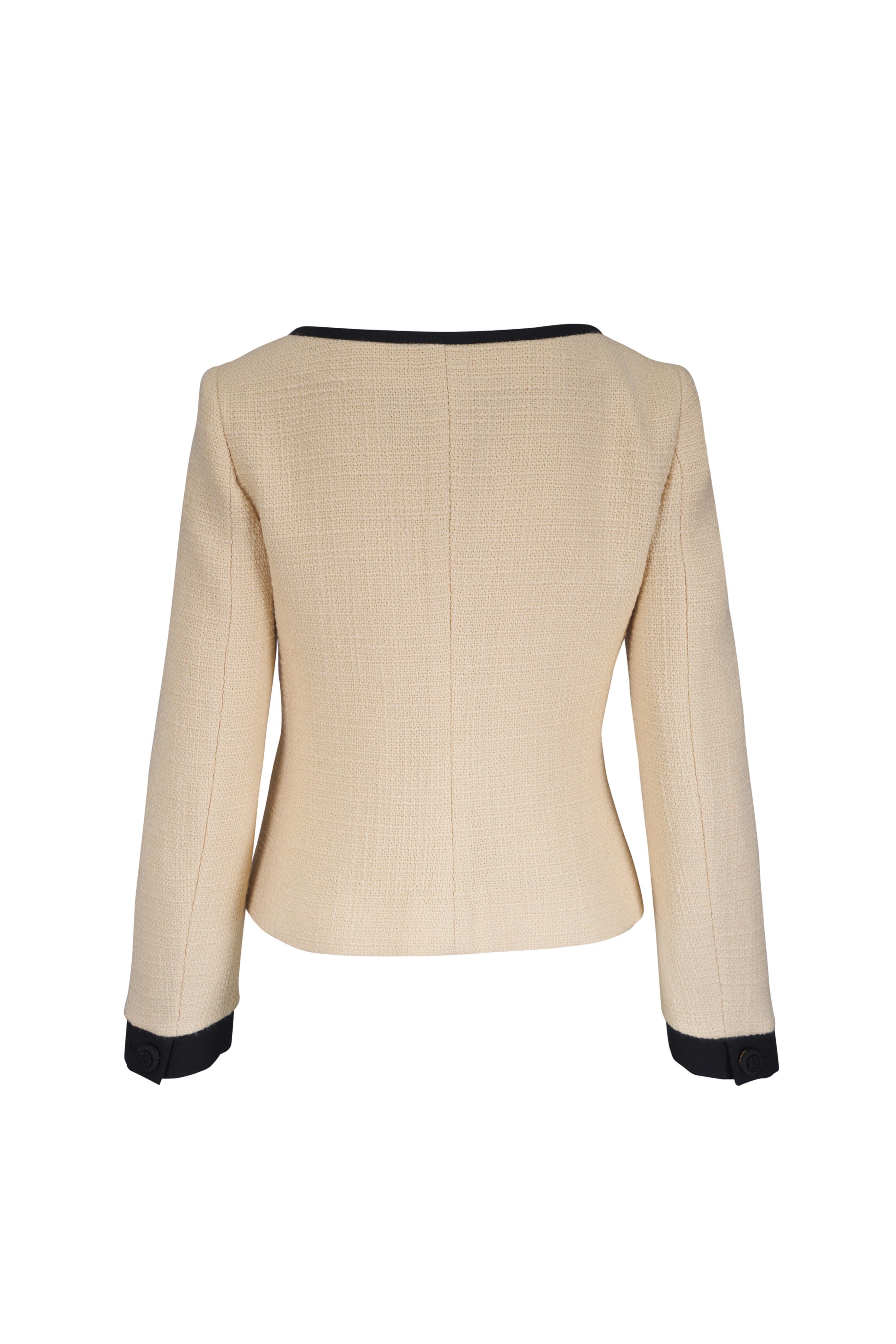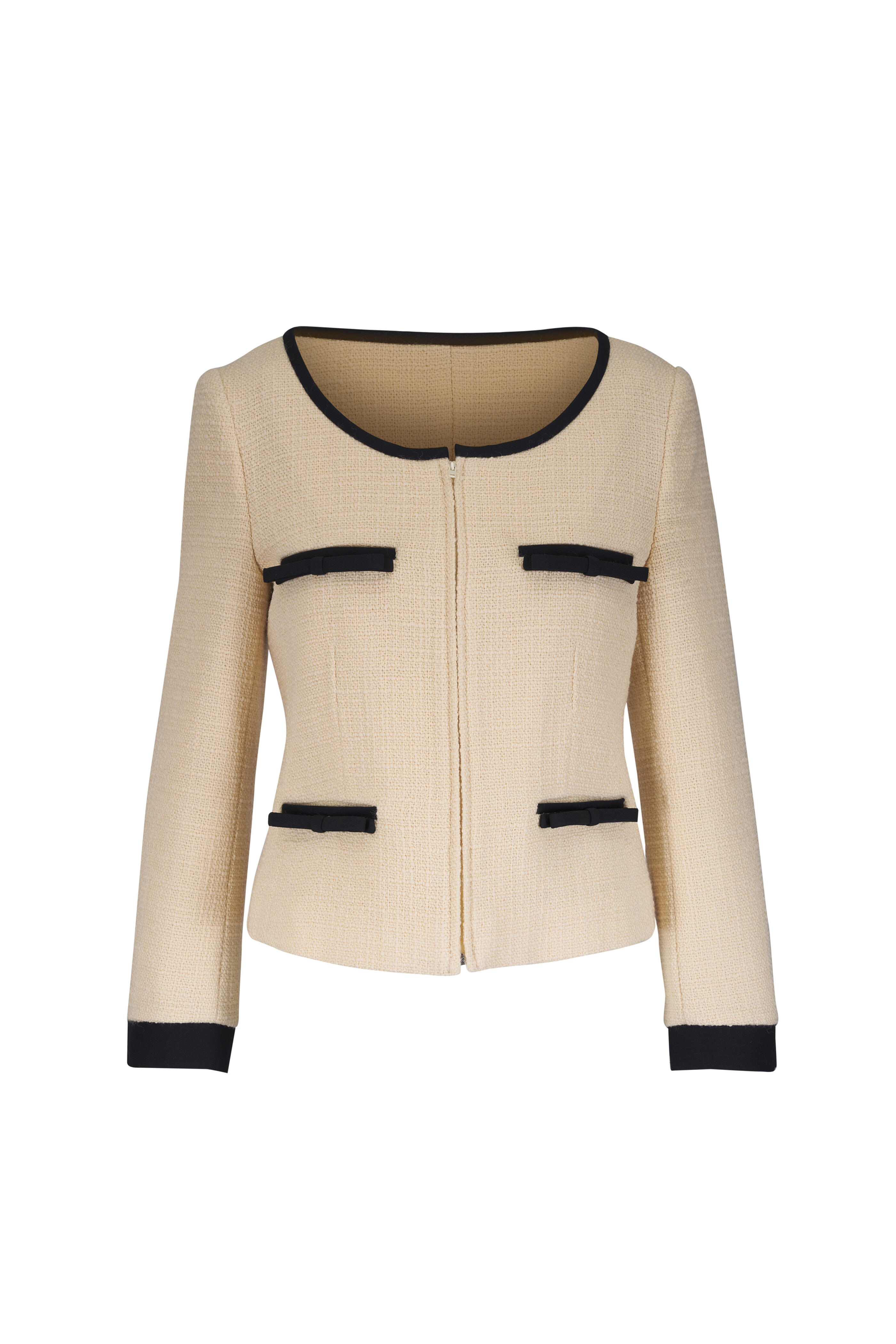 Scoop neckline. Front zip placket. Faux lower and chest pockets with ribbon detail. Single button cuffs. Made in Italy. Approximately 20" shoulder to hem (measurements taken from size 4). 97% virgin wool, 3% polyamide. Dry clean.