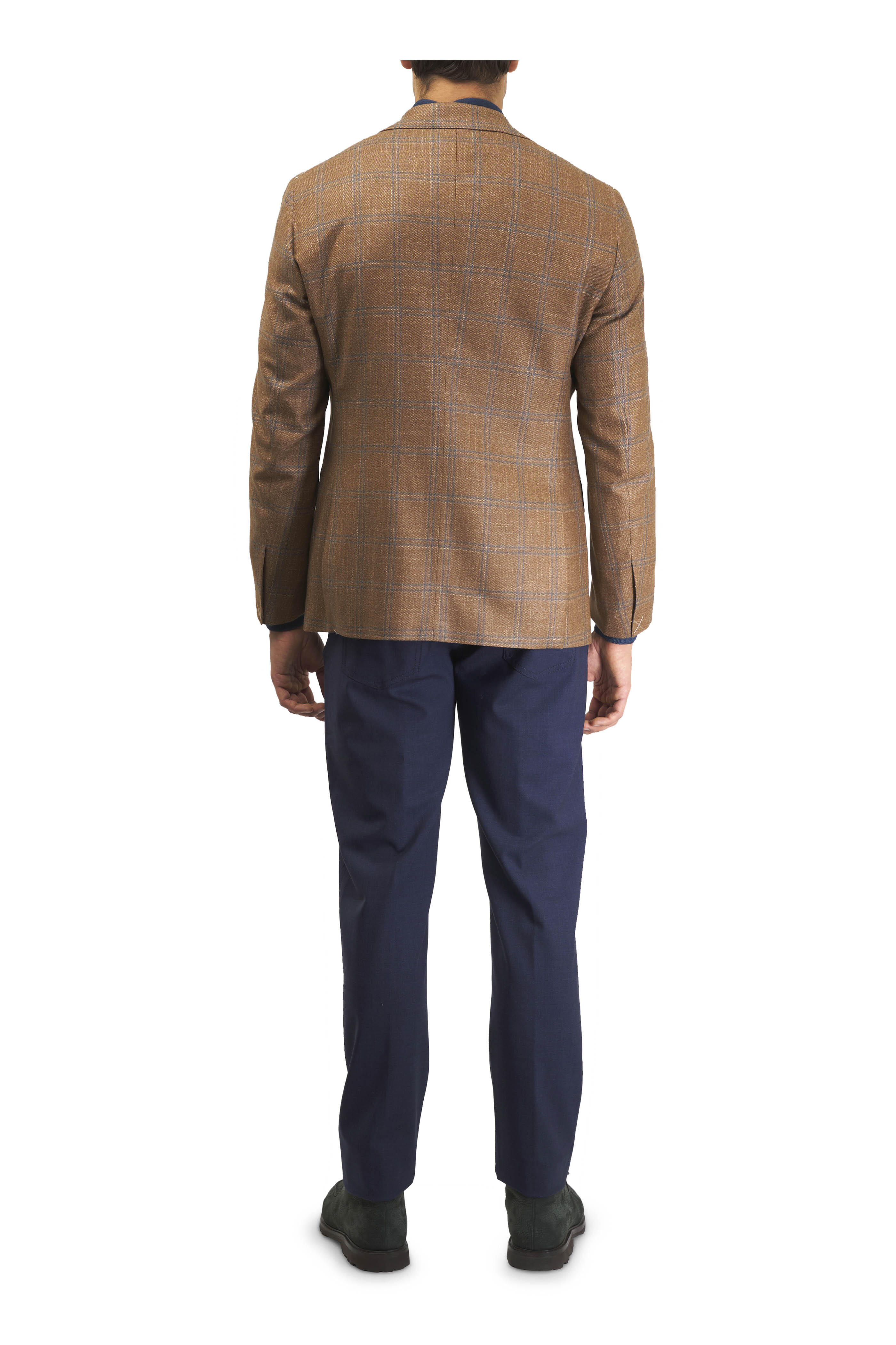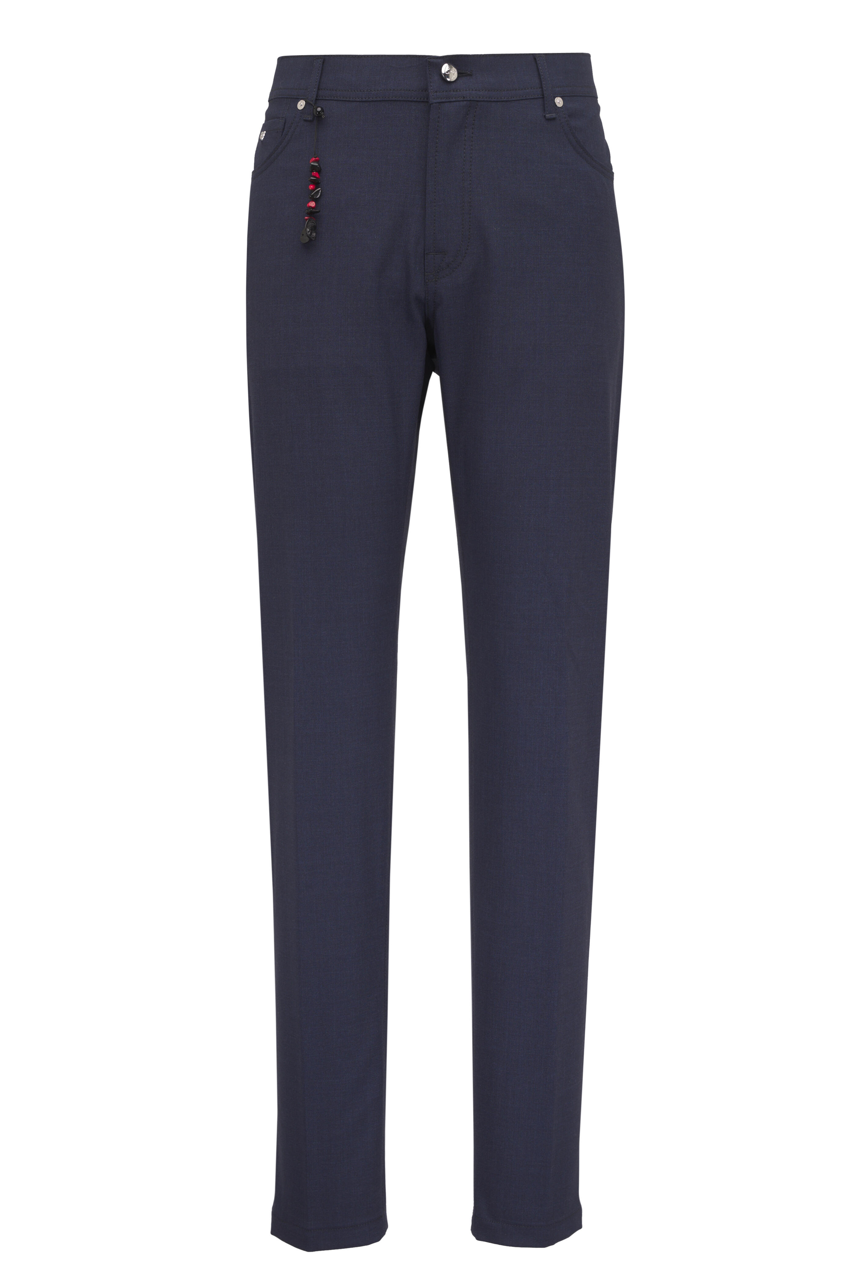 Zip fly; button closure. Belt loops. Five pocket styling. Made in Italy. 35" inseam. 97% wool, 3% elastane. Dry clean.