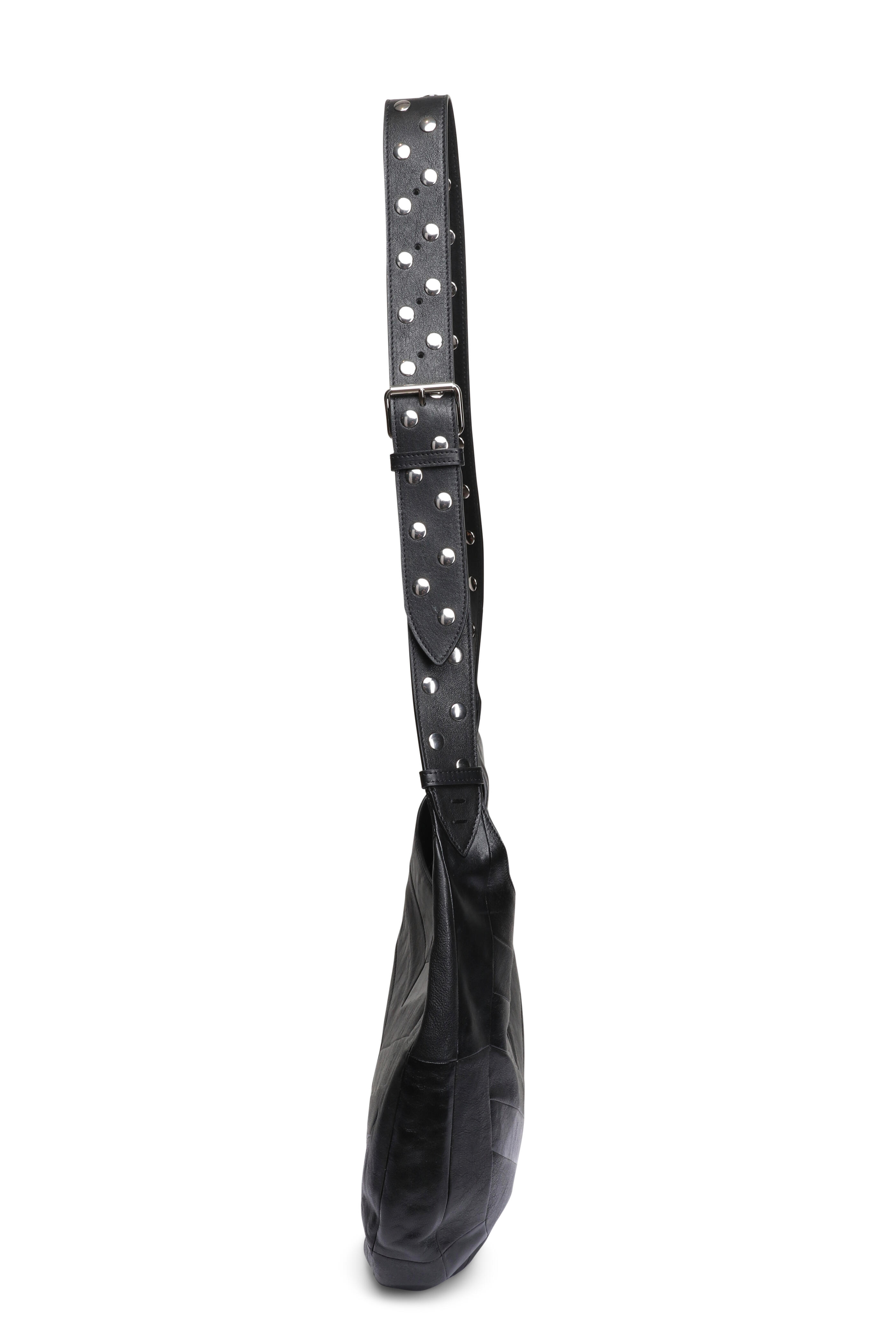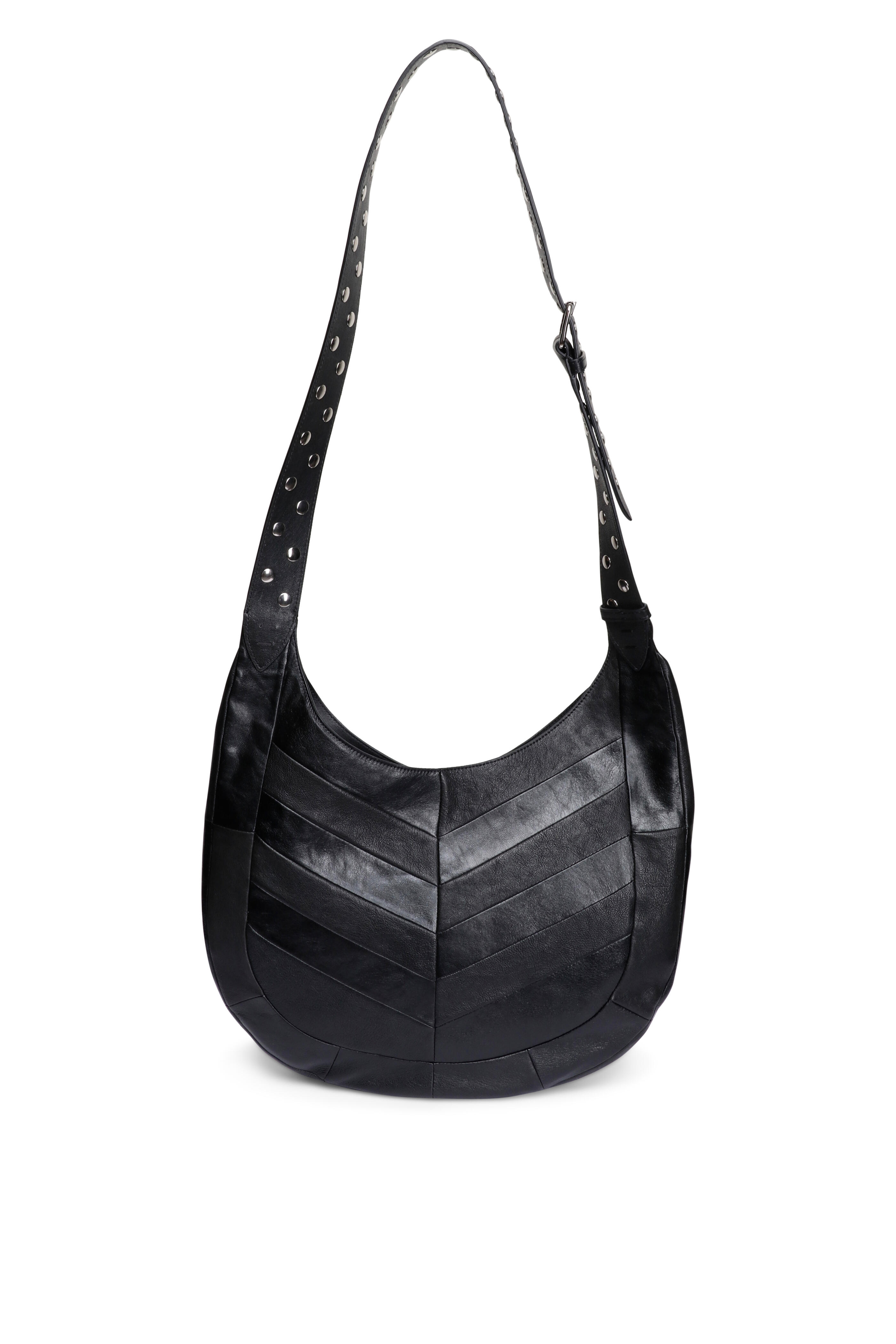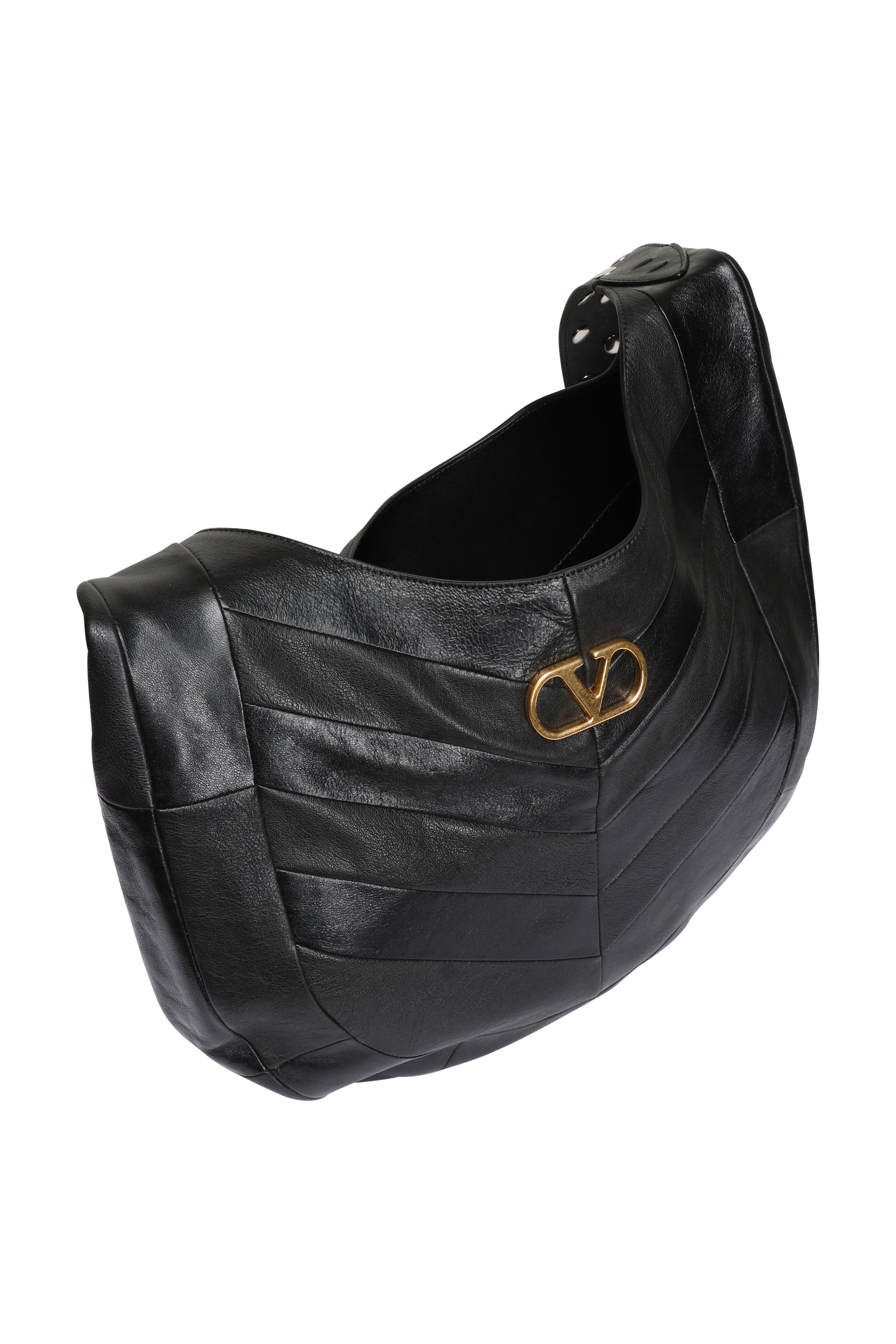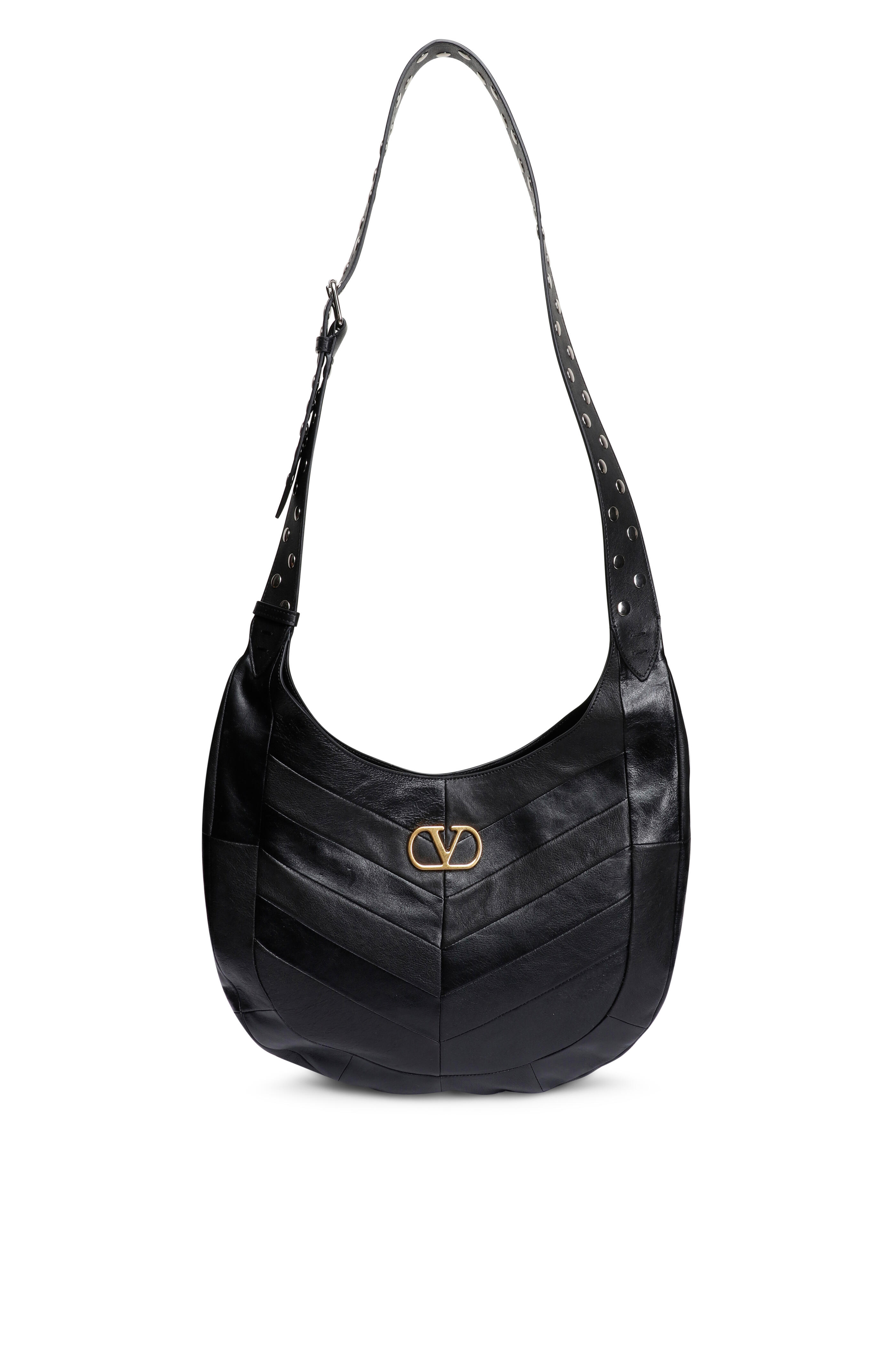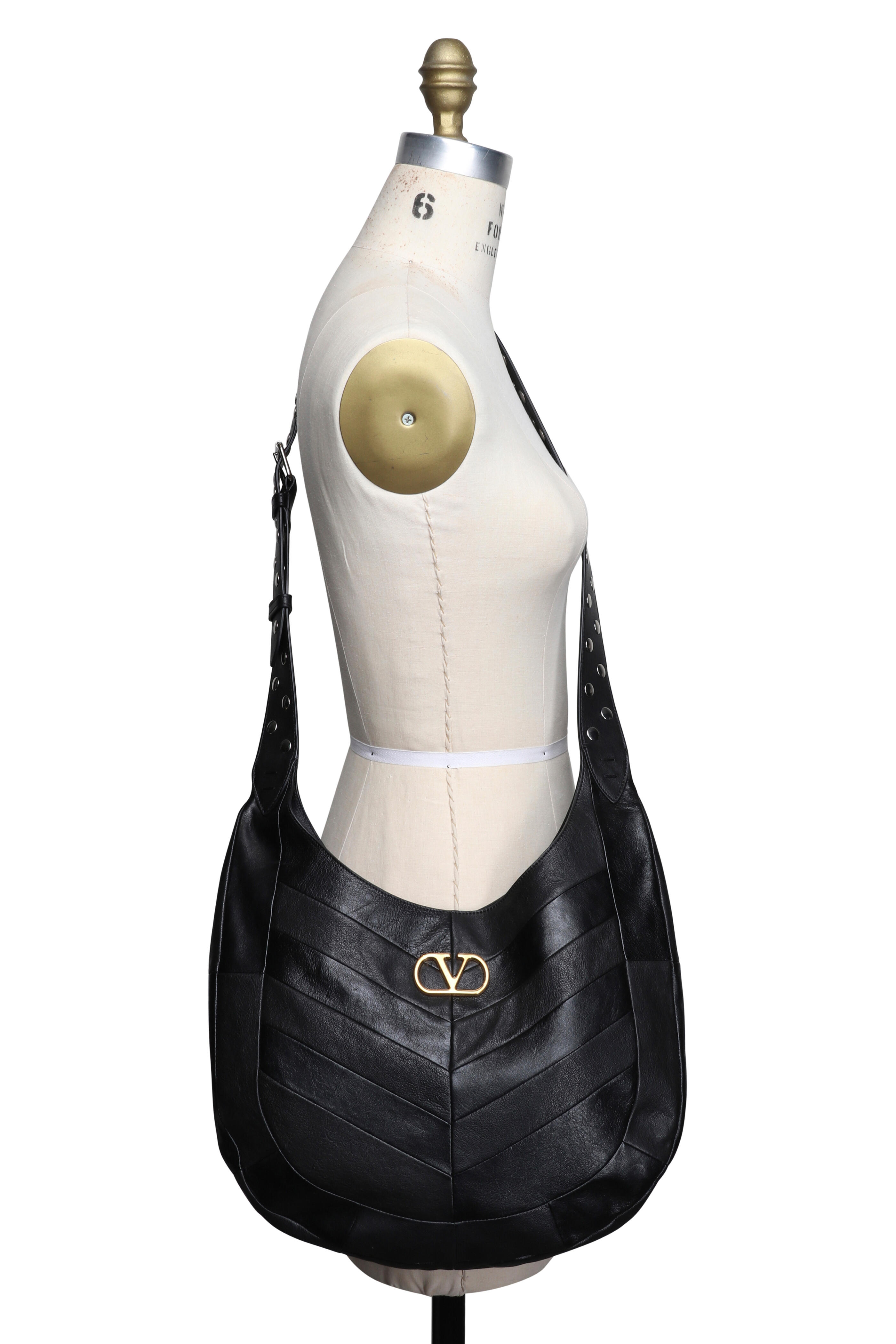 Matte nappa leather outer and lining. Open top. Adjustable leather buckle shoulder strap. Chevron patchwork design. VLogo signature metal feature. Palladium-finish studs. Antique brass finish. One main compartment. Made in Italy. 13.8” W x 10.6” H x 1.6” D. Shoulder drop: 19.7”.