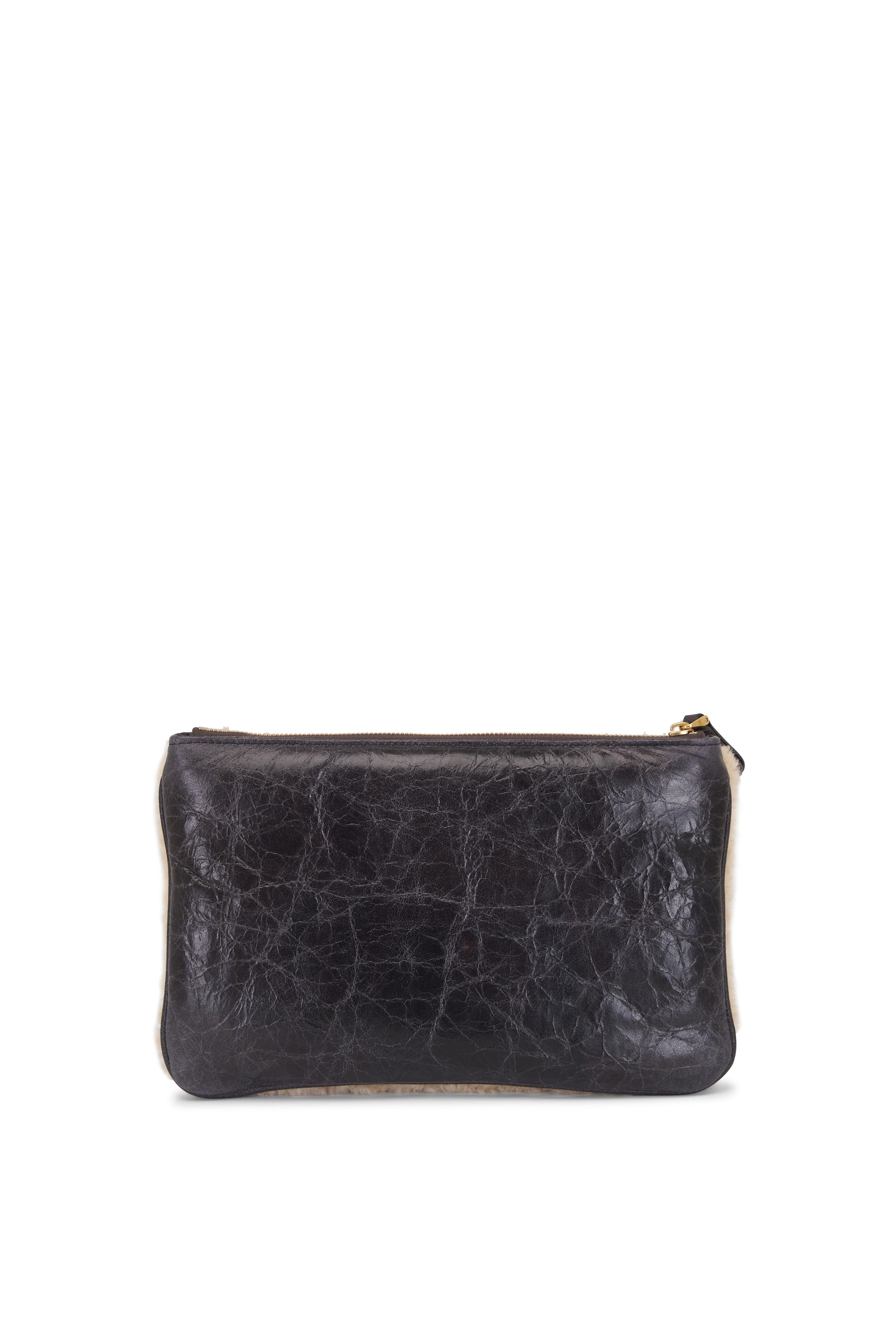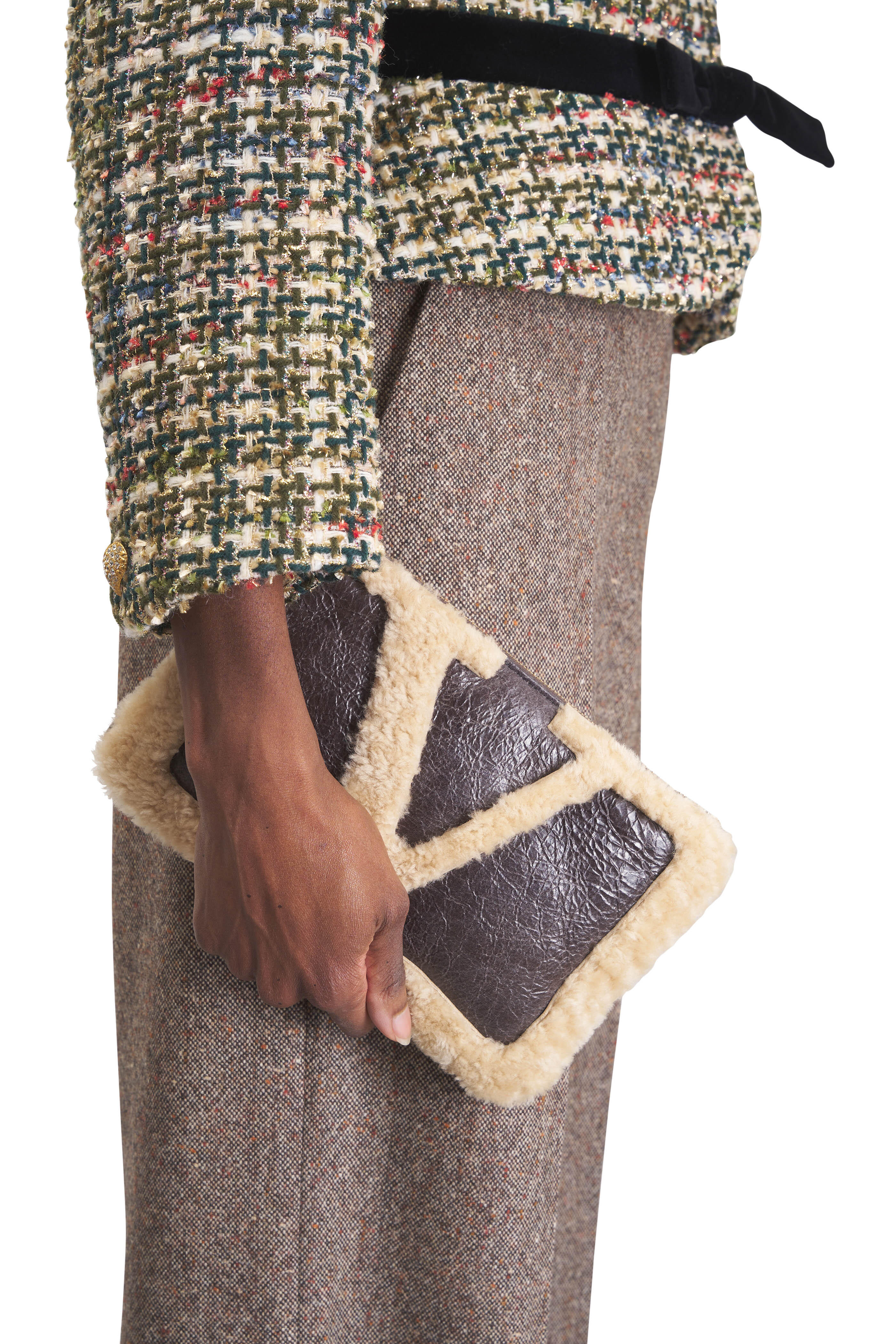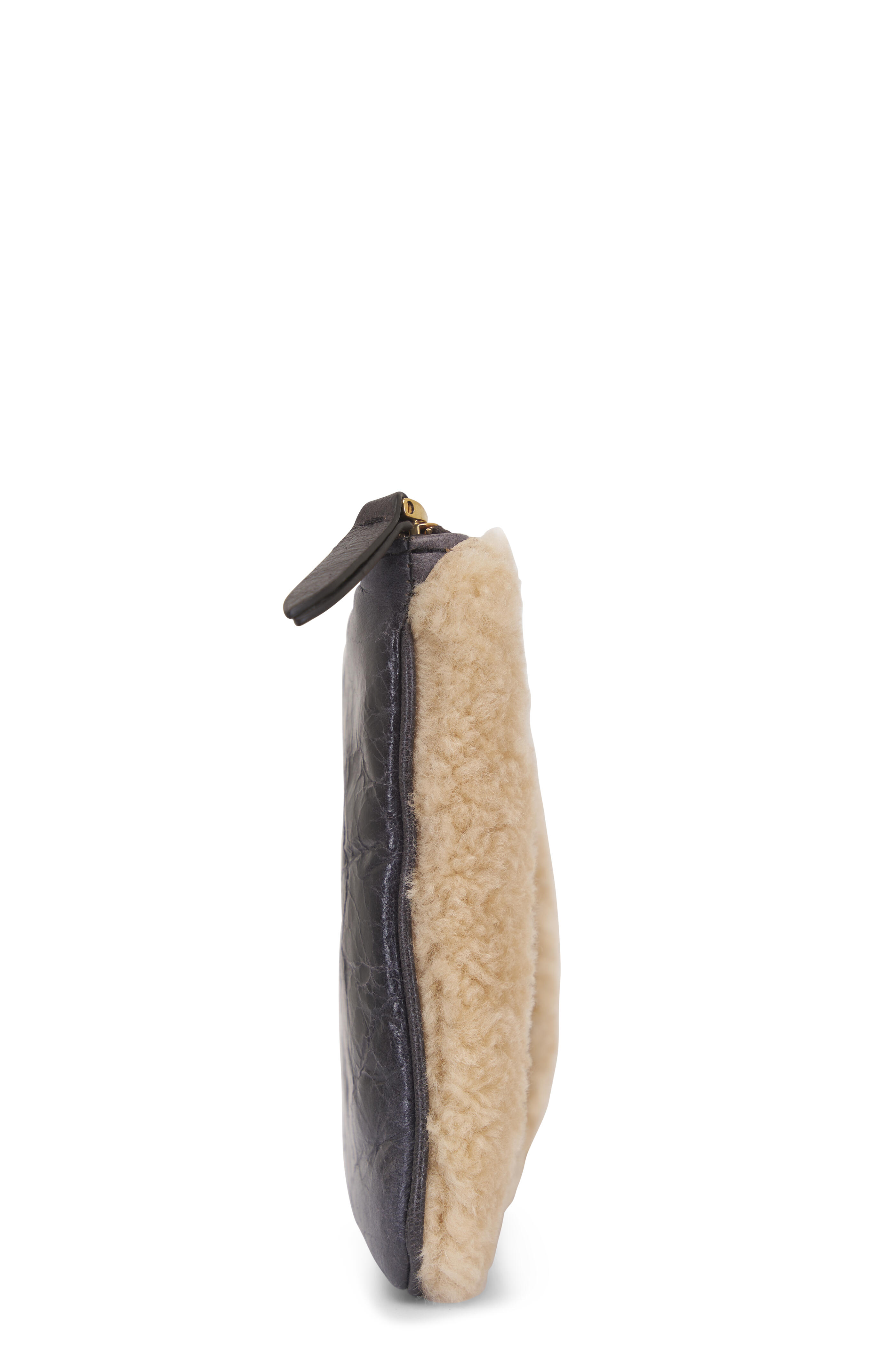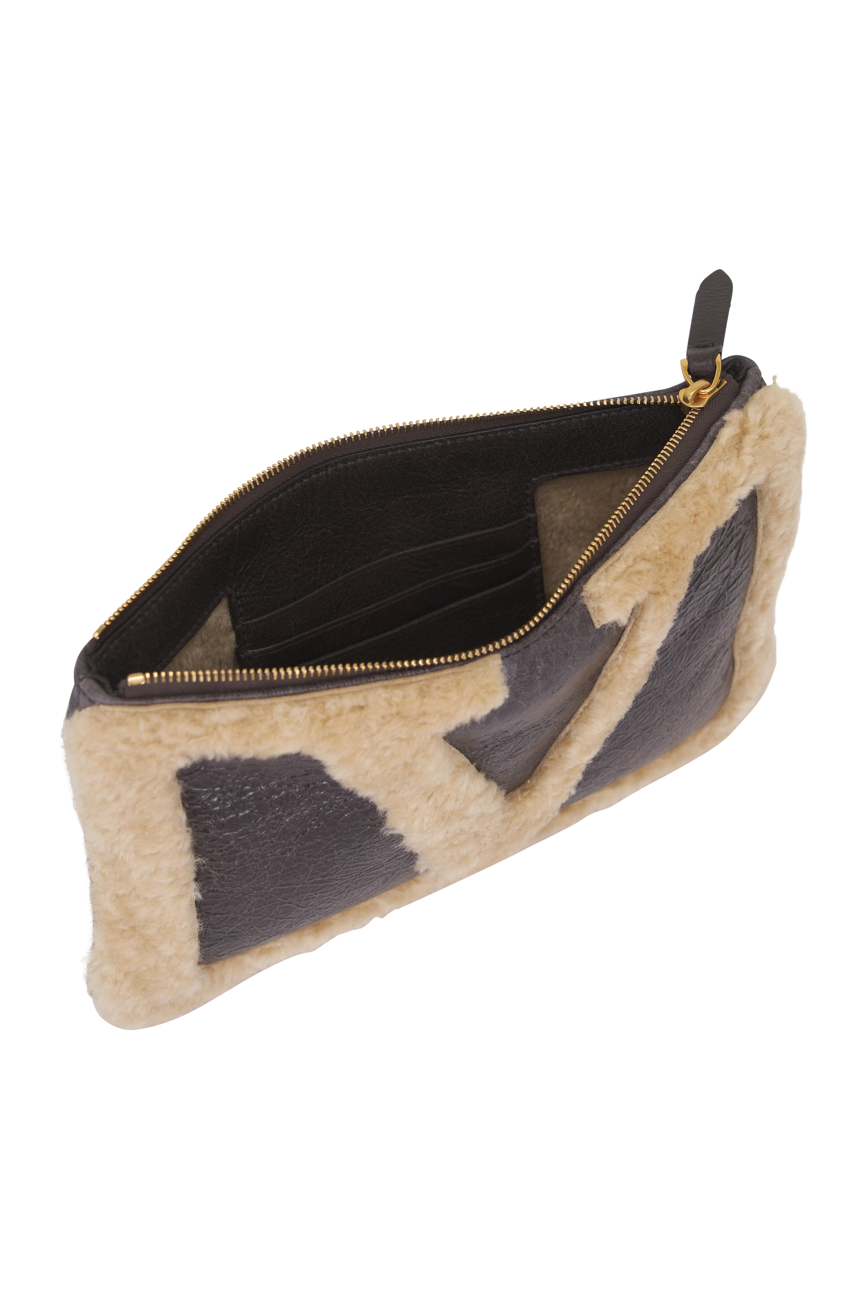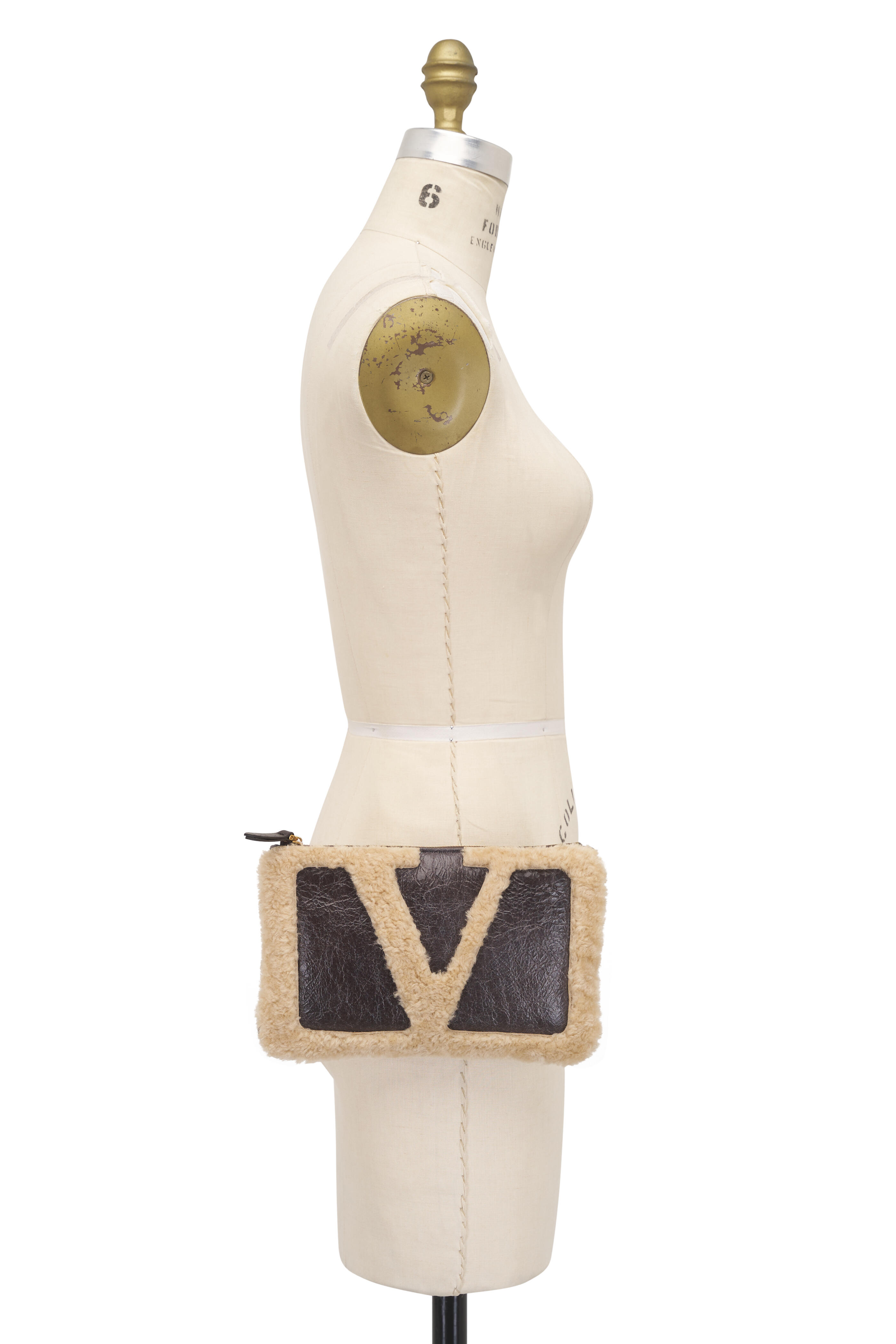 Sheepskin leather & shearling. Top zip. Three card slots. Sheepskin lining. VLogo signature logo accent. Antique gold tone hardware. Made in Italy. Color: Cafe Fango & Dark Beige. Width: 9.1". Height: 6.3".