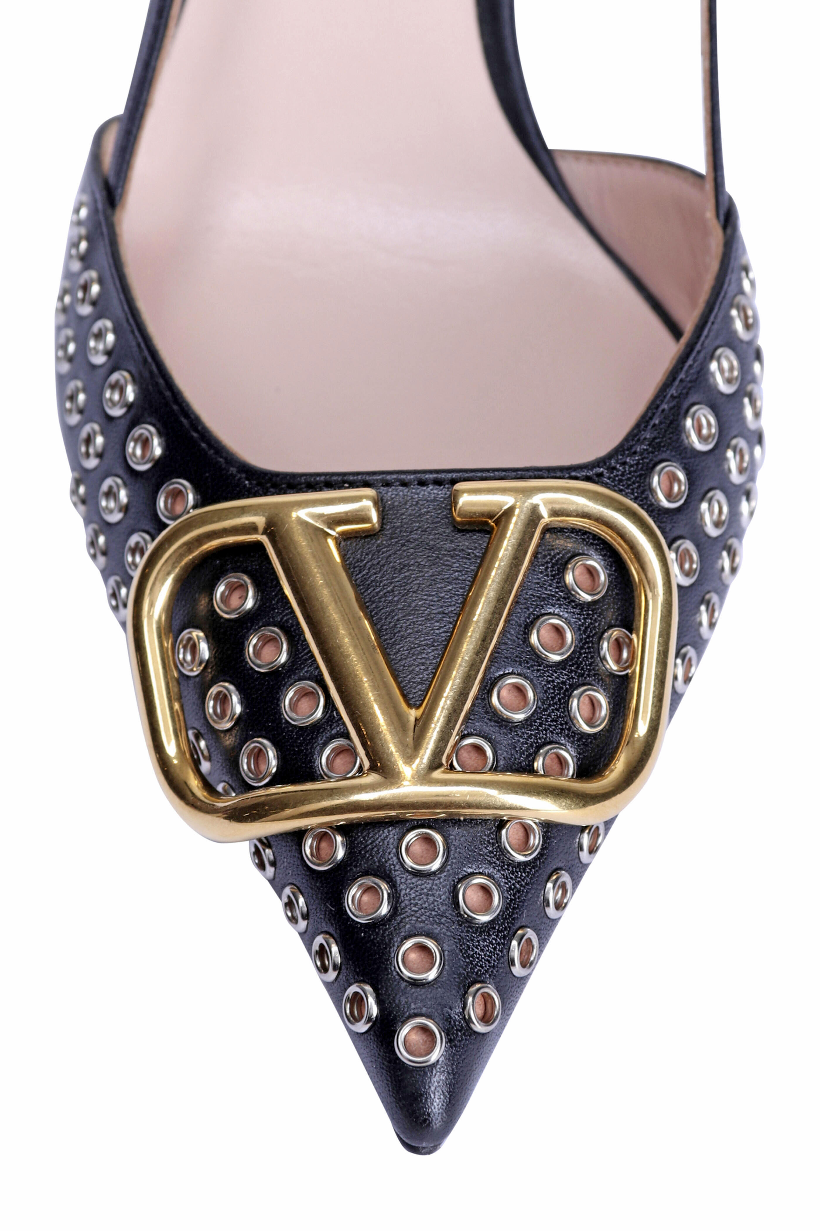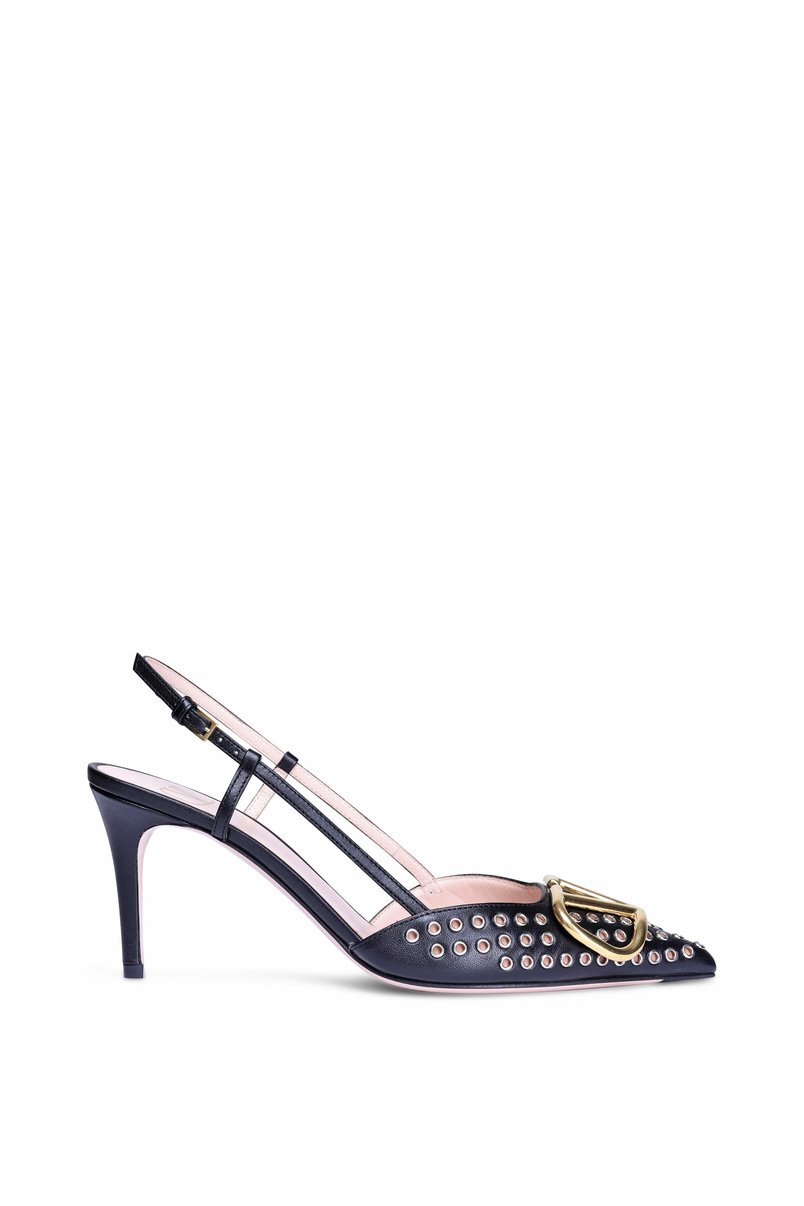 Calfskin leather upper. Leather lining and sole. Pointed toe. Adjustable slingback strap. VLogo signature accent. Metal eyelet embellishments. Vintage-effect brass. Slip-on style. Stiletto heel. Made in Italy. Heel measurement: 80mm.