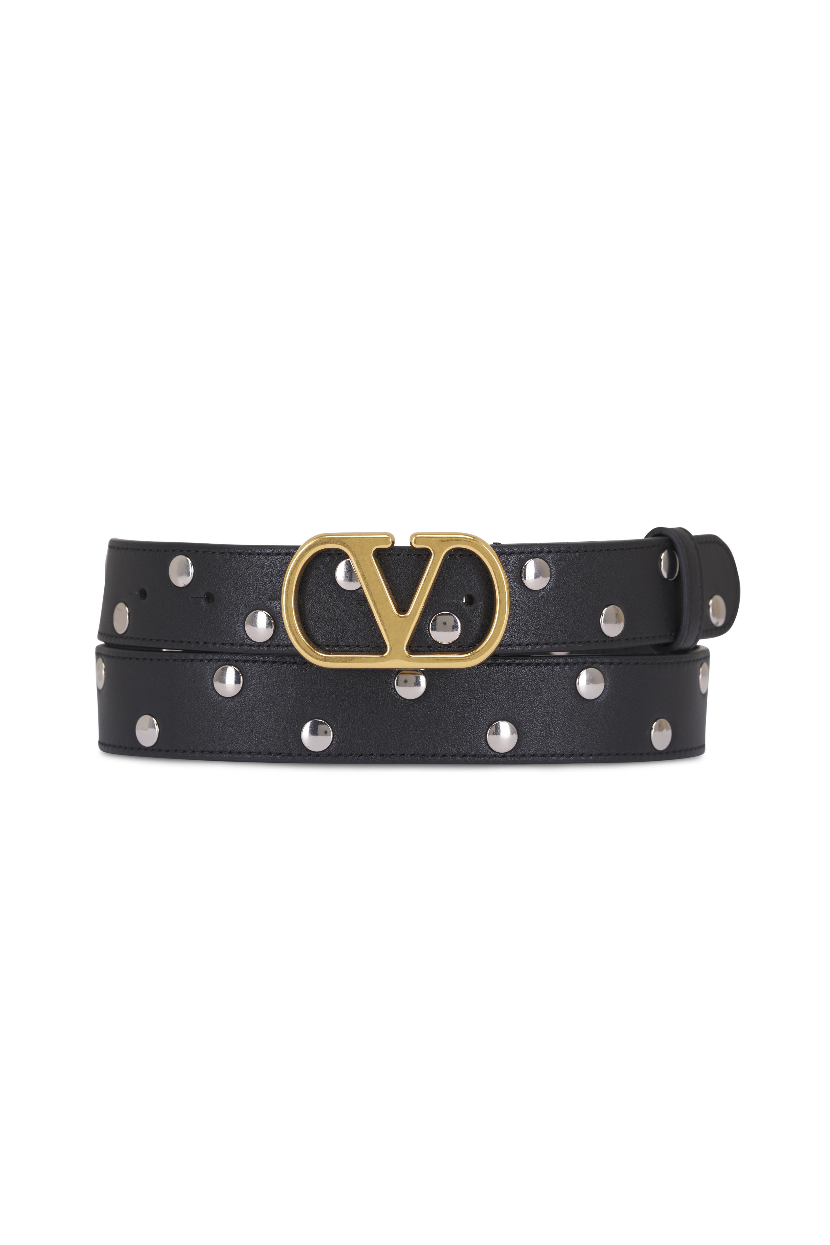 Leather. VLogo buckle; antique brass finish. Single loop keeper. Round tip. Palladium-finish metal rivets. Made in Italy. Width: 30mm.