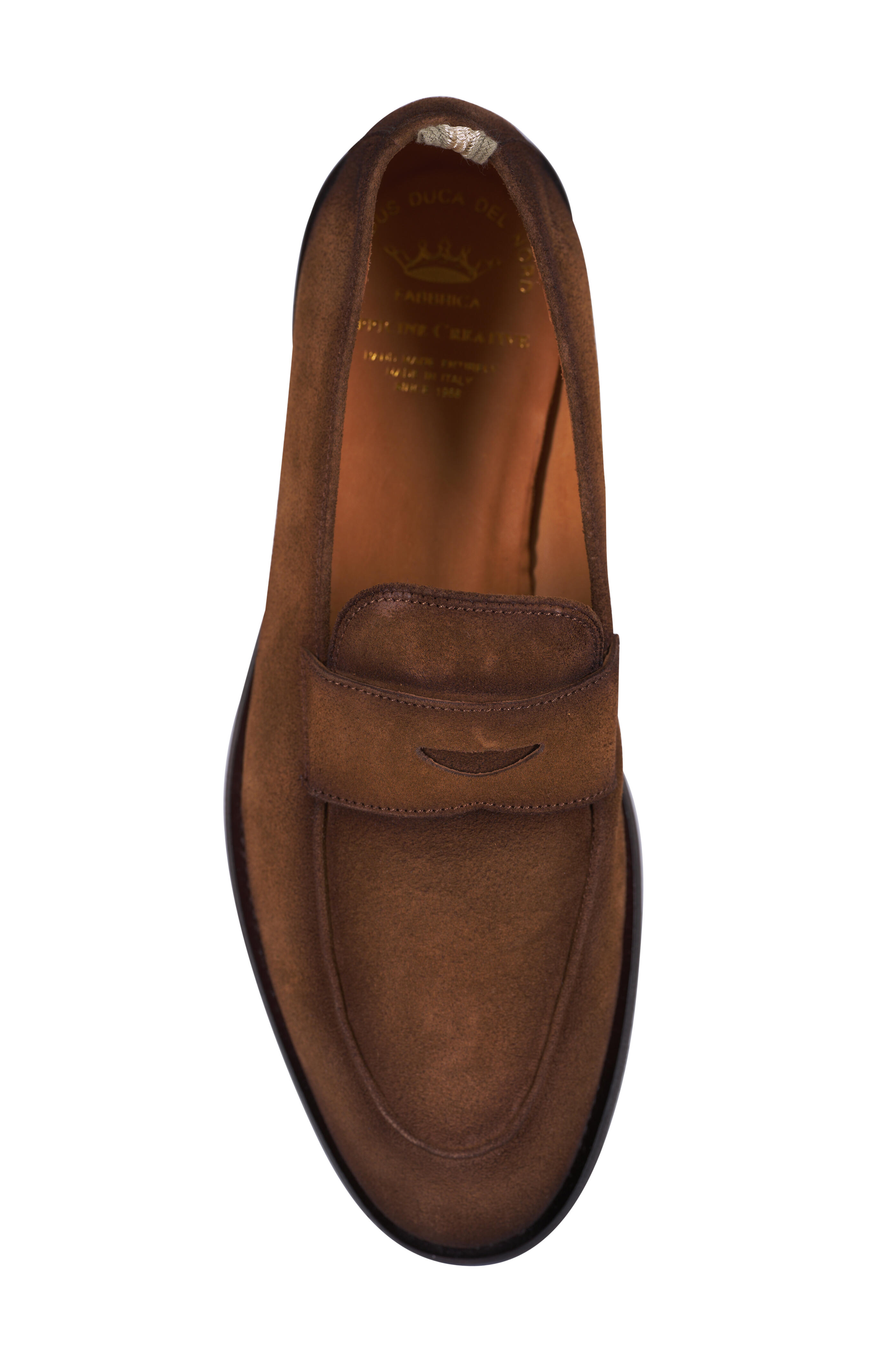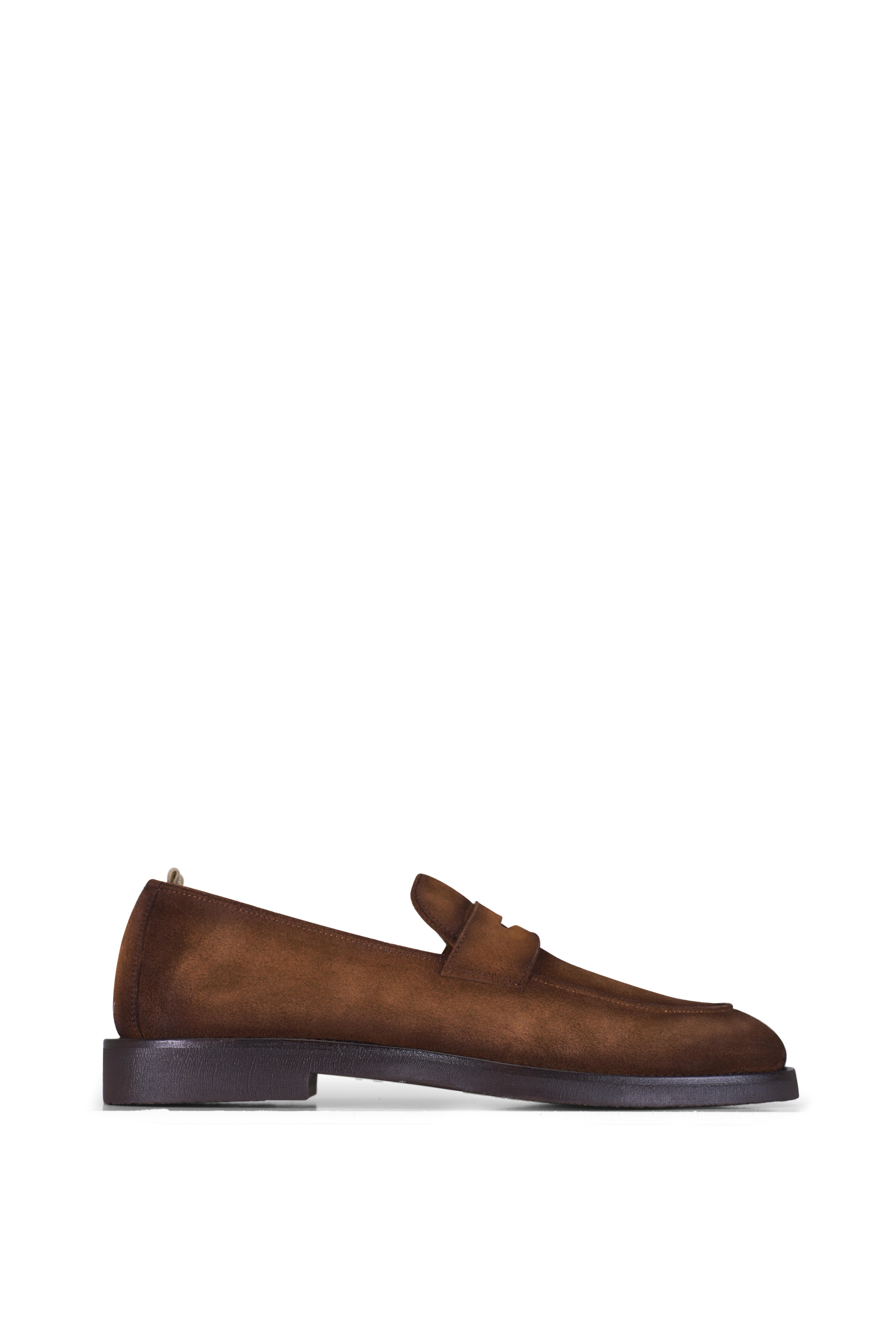 Suede upper. Almond toe. Slip on style. Penny strap at vamp. Leather lining and insole. Leather sole. Made in Italy.