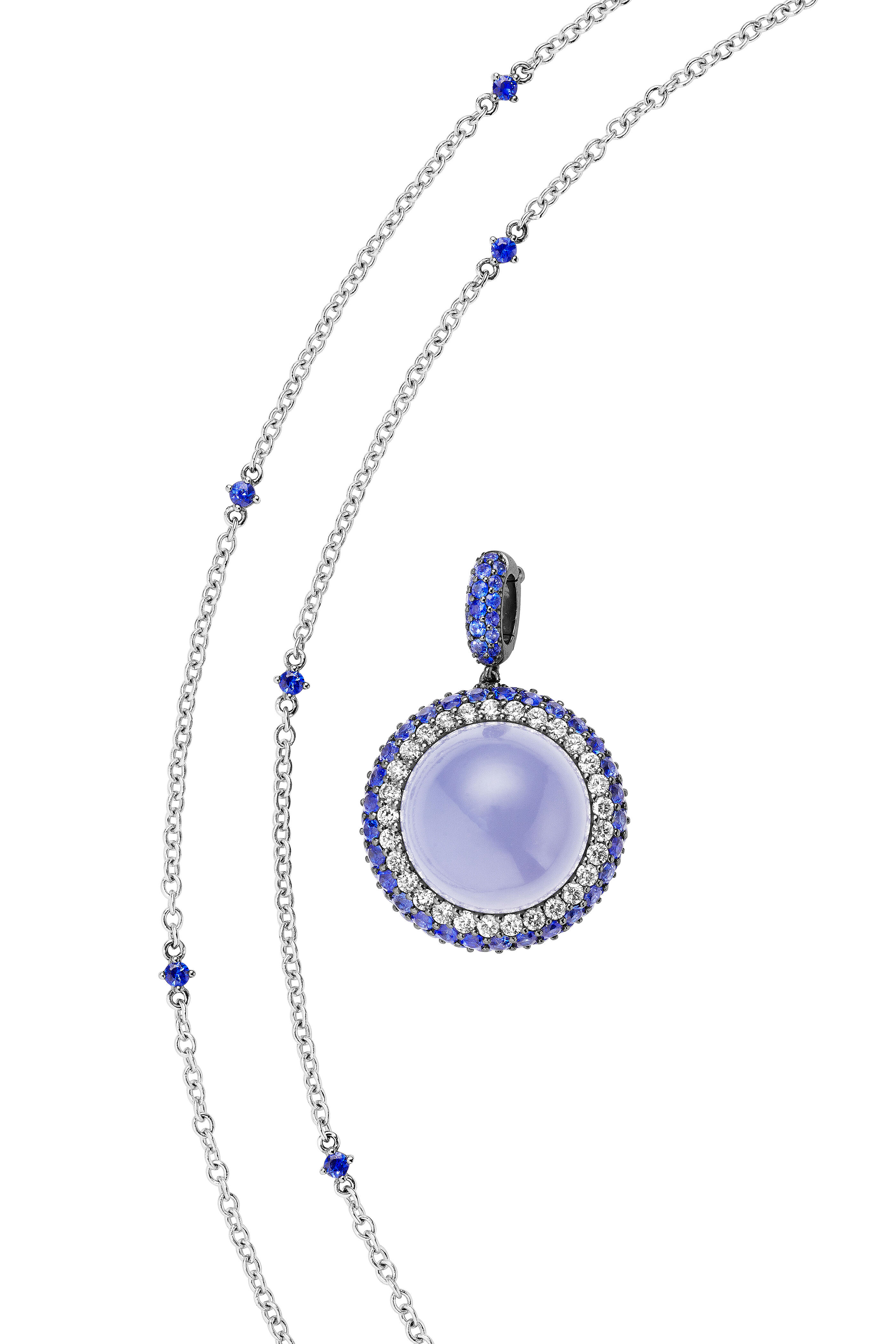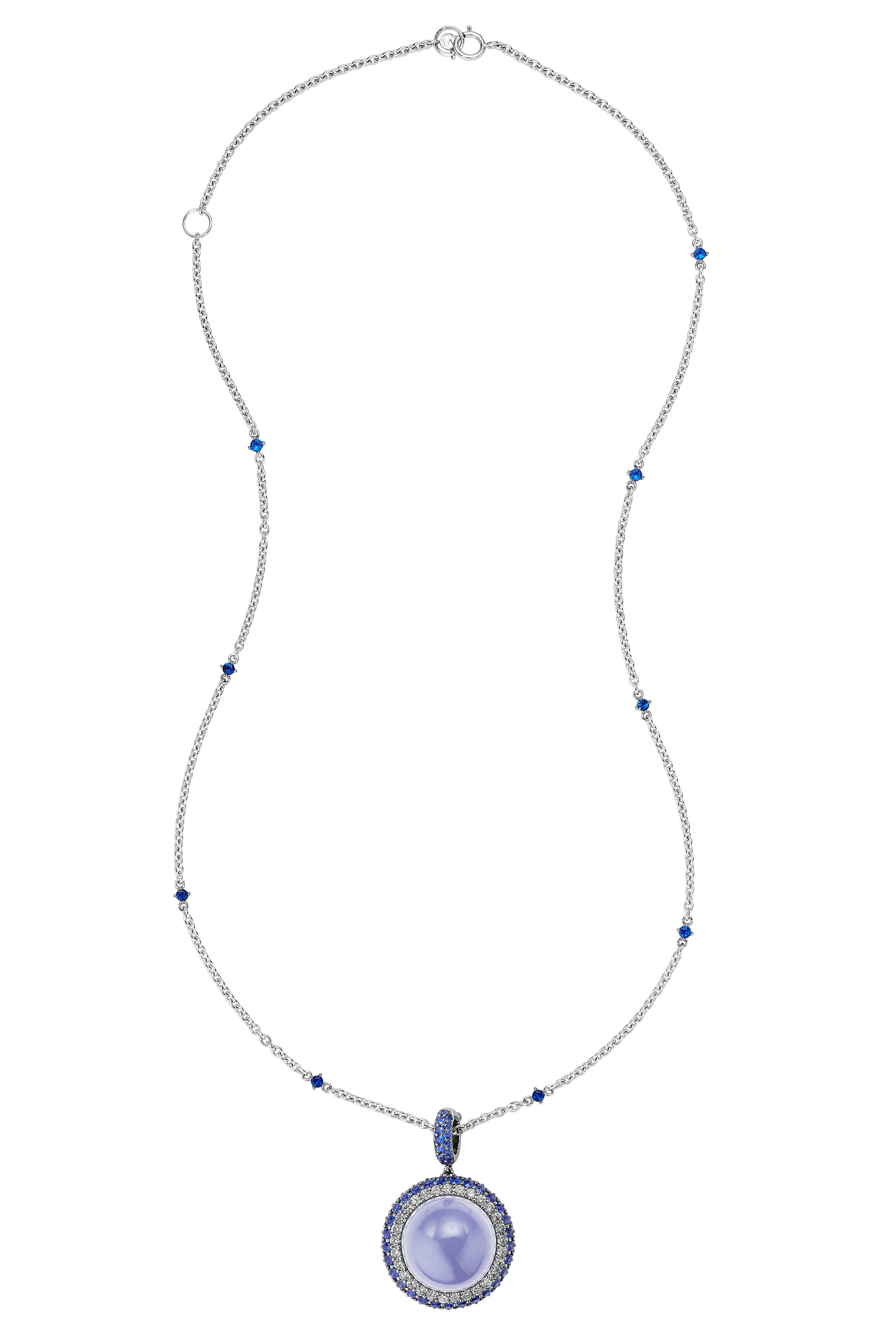 18k White Gold. 14.52 ct Chalcedony. 2.85 ct Blue Sapphire.