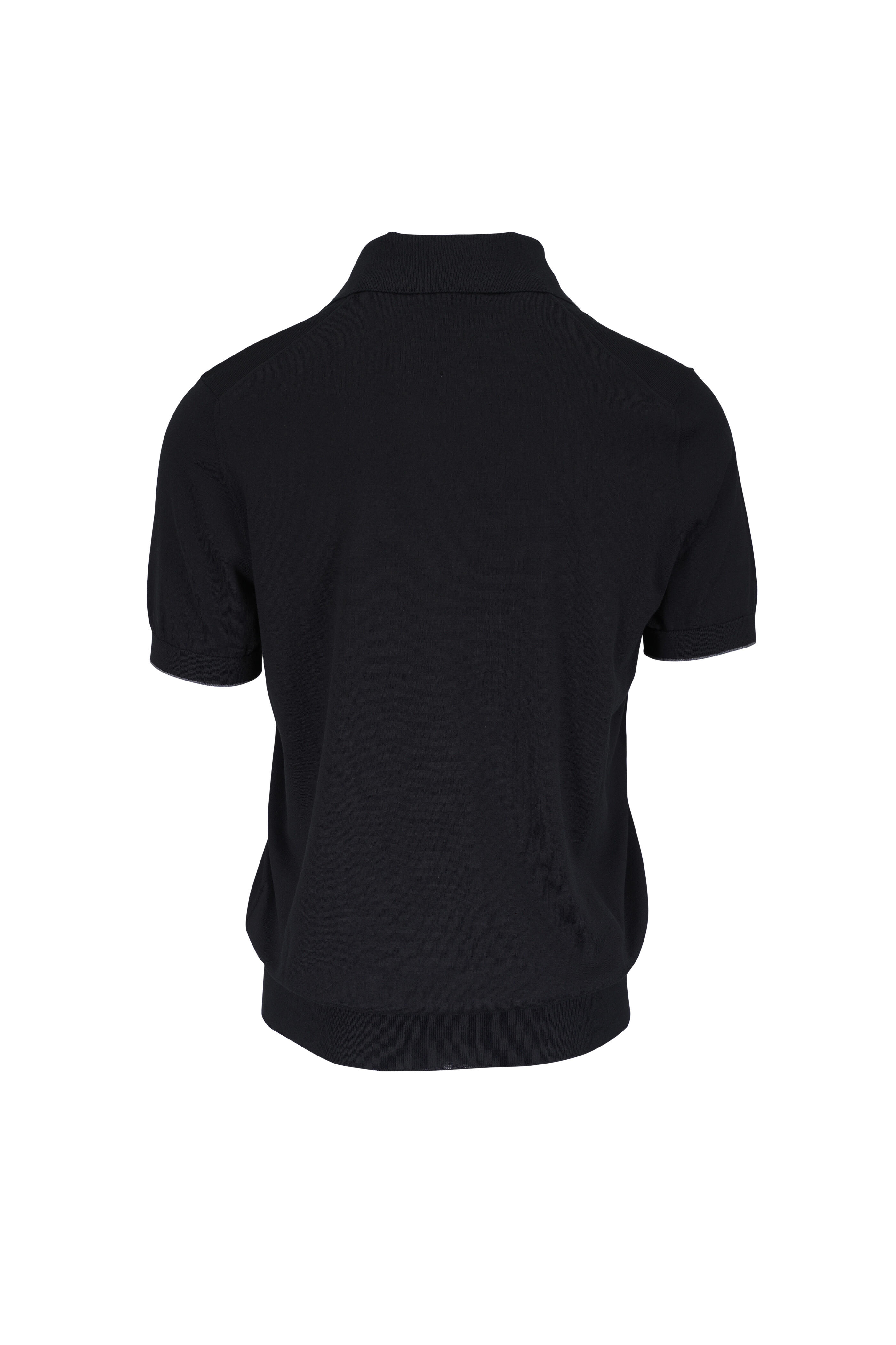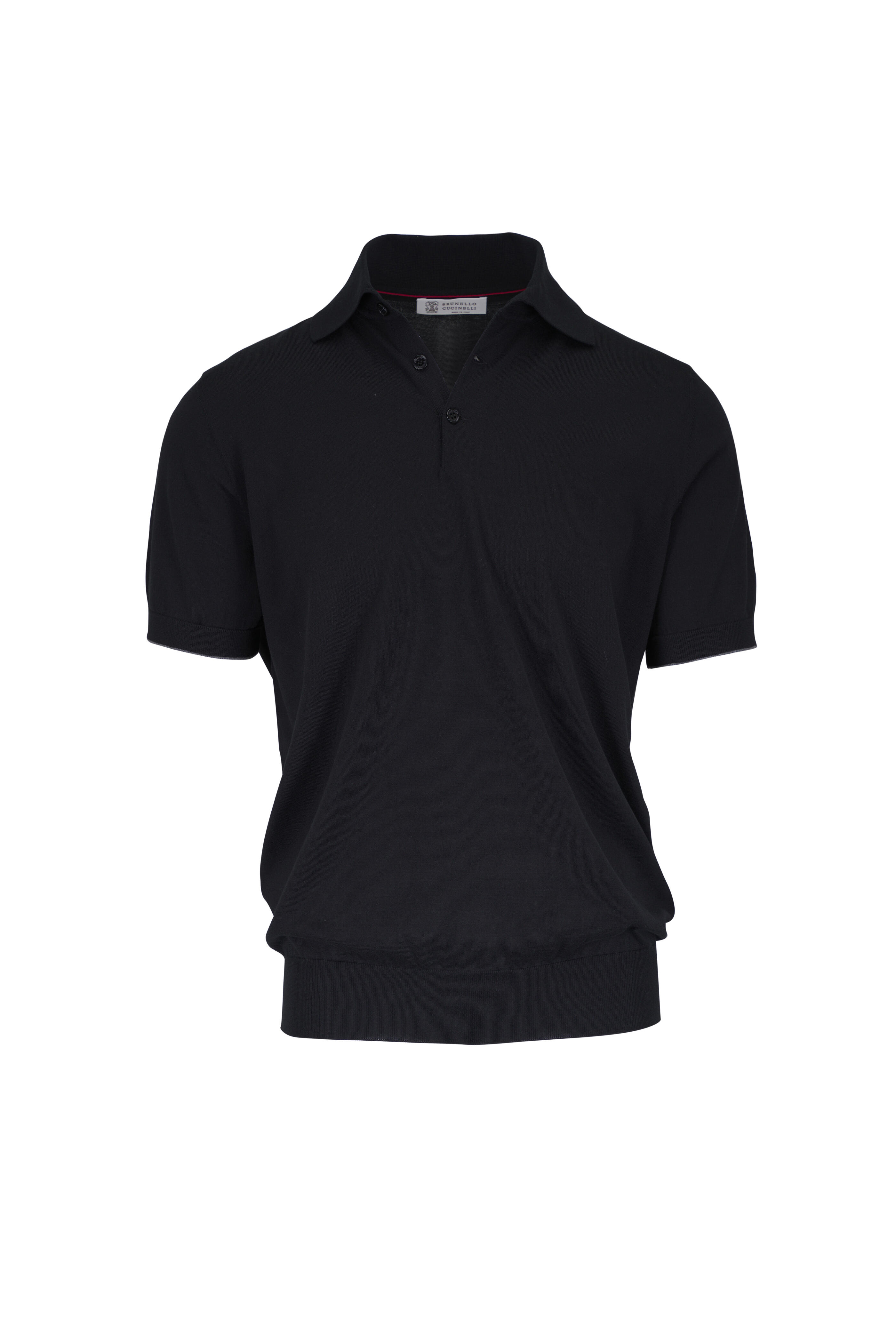 Spread collar. Three button placket. Ribbed trims. Made in Italy. 100% cotton. Dry clean.