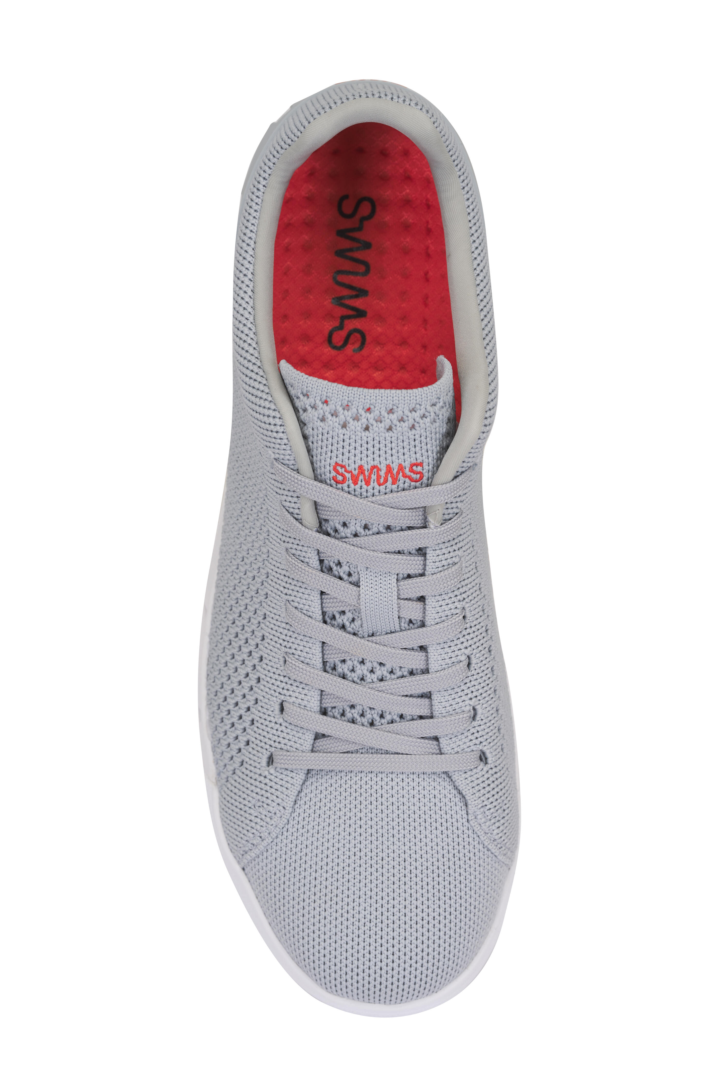 Knit upper. Round toe. Lace-up closure. Unlined, detachable cushioned insole. White rubber sole. Imported. Light, flexible, breathable, and durable.